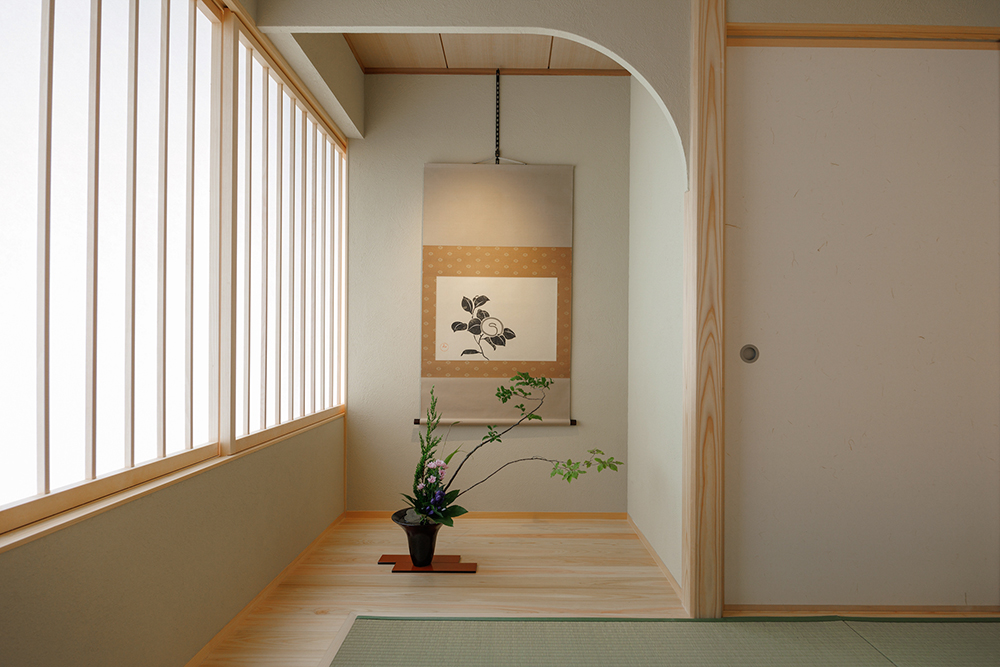 A Japanese-style semi-suite with a high-quality appearance reminiscent of a tearoom with a lowered ceiling. It is a room in a warm and new style that is set up in a quiet space with attention to natural materials such as soil, paper, wood, and stone.