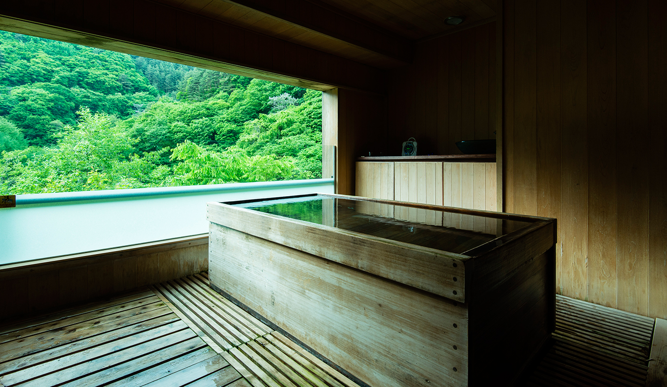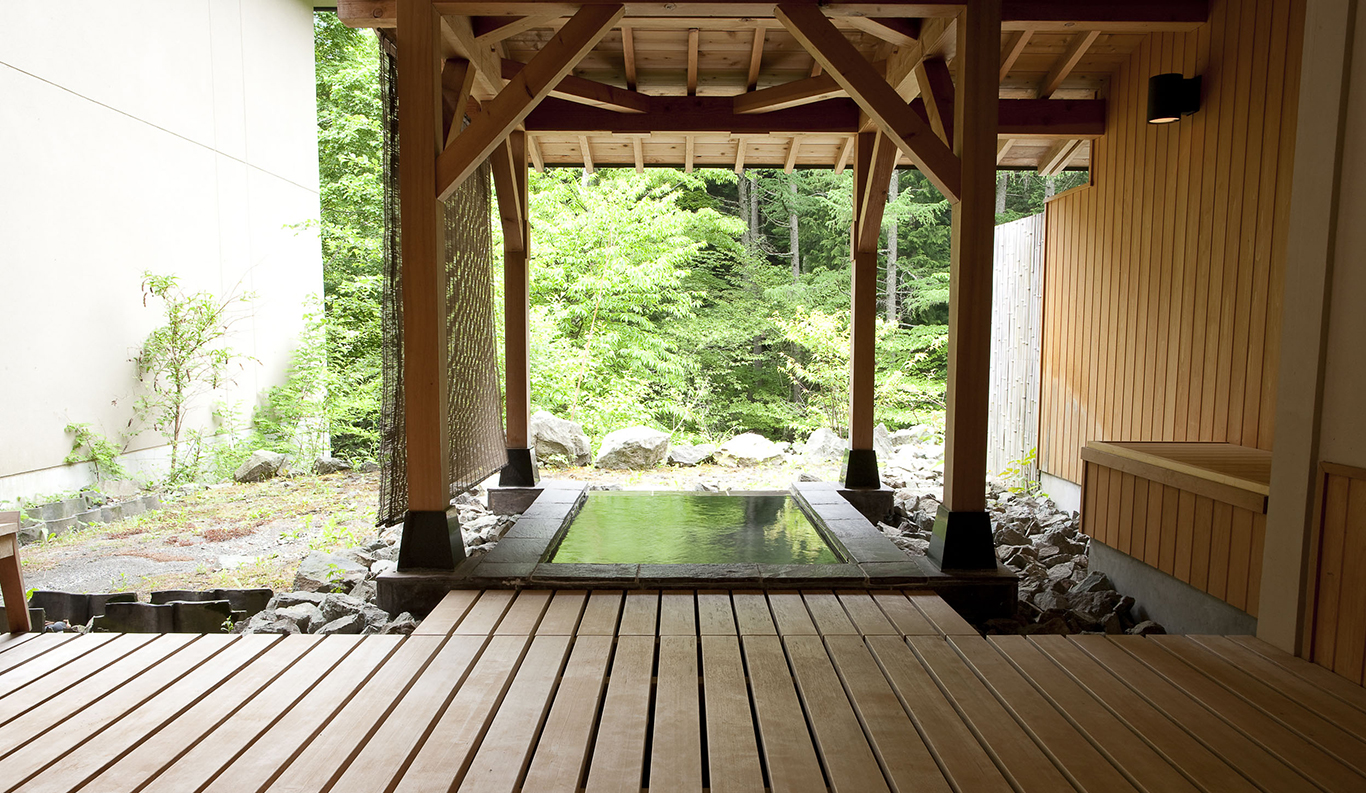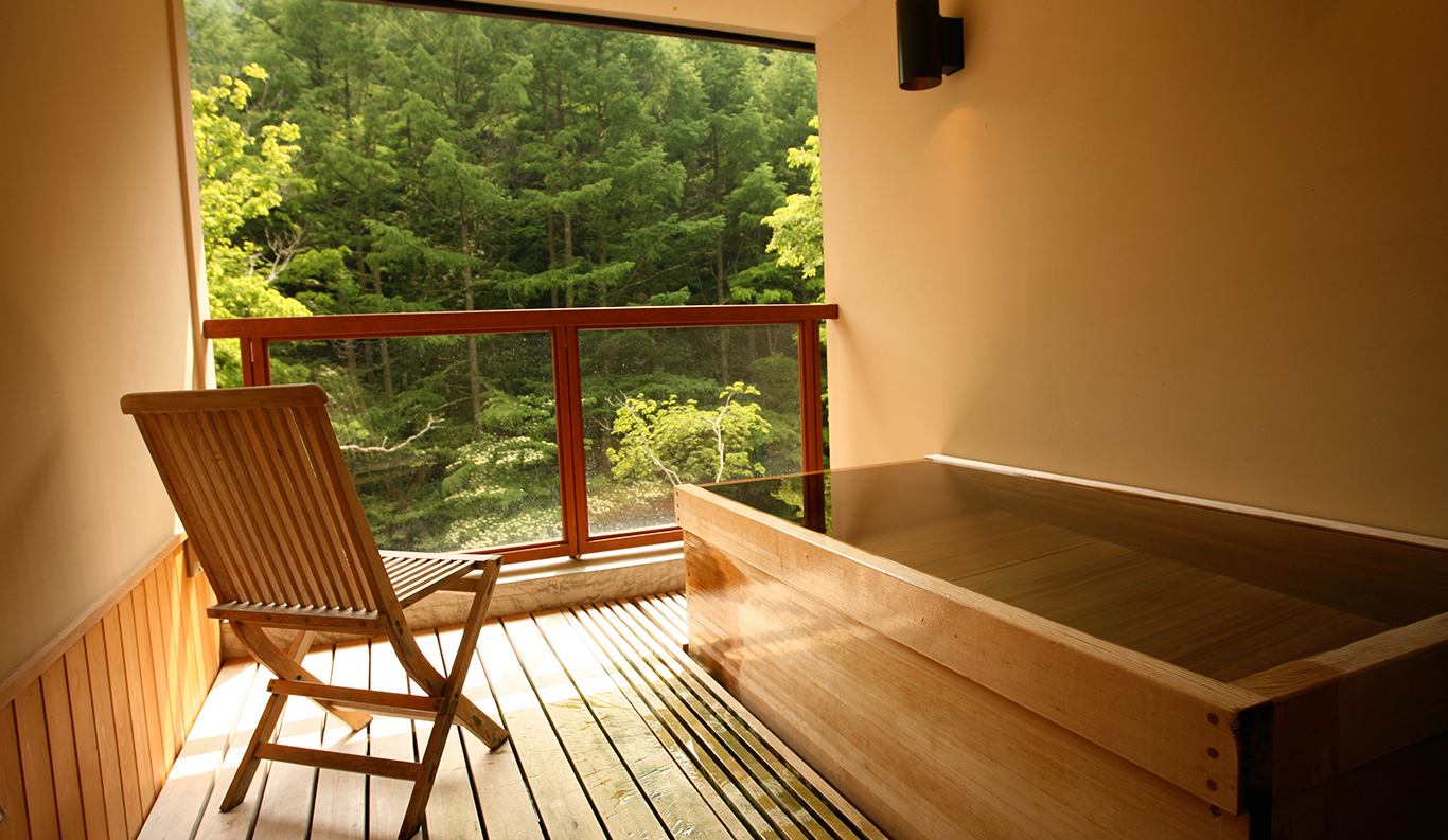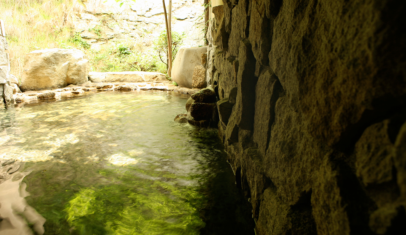 Public Bath Myojinkan's main bath includes a large indoor bath with walls of glass framing the deep green forest beyond, and an outdoor rotenburo with only the sound of the forest and water flowing over a rock fall. The crystal clear hot springs here are a warm 42 degrees Celsius, and are known for their soothing effects on the skin and rejuvenating effects on the body. A separate bath with lightly carbonated hot springs water softly cleanses the skin and enhances the body's natural detoxification process.