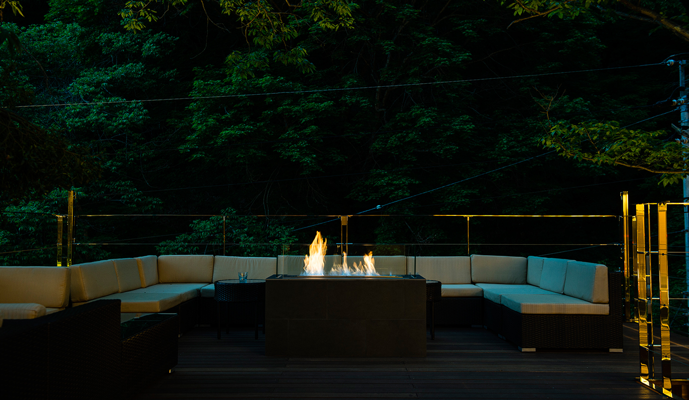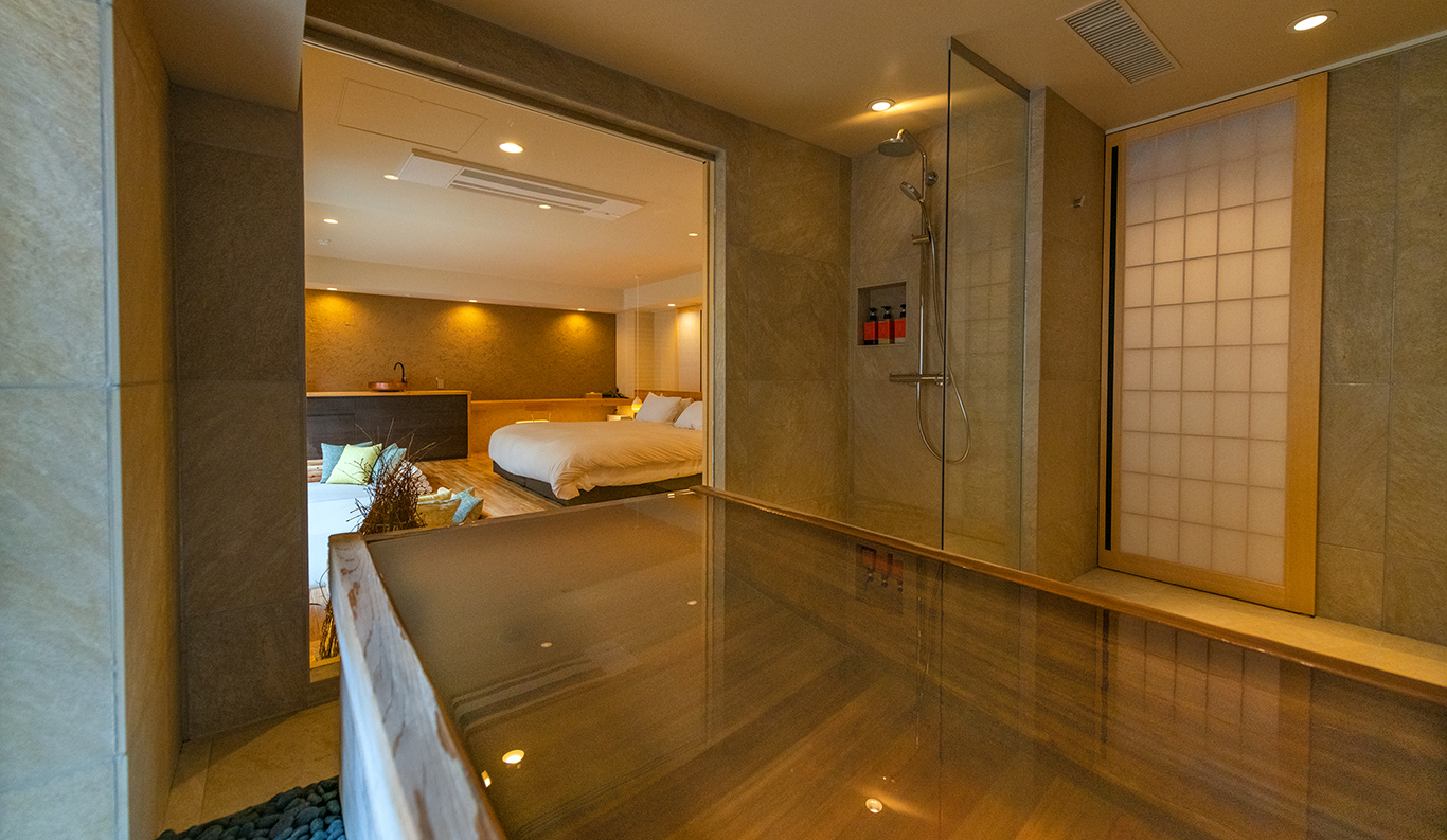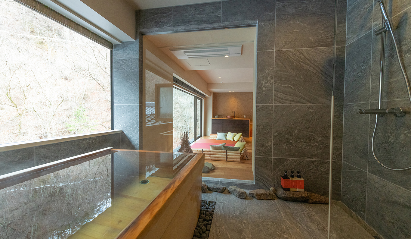1-4 70 sqm Indoor Bath Bed This room type is a luxurious room with extraordinary experiences. Zen Spa Living room has just been added in spring 2021, and its concept is relaxing in the living room with a bathtub. Once you walk into the room, stepping on a stone walkway, the world you see is no longer ordinary. A bathtub with one pipe in a modern simple living room breaks the mold and inspires your senses. This is the “luxury” Myojinkan creates and inspires the guests.