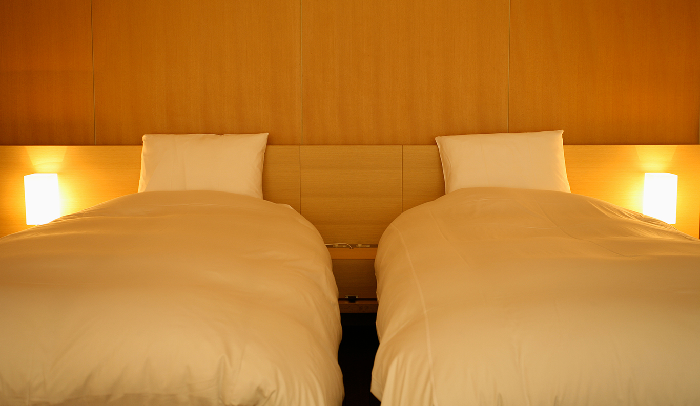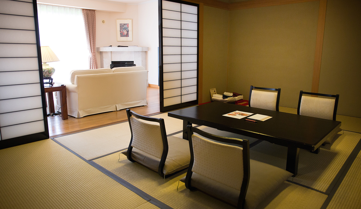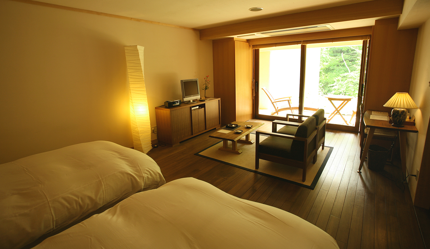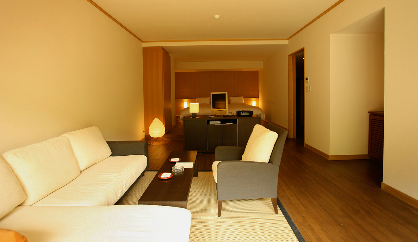 This room is Western-Japanese style, with two Sealy beds and a minibar in a separate tatami-floored room. A Hollywood twin is available upon request. The living room is equipped with chairs, a bathtub, a separate shower room, a sound system, a double vanity, a hairdryer, a large makeup mirror, bathrobes, slippers, and a separate toilet room. A TV and clock are not equipped in the room. Accommodates up to 2 people. Children are not allowed in this room type.
