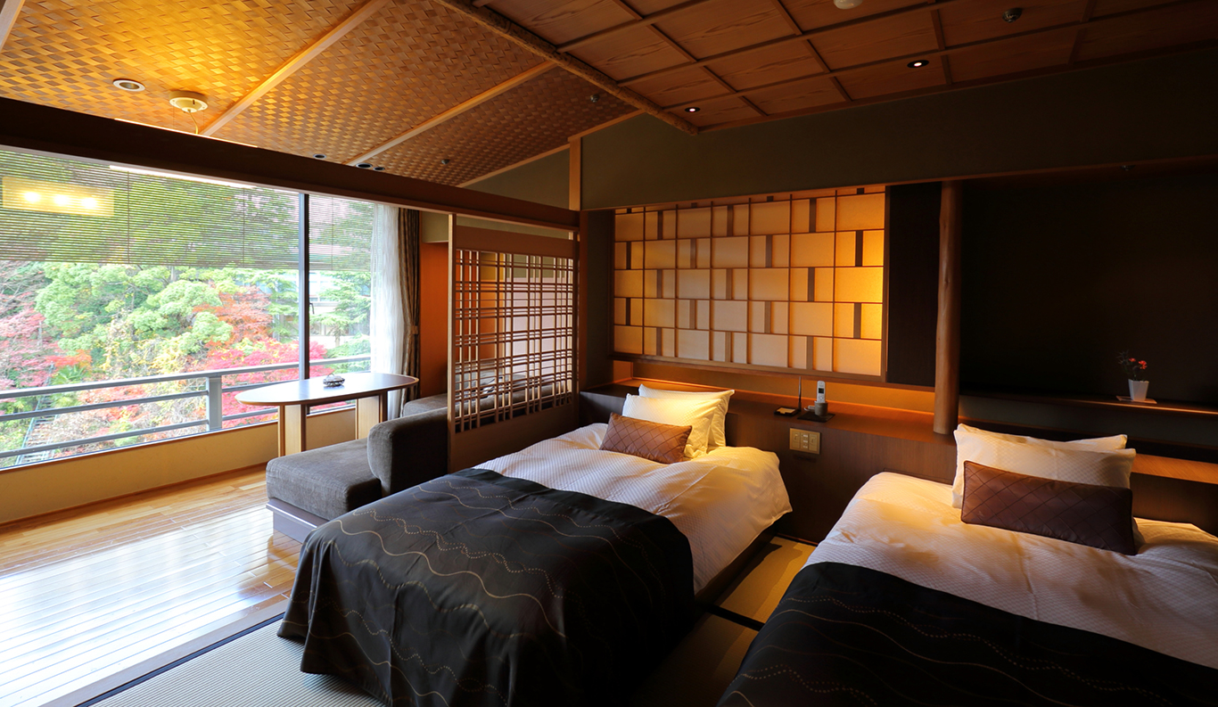 2-4 90 sqm Private Open-air Bath Futon This room is lovely and large, with a spacious 12-tatami-mat living/sleeping room and a comfortable sitting room with a view of the maple woods outside. It also has a big, beautiful rotemburo open-air bath. ¥ 47,670~ per person (based on double occupancy) *Room rates at the Ryokan vary depending on the season and booking status. Therefore, we provide an estimated amount as a reference. REQUEST THIS ROOM -