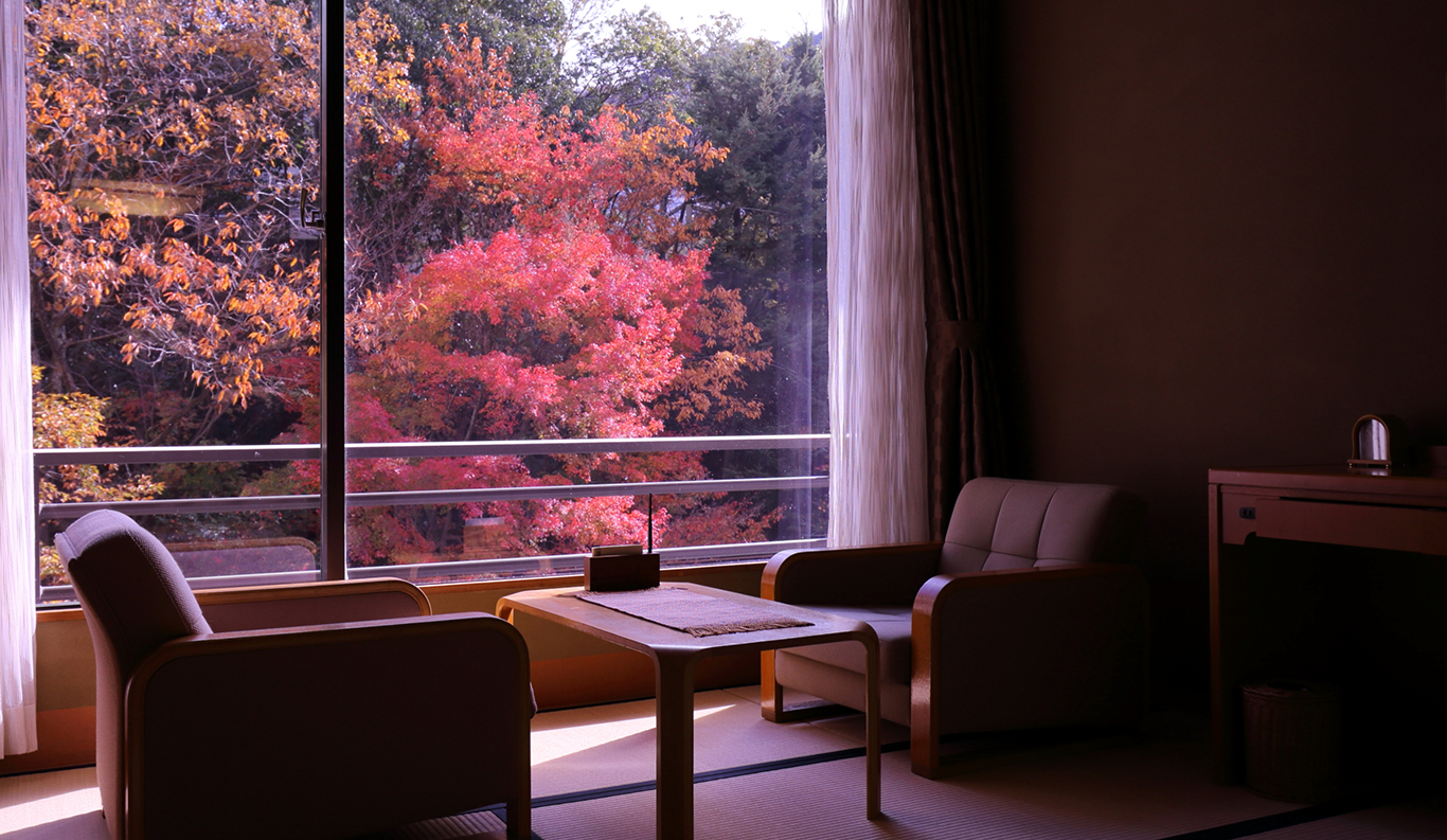 1- 40 sqm Indoor Bath Futon This is a smaller room, eight tatami mats in size, with sleeping space for up to three people. The big windows look out onto maple trees and the garden. Sleeping is on soft, comfortable futon, laid over tatami mats, and the room includes an indoor bath. ¥ 41,190~ per person (based on double occupancy) *Room rates at the Ryokan vary depending on the season and booking status. Therefore, we provide an estimated amount as a reference. REQUEST THIS ROOM
