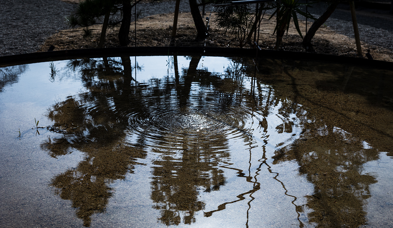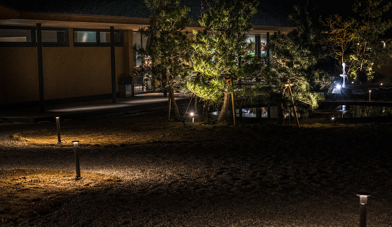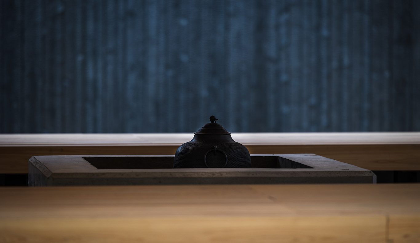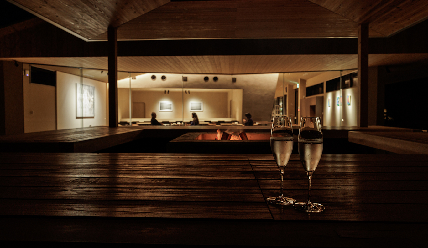 Muryoraku-an Firepit The joyful enchantment of gathering with others around a warm fire outdoors at night, sharing food and drink and swapping stories beneath the stars . . . these simple joys seem wired into our very DNA. Muryoraku-an, a custom-built firepit complete with a wrap-around cypress counter, cypress bench seating, and a roof, is just such a place at Roka. Situated between the guest suites and the restaurant and café wing on one axis, and the front and rear gardens on the other, it is an ideal place for visitors, residents, and artists to relax together for sundowners and cheer over the flickering flames. A hearth at the very heart of Roka, its name literally means “haven of immeasurable delights.”