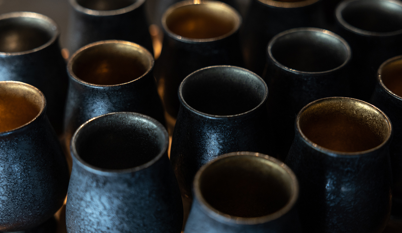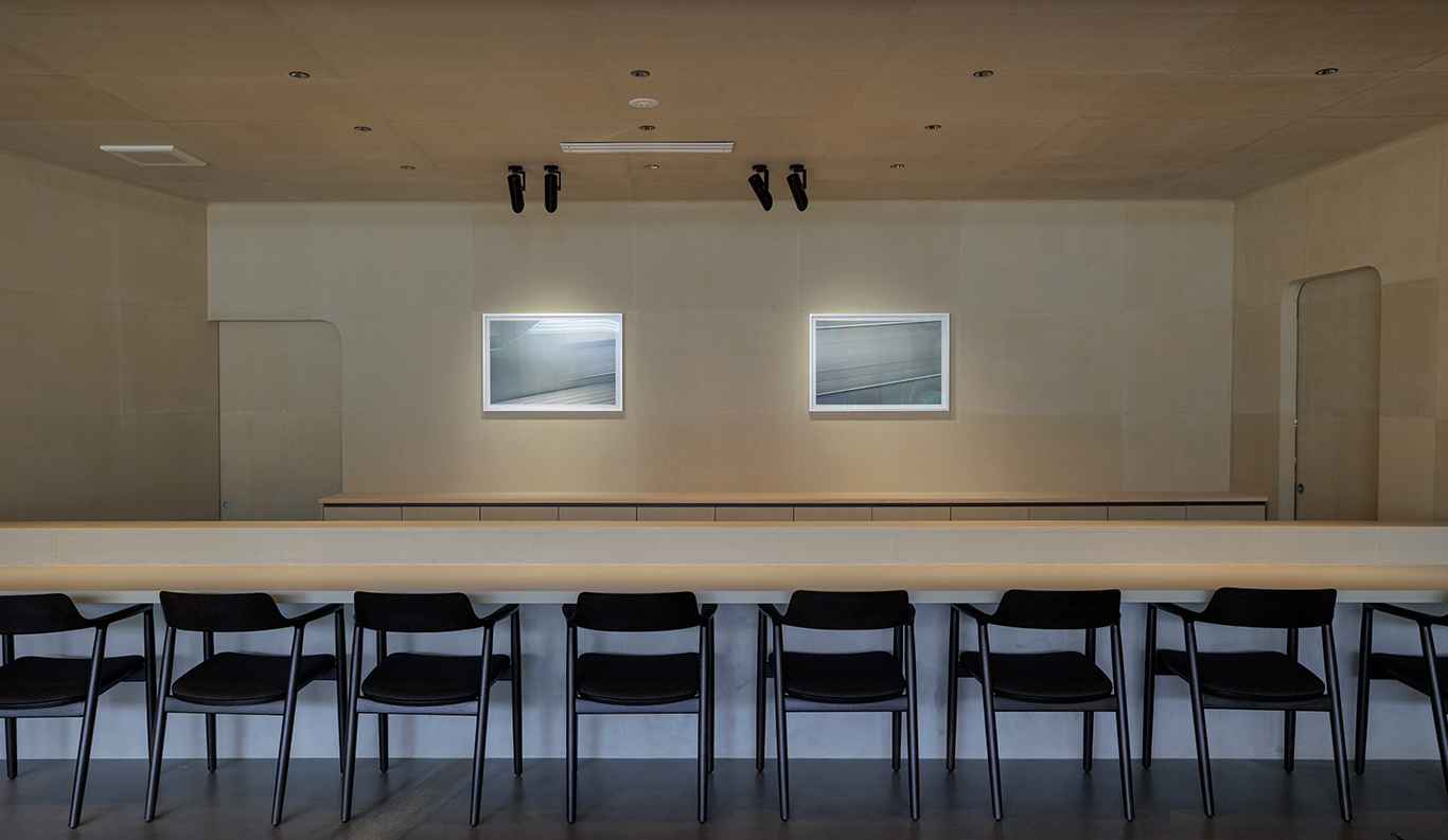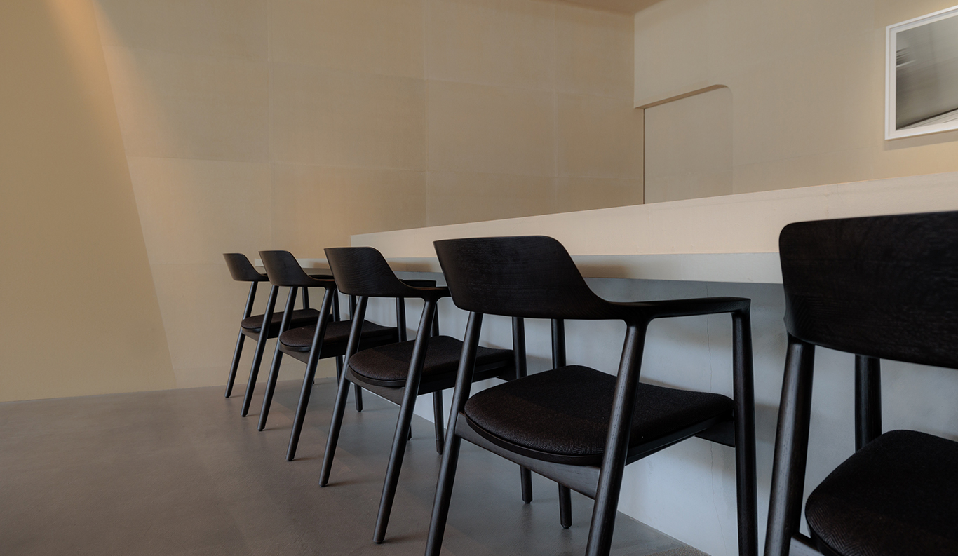 Colored in deep earth tones of greys, golds, and browns, Moya is built of natural materials. Traditional plasterer Akiyoshi Tanaka of Arashiyama in Kyoto hand-finished the walls in the same traditional troweling style used in temples, shrines, castles, and machiya townhouses from generations ago. The shop walls at back are covered in washi cloth made by the Kyoto-based paper craftsman Wataru Hatano, who dyed them a rich dark brown using kakishibu persimmon tannin. Three granite posts supporting the cypress counter were repurposed from an older building on Naoshima. A contemporary nihonga painting on a gold-leaf ground by artist Ryo Shinagawa anchors the far wall, bringing a dynamic pop of fresh color to the space. -