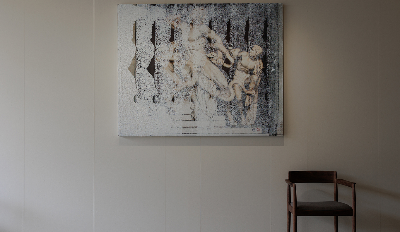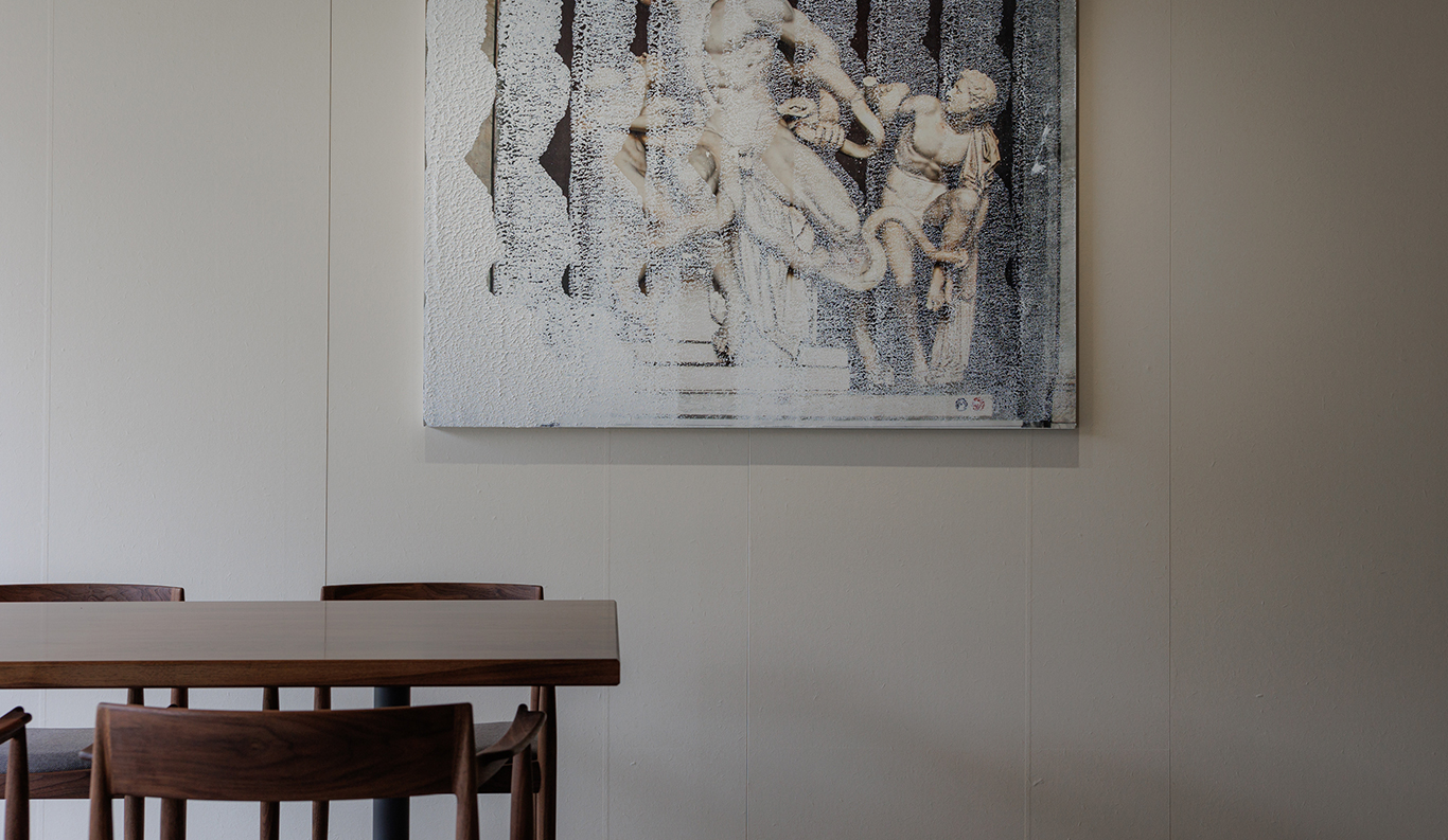 It, too, questions the parameters of painting: Yamamoto used a hand roller to overlay rhythmic patterns of calcite on his reproductions of Greek heroic myths. Behind the counter are two 2022 works from Nawa’s Moment Photography series, in which the sculptor draws on his longtime interest in photography to explore notions of representation and materiality. Finally, the entrance to each guest suite is adorned with a large pit-fired vase by potter Masafumi Shigeta (b. 1985). Roka owner Shintaro Sasaki fills them himself with flowers and plants he gathers from the surrounding hills; these arrangements can be enjoyed from the main corridor, like a mini-gallery of ikebana.