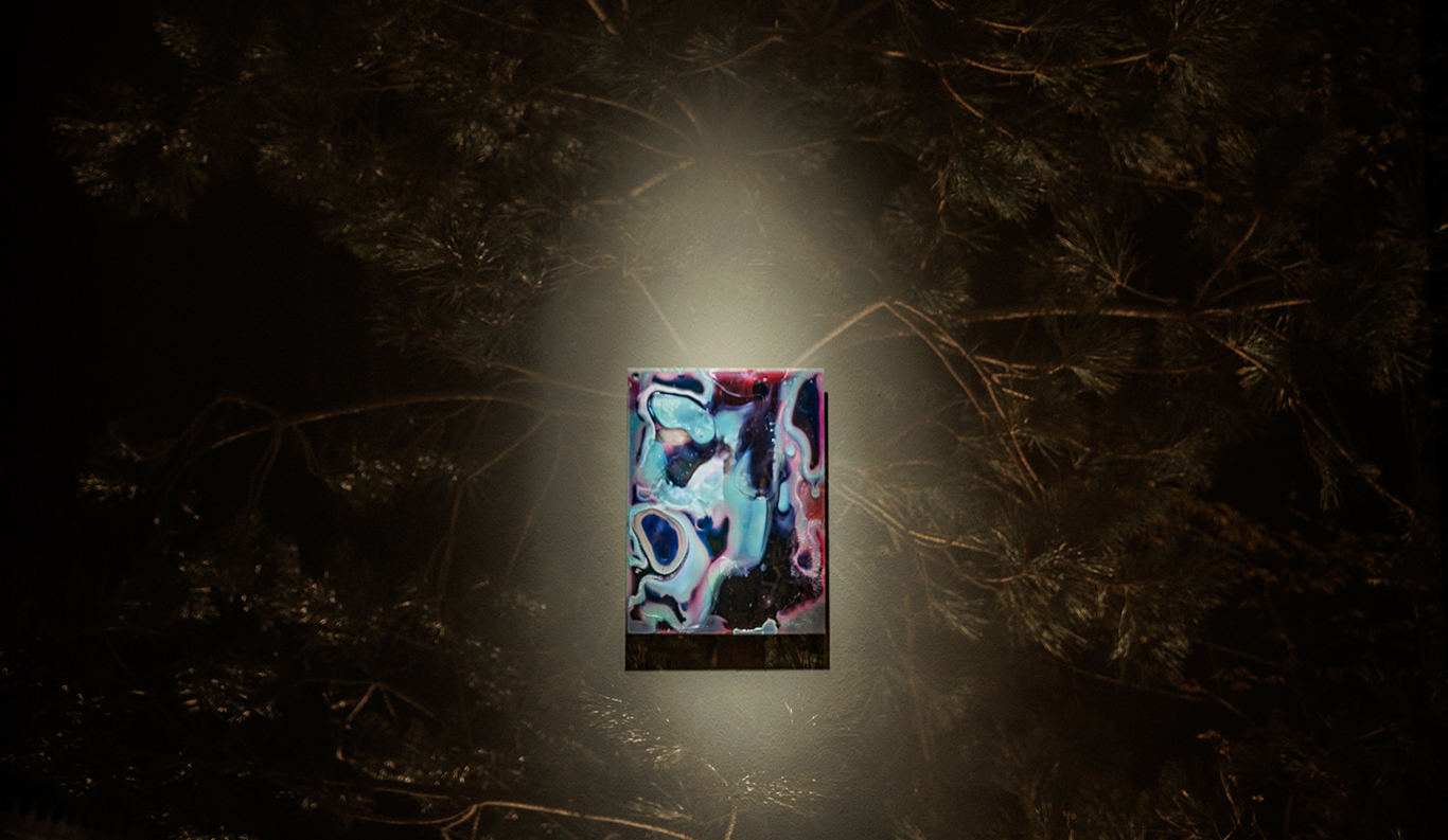 A painting by Ryo Shinagawa (b. 1987) anchors the far wall of the café-bar Moya, bringing a dynamic pop of fresh color to the interior of this space that functions as the de facto lobby. Its gold-leaf ground and theme of seasonal flowers and plants recalls the bird-and-flower paintings that embellished the sliding screens and walls of castle residences in the late sixteenth century. Adjacent to it is Alluvion (2021), a kaleidoscopic print by Daisuke Yokota (b. 1983). He exposed undeveloped film to light and a cocktail of chemicals to yield fissuring, bubbling polychromatic layers, which he then photographed.