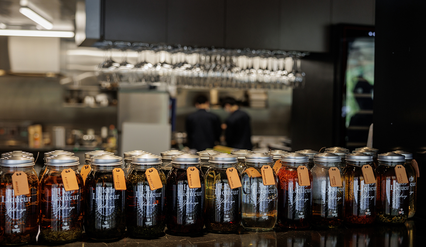 In addition to such usual suspects as lemongrass, peppermint, ginseng and rosehip, some of the more curious liqueurs include infusions of loquat leaf, desert broomrape, valerian, and seahorse, not to mention mamushi pit viper steeped in a liquor of wild ginseng. A range of coffee liqueurs is variously infused with lemon, mint, rose, and cinnamon. While the stock does vary according to season and demand, the knowledgeable team of herbal sommeliers at Moya and En are at the ready to recommend both sober and alcoholic drinks to meet your mood and condition, and the lunch and dinner menus offer omakase flights of these healthful infusions, primed to the season.