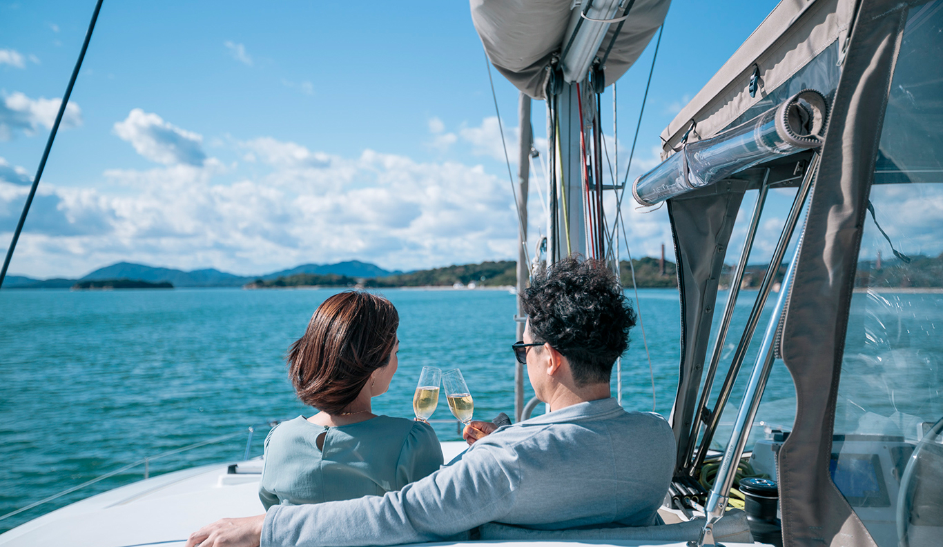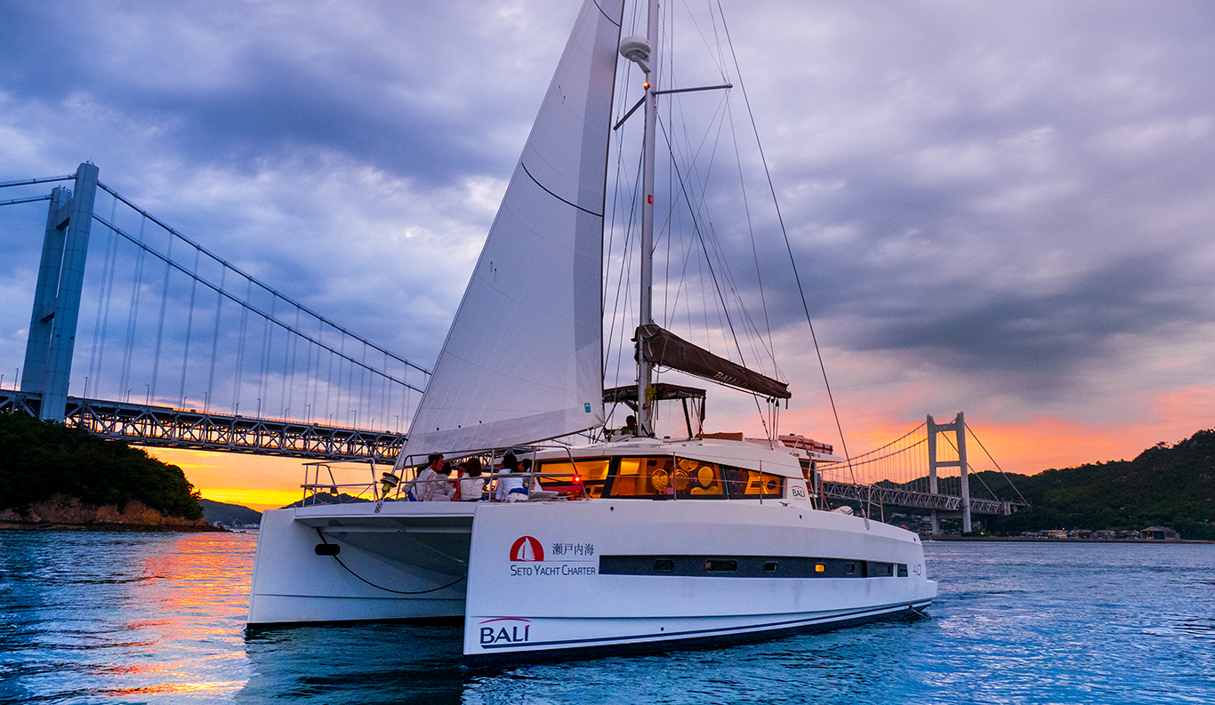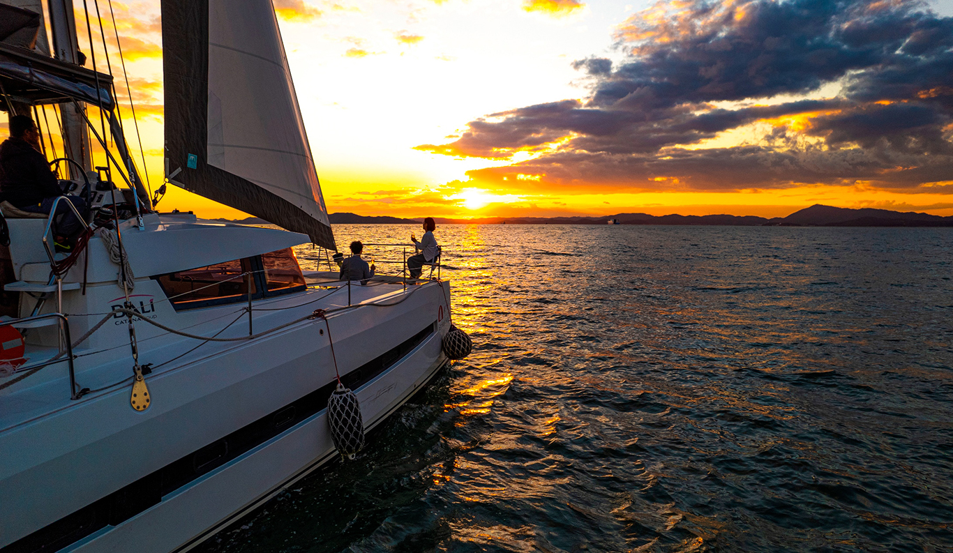 Sunset Cocktail Cruise You can rent a luxury catamaran yacht where you can stay and enjoy a cruise on the Seto Inland Sea. The 360-degree view of “Tajima-bi” from the luxurious yacht is breathtaking. Enjoy a meal on board like a small resort hotel or enjoy your drink while feeling the sea breeze on the deck of the bow. The sunset cruise, where you can enjoy the dynamic Seto Ohashi Bridge, and the red ocean sunset, will surely be a gorgeous experience for you.