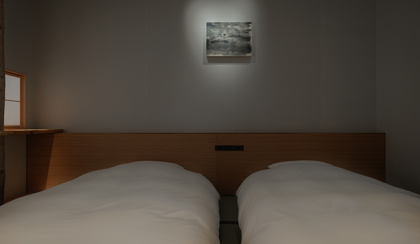 From the entrance of the suite, the earthen wall gives way to softly textured wallcoverings of shifu paper cloth handwoven by Tosa Washi of Shikoku. Futon-style bedding and tatami-mat relaxation spaces with low-slung furniture and indirect lighting are still further visual reminders of the contemporary Japanese aesthetic, while a deep inhale of the clean natural scents of tatami mats and cypress wood, and perhaps even the saline tinge of the island air outside on the balcony, add to the sense of place. The original artwork on the wall, commissioned by Roka and part of the inn’s rotating purchasable gallery of original works by emerging artists, speaks expressly to the spirit of art-island Naoshima.
