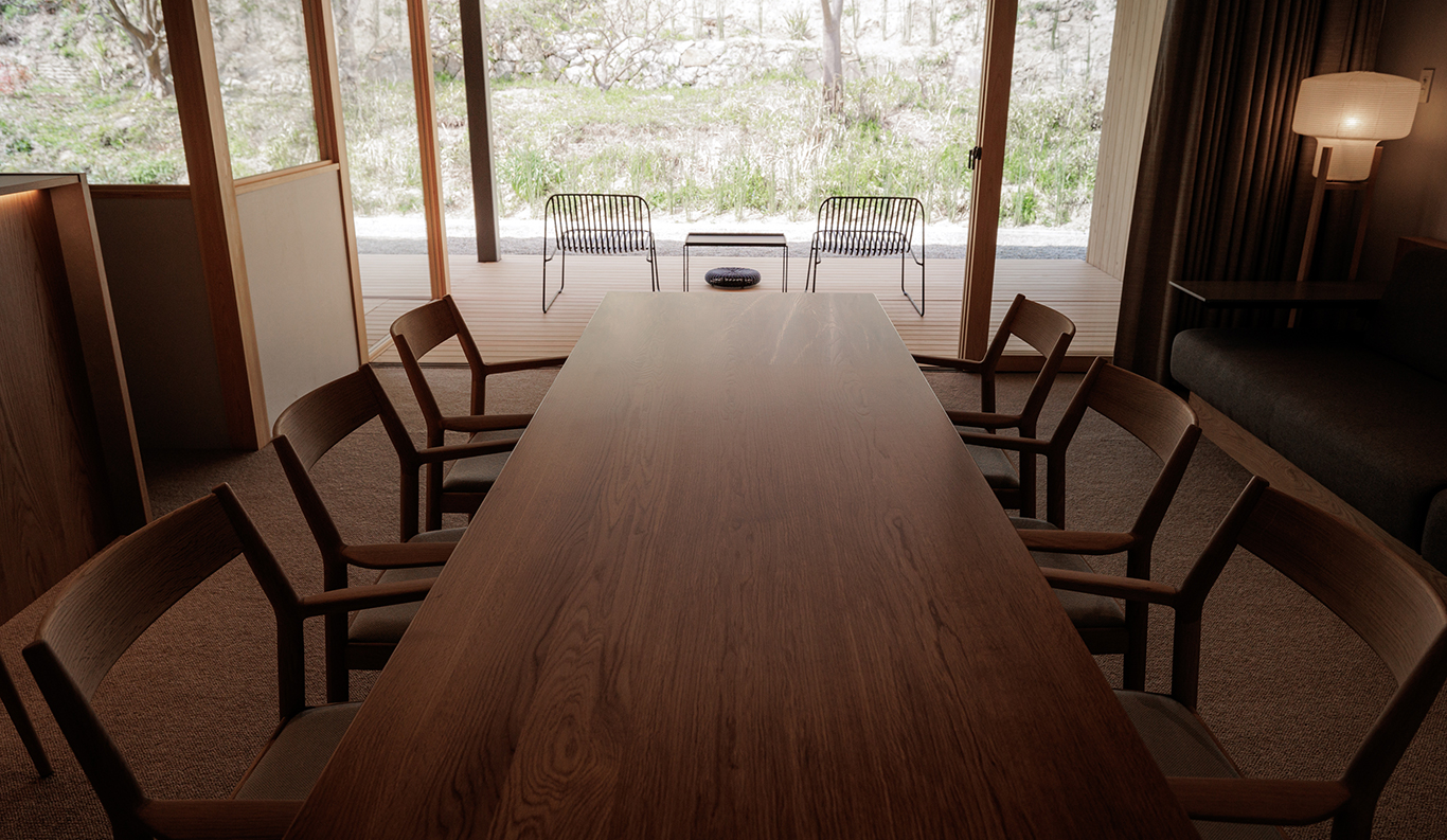 The all-natural body-care products include olive-oil soap by the Okayama-based Okada, specialists in additive-free, plant-based formulas, and the Yo line of professional salon products. These, too, are formulated with organic botanicals: a jojoba-seed hair conditioner and a delicately fragranced shampoo and body soap formulated with sage leaf and angelica root. After your bath, slip into the yukata robe and don a pair of the elegant leather-soled black sandals handmade in Nara by Yamato Kobo before wandering over to the firepit and restaurant wing for drinks or a relaxed and informal meal. Ask *Room rates at the Ryokan vary depending on the season and booking status. Therefore, we provide an estimated amount as a reference. REQUEST THIS ROOM