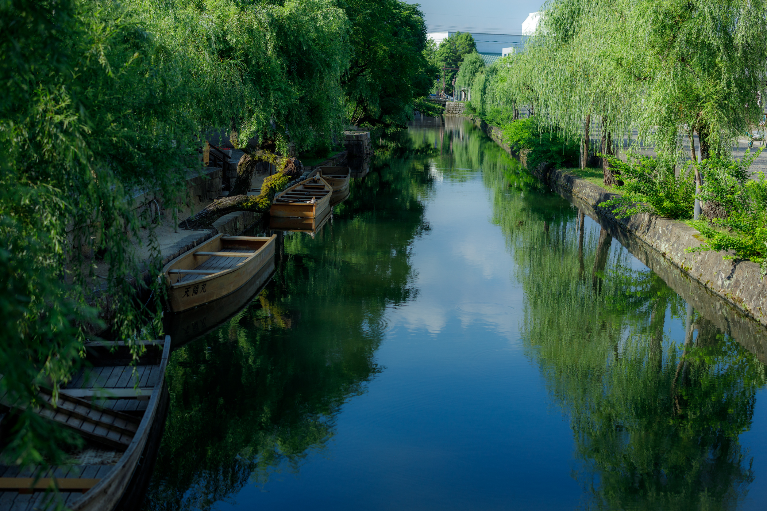 Overlooking the Nakabashi Bridge at the center of the Bikan Historical Quarter, by the banks of a pr