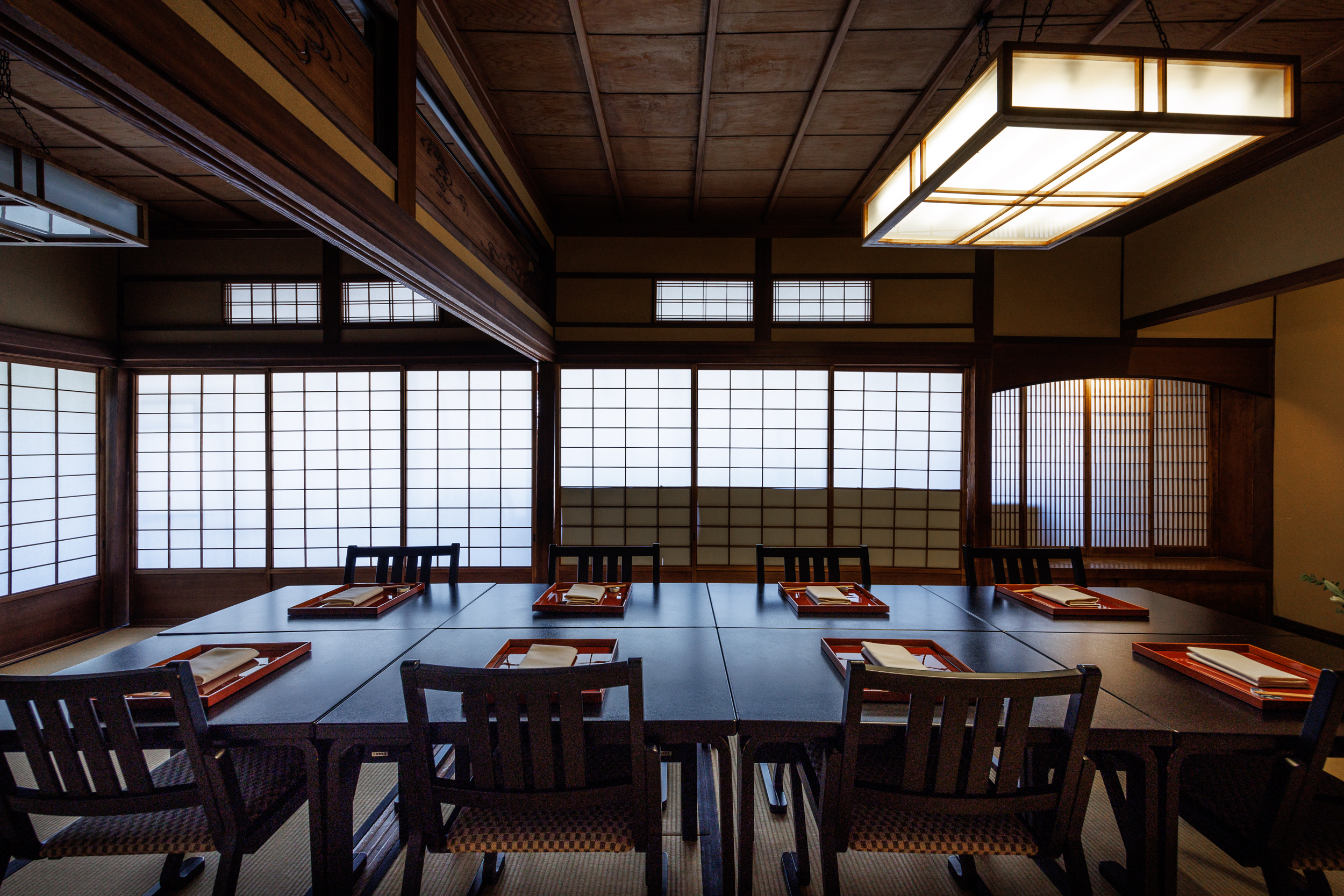 Private Dining Ryokan Kurashiki has five private dining rooms, which can serve two to twelve guests. Two of them are on the second floor overlooking the beautiful Nakabashi bridge and tree-lined canal below. The largest room of them, which has traditional Japanese-style tatami flooring, can also be furnished with tables and chairs, if the diners prefer. Either way, it is a perfect way to enjoy the ryokan's exquisite traditional Japanese haute cuisine.
