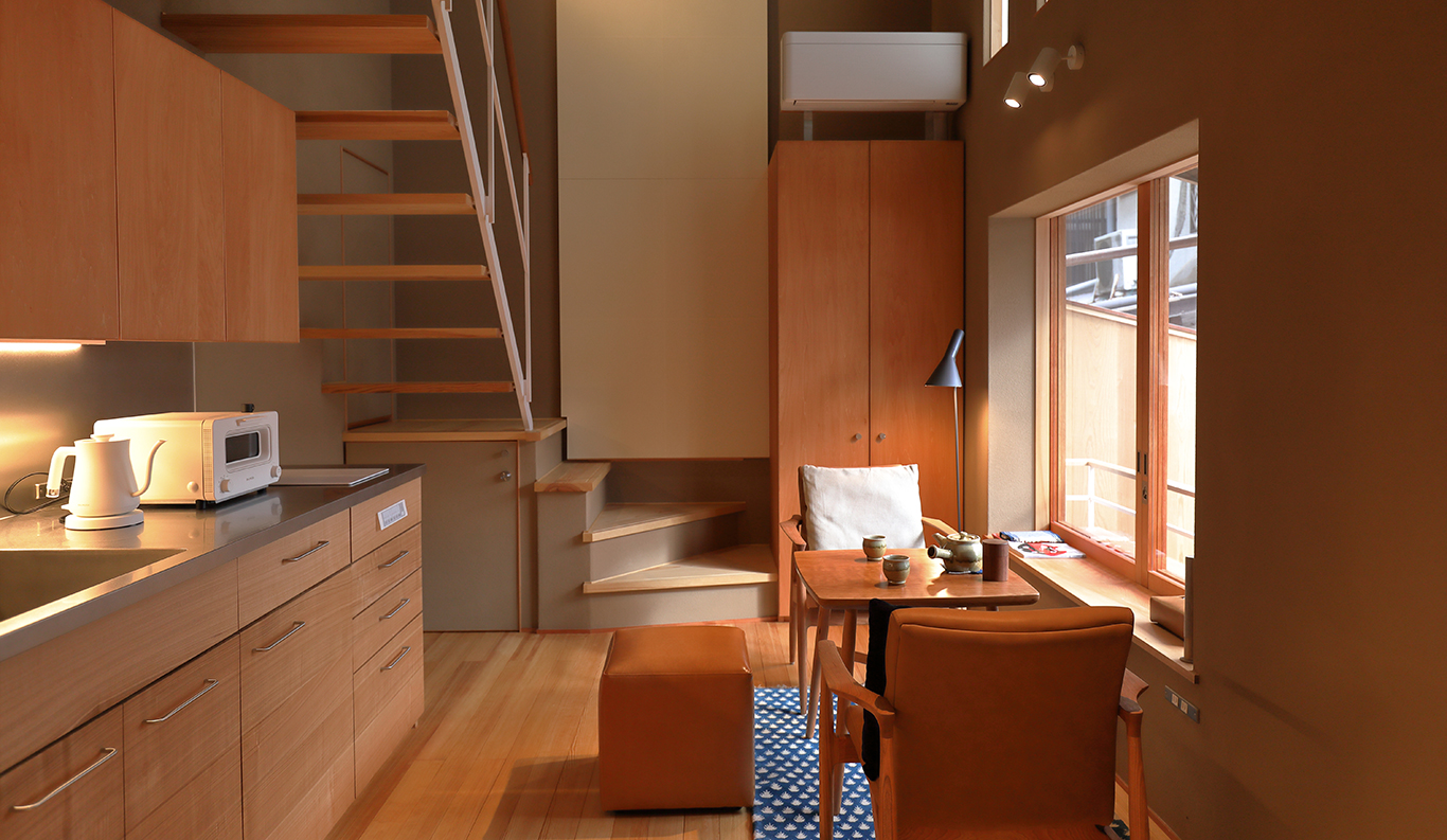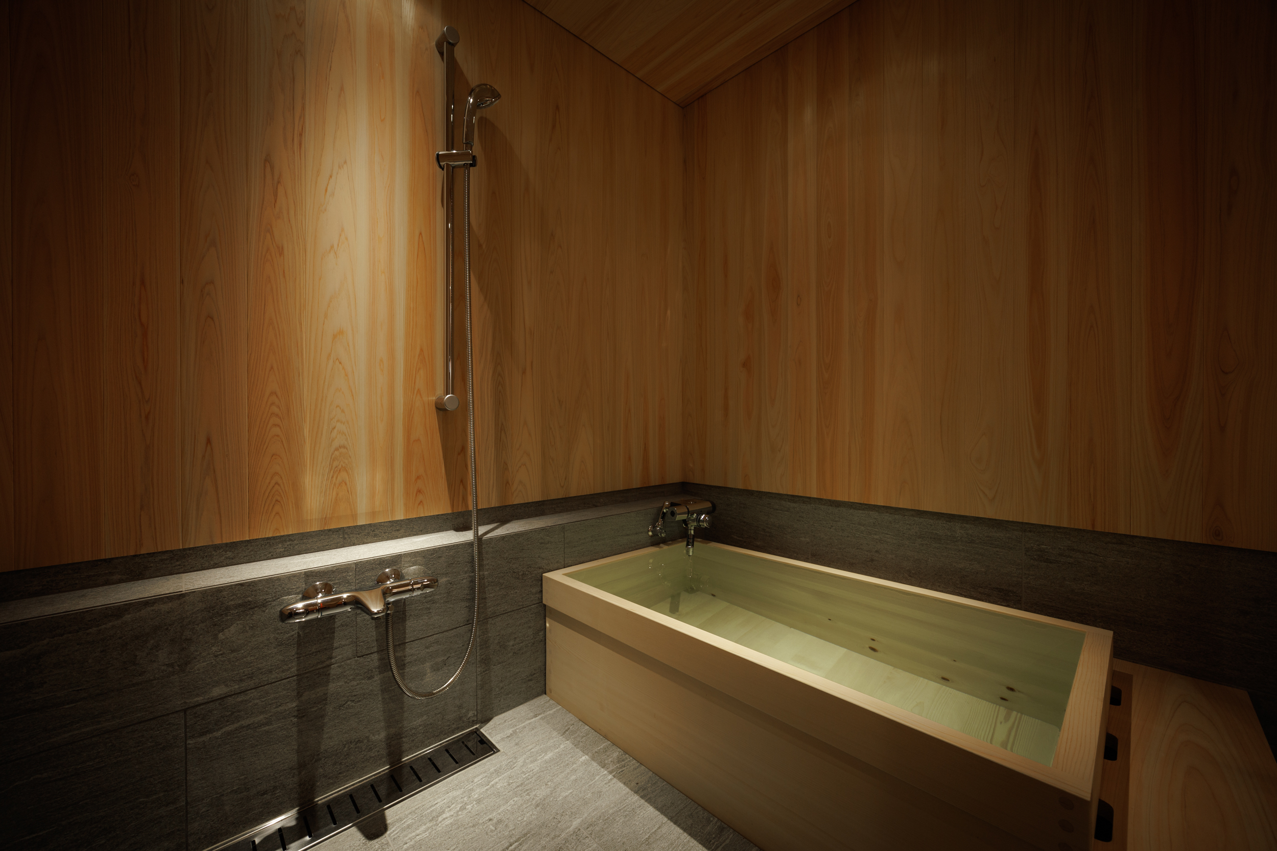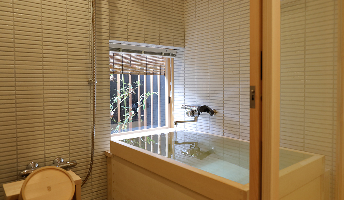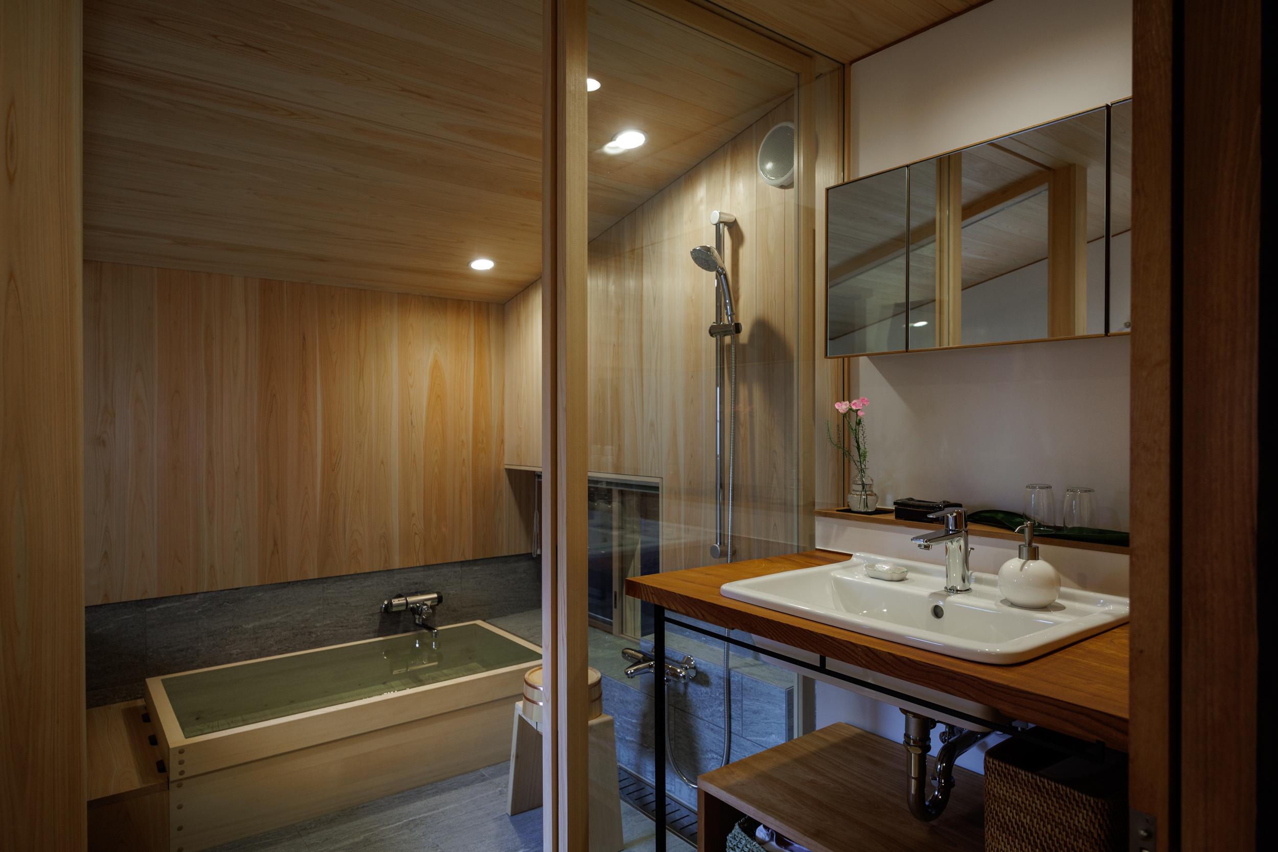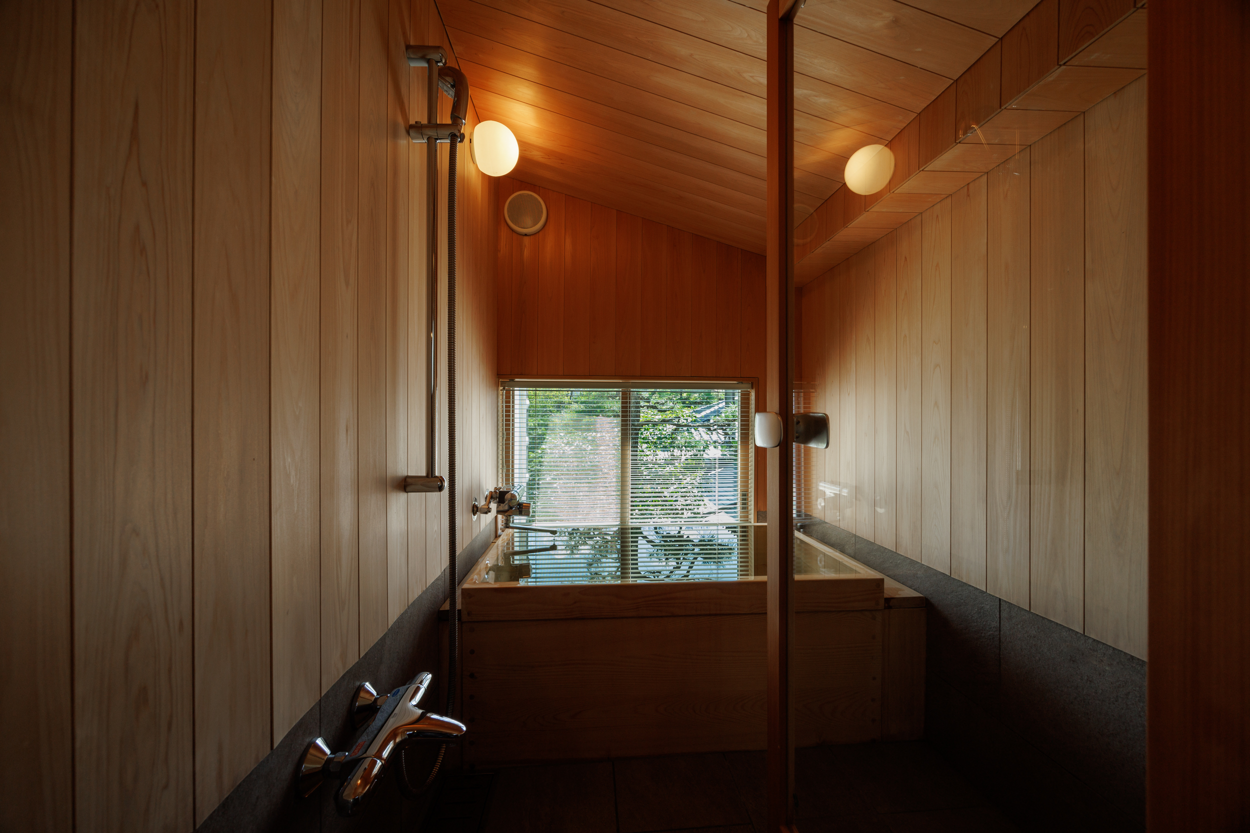 Hanare is the outbuilding of Omoya, which accommodates up to 2 guests. The house has a wooden-floored room and a kitchen, a bathroom on the first floor, and a bedroom with a study desk on the second floor. A wooden-floored room with a kitchen is equipped with a refrigerator, a countertop induction burner, a microwave, a toaster oven, a hot water dispenser, kitchenware, and tableware. The bedroom on the second floor is equipped with a TV and an air purifier. The refreshing koyamaki bathtub made with Japanese umbrella pine will reset your mind every day of your stay. ¥ 55,000~ per person (based on double occupancy) *Room rates at the Ryokan vary depending on the season and booking status. Therefore, we provide an estimated amount as a reference. REQUEST THIS ROOM