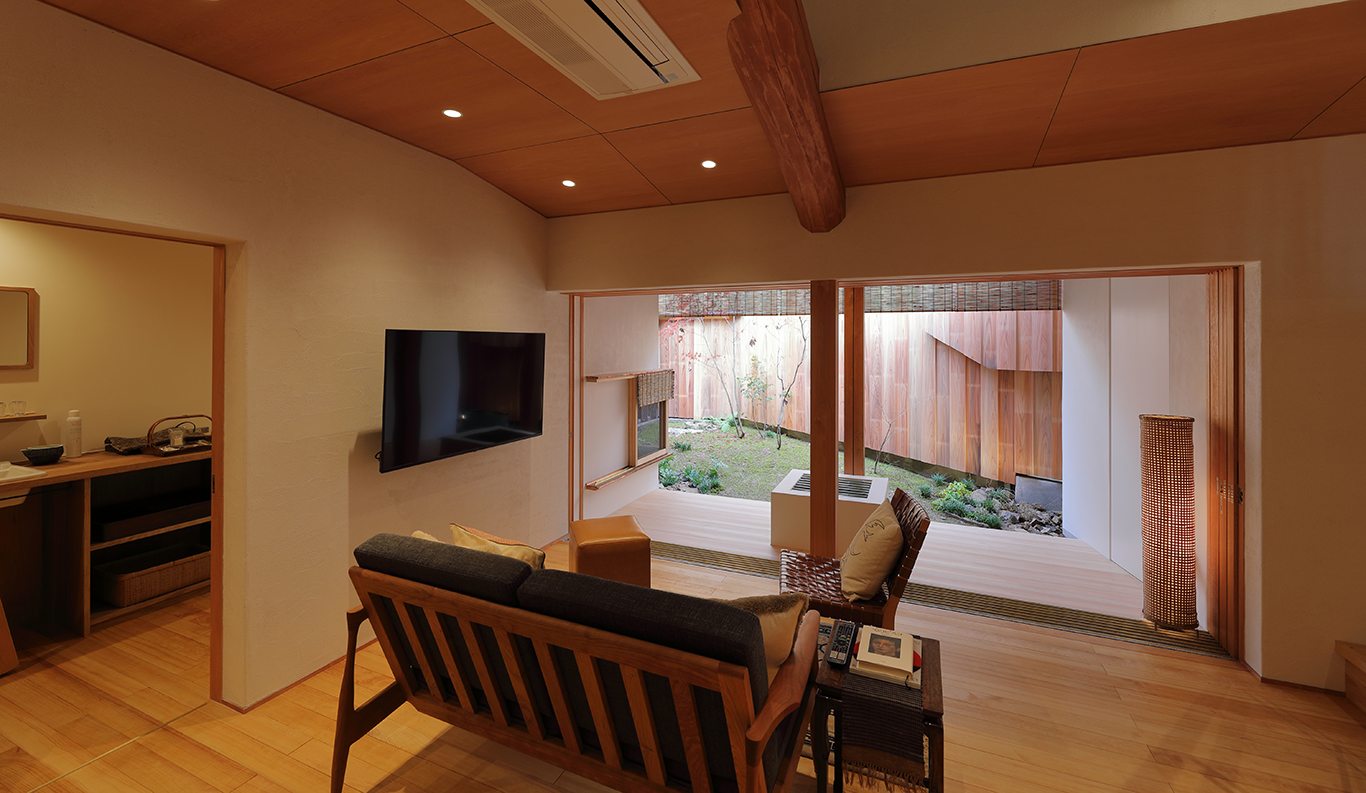 1-4 64.4 sqm Indoor Bath Bed This room is characterized by its depth, from the entrance to the Western bedroom, to the courtyard, to the Japanese-style room, and between the wooden boards. A built-in sofa is installed between the boards to create a relaxing space. There are also two courtyards, so you can enjoy the greenery from every room. ¥ 49,500~ per person (based on double occupancy) *Room rates at the Ryokan vary depending on the season and booking status. Therefore, we provide an estimated amount as a reference. REQUEST THIS ROOM -