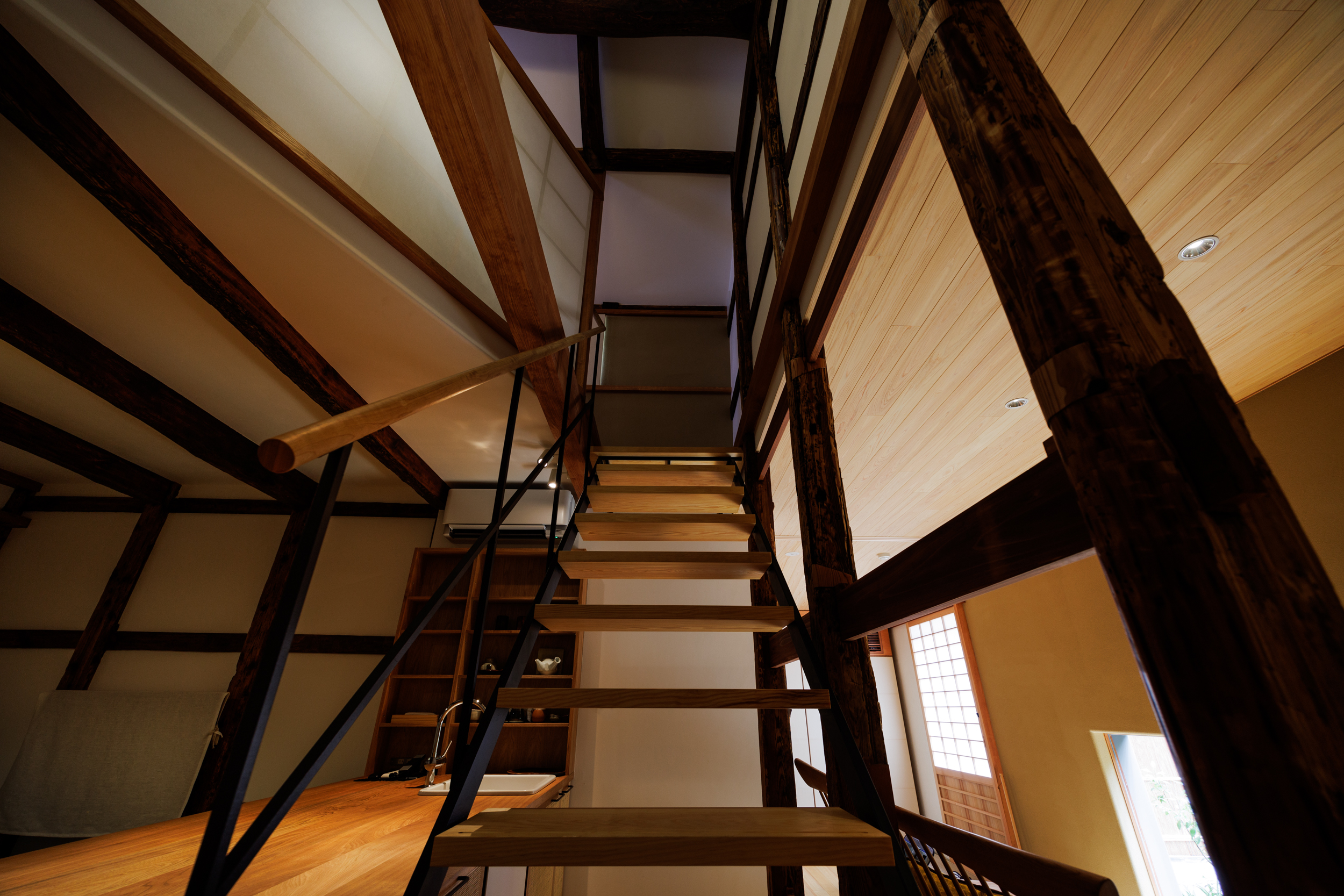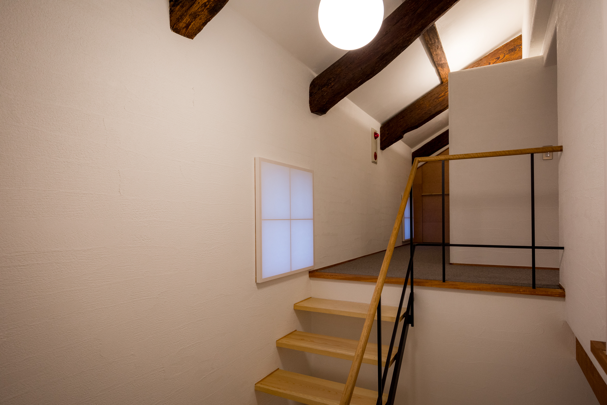 1-4 72.8 sqm Indoor Bath Bed This room boasts a unique design that makes it one of the most popular at Ryokan Kurashiki. The entrance is kura style, with the distinctive black tiles and white piping, and opens onto a set of stairs that leads upstairs, under the eaves.