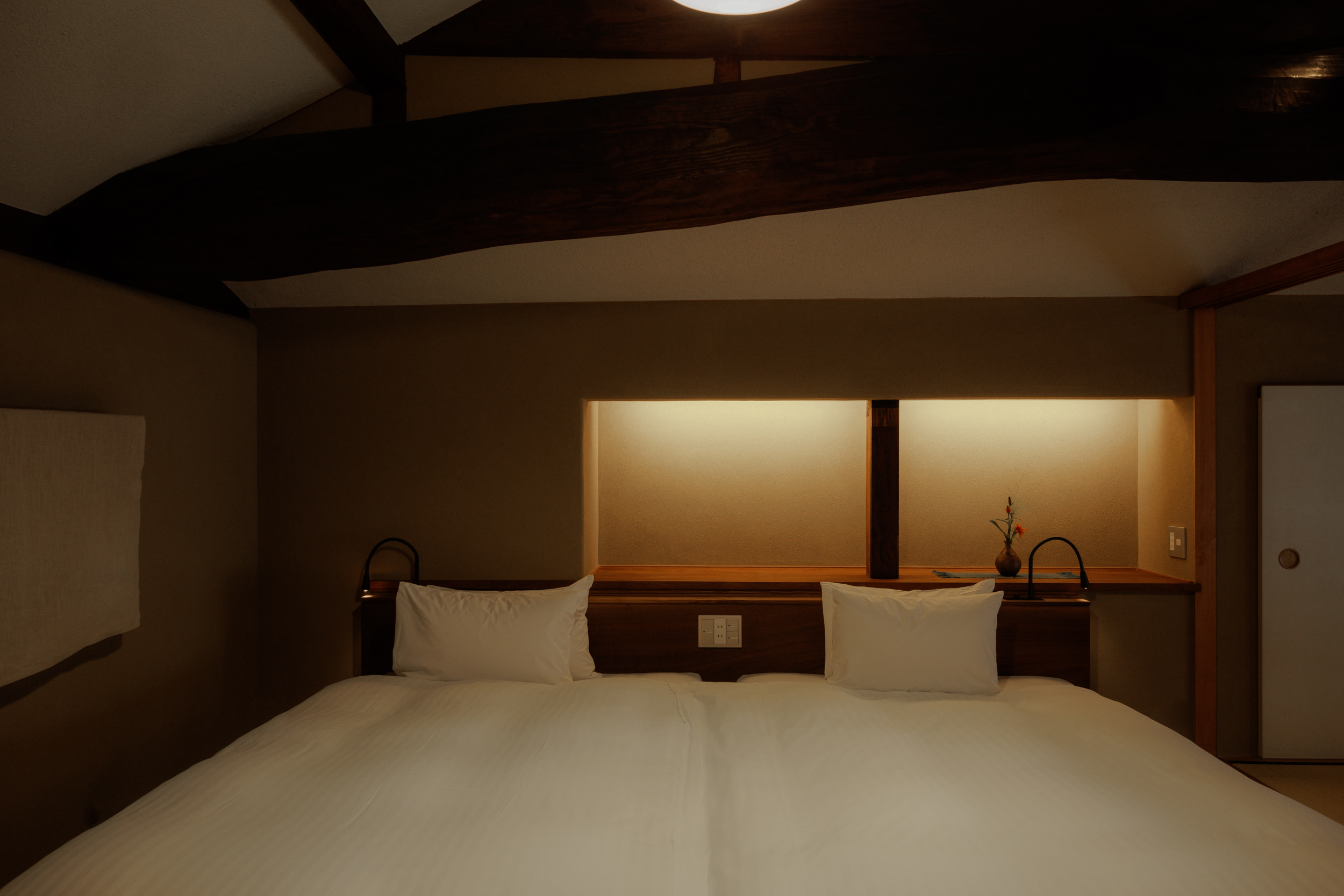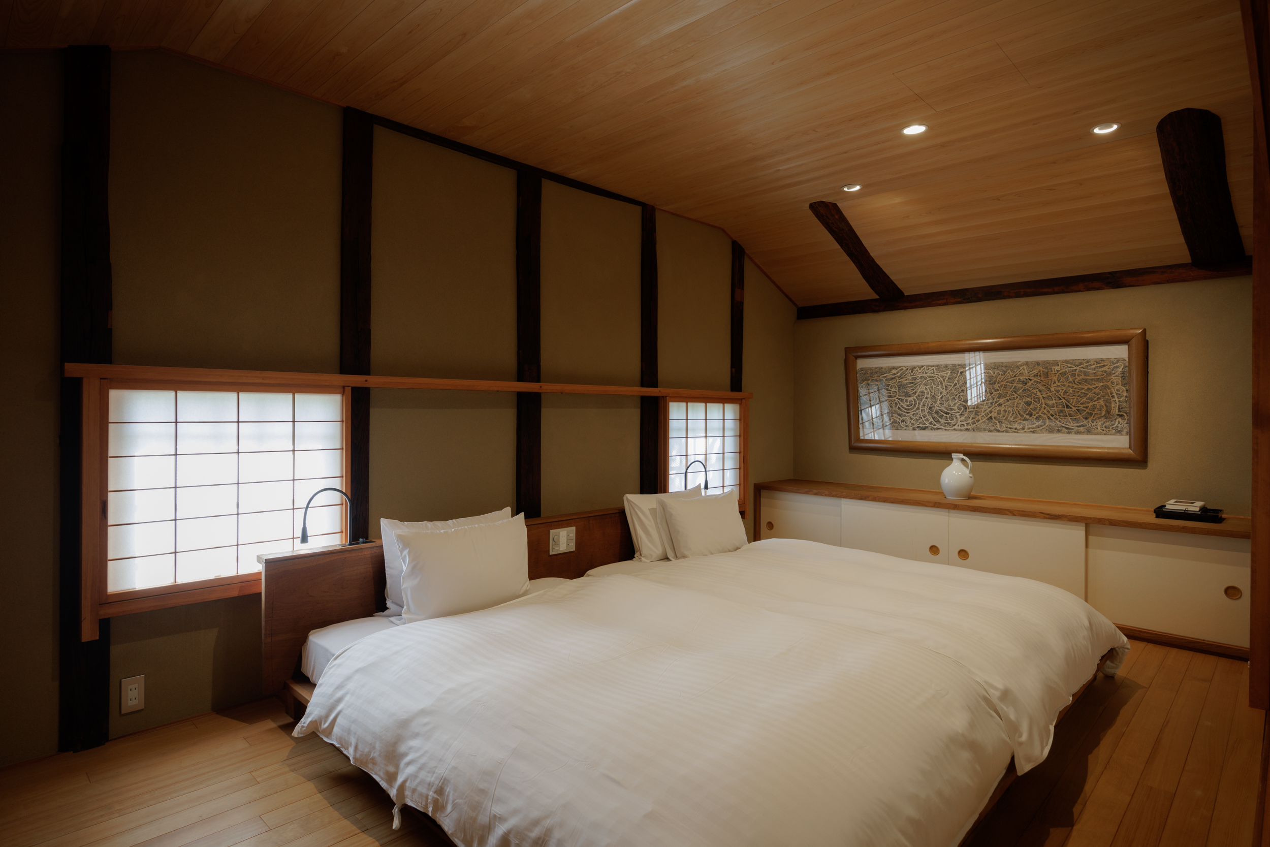 1-4 63.1 sqm Indoor Bath Bed This room was renovated from the second floor of a sugar warehouse built about 170 years ago. The thick ridgepole and beams look beautiful, and the Japanese-style room offers a view of the Kurashiki Bikan Historical Quarter, while the Western-style bedroom and bathroom offer a view of the ryokan's delightful garden. The bath is equipped with a bathtub made of Koya Maki. ¥ 60,000~ per person (based on double occupancy) *Room rates at the Ryokan vary depending on the season and booking status. Therefore, we provide an estimated amount as a reference. REQUEST THIS ROOM -