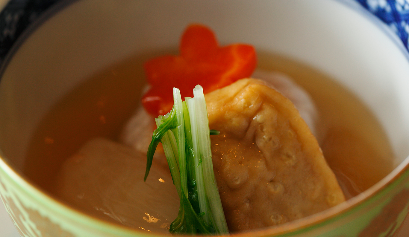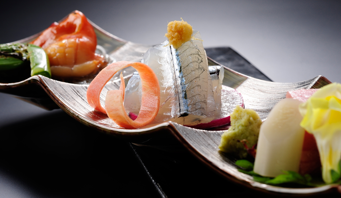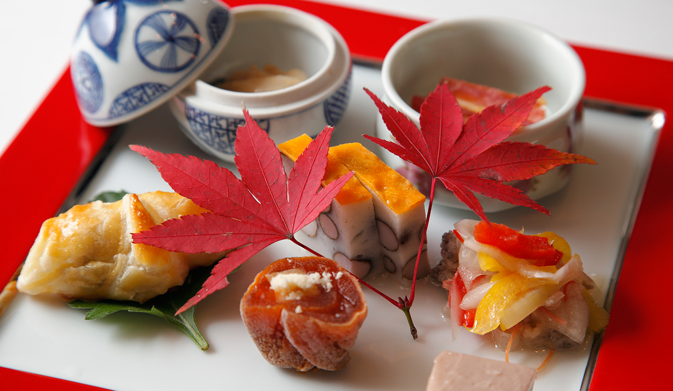 Cuisine Meals at Senjuan are served in the Hibiki restaurant kaiseki-style, with a set menu that emphasizes local delicacies. Dinner starts with a yasoushu, an alcoholic drink made by the Senjuan staff from local herbs to cleanse the palate and prepare the diner for the delights to come. The cuisine centers around seasonal local fish and vegetables grilled at the table on an irori, or small sand-filled hearth, accompanied by a variety of delicacies created in the artful kaiseki style, resulting in a fine example of Japanese cuisine.