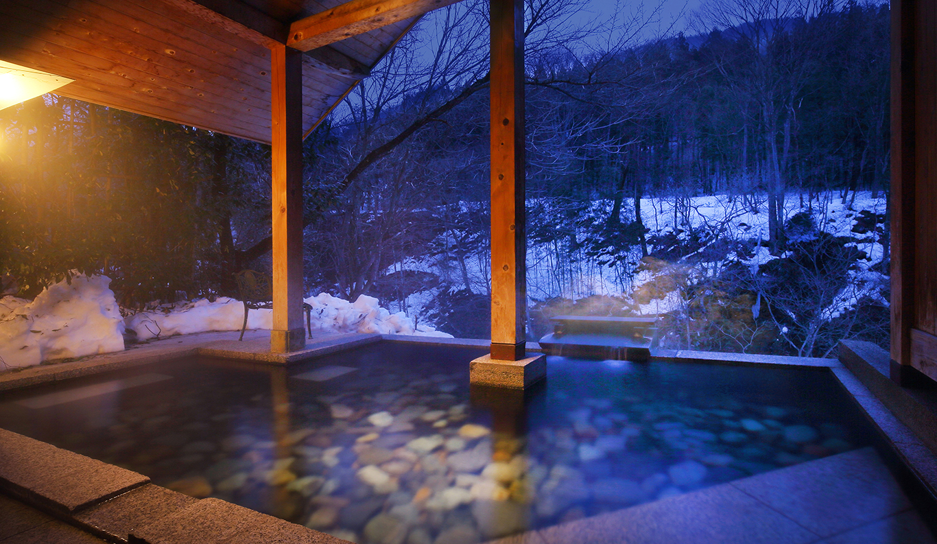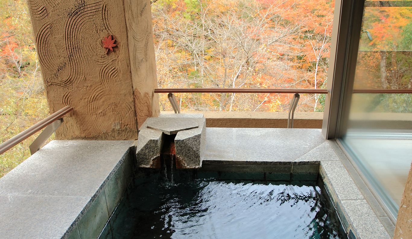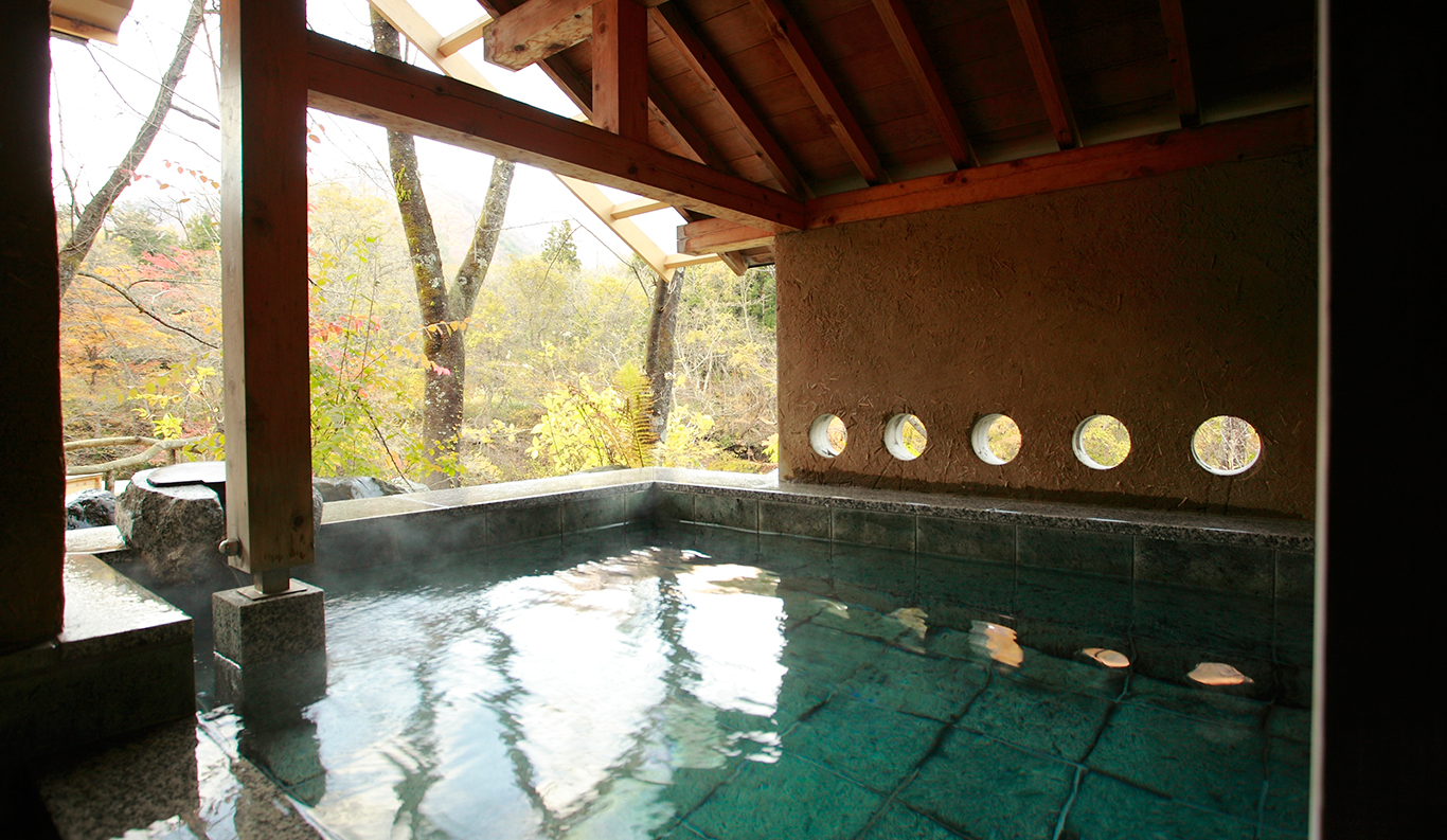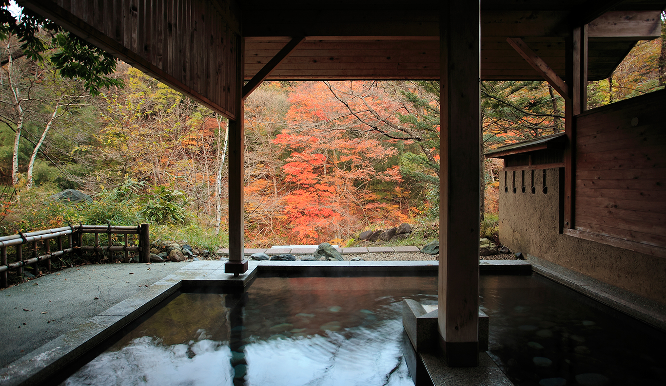 Bath The public bath has two sections, separated by gender, which switch every night at 10:00. The two rotemburo outdoor baths, Ichinokura and Sennokura, which are fed by the famous Tanigawa Onsen hot spring source, are big granite pools with bottoms lined with stones from the river below, and overlooking the beautiful gorge with its pretty mixed forest. A path leads to a secluded sitting area by the river. The indoor bathing facilities are equally sumptuous, with several big granite ofuro baths, a huge hinoki wood bath, a mist sauna and a dry sauna.