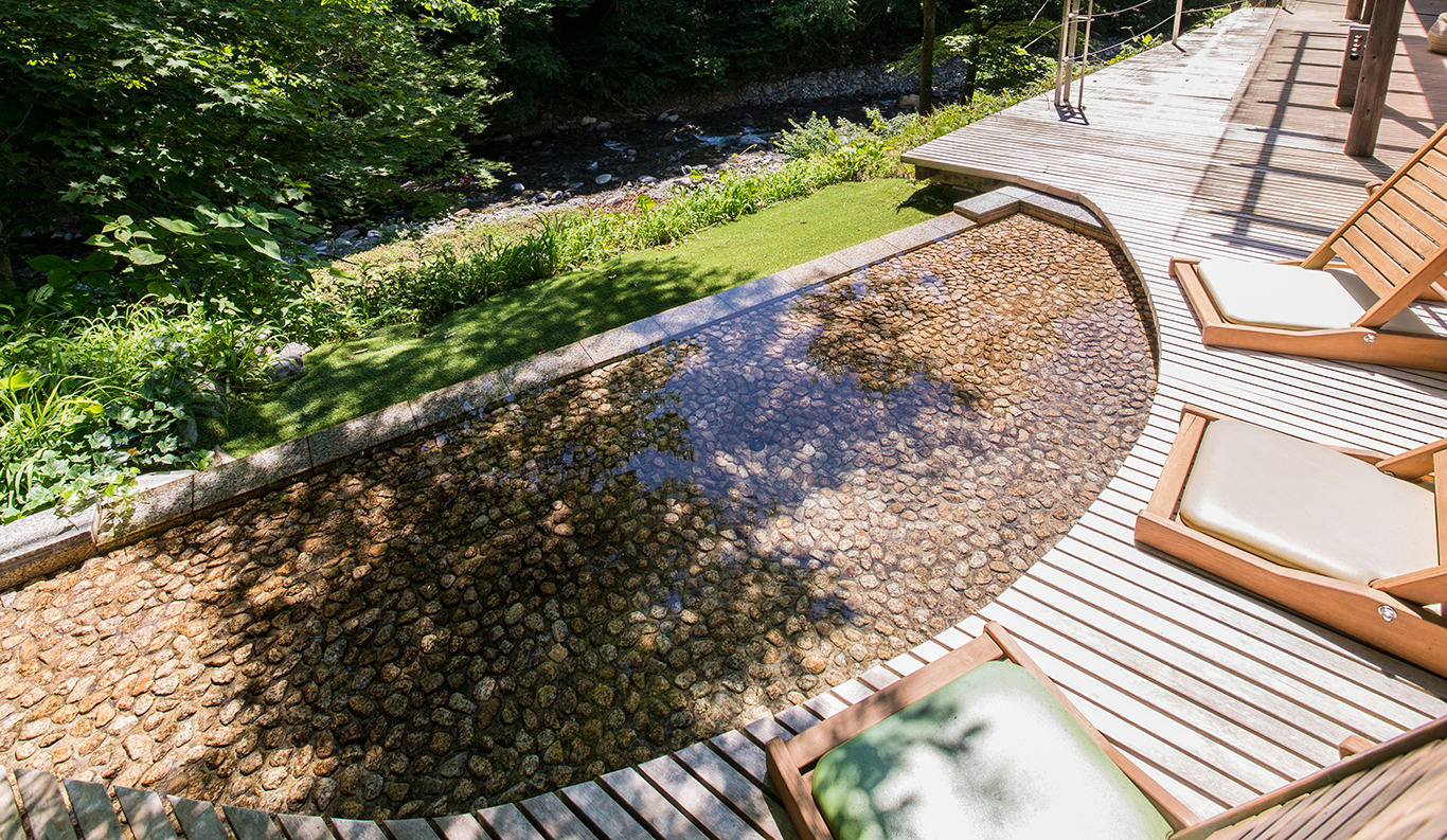 1-4 sqm Private Open-air Bath Futon Each of these Japanese-style rooms is unique, though with the same level of luxury and attention to detail. Each has a two large tatami rooms, as well as a sitting room overlooking the river. Each also has a huge deck, the perfect place for sitting and watching the sunbeams play on the distant peaks or gazing at the moon. The rotemburo are huge granite tubs with glorious views of the surrounding nature. ¥ 63,950~ per person (based on double occupancy) *Room rates at the Ryokan vary depending on the season and booking status. Therefore, we provide an estimated amount as a reference.