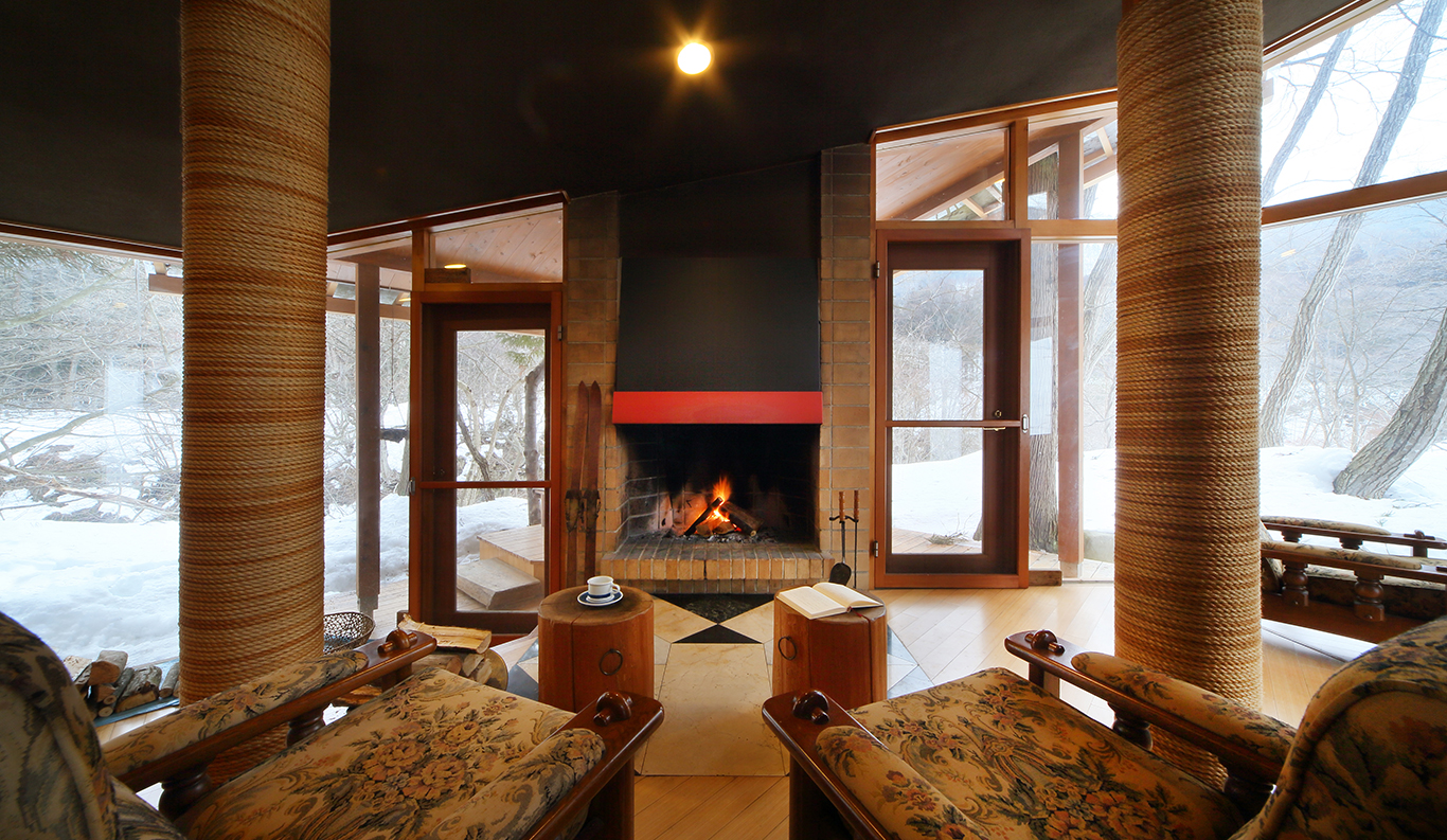 Library Senjuan's reading room is in a separate building equipped with a huge stone fireplace, comfy chairs around it, shelves full of books and a bar. Ceiling-high plate glass windows and a rustic decor give this facility a feeling of cozy comfort, in close contact with the surrounding forest.