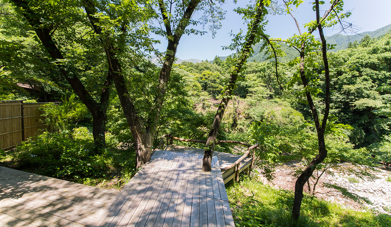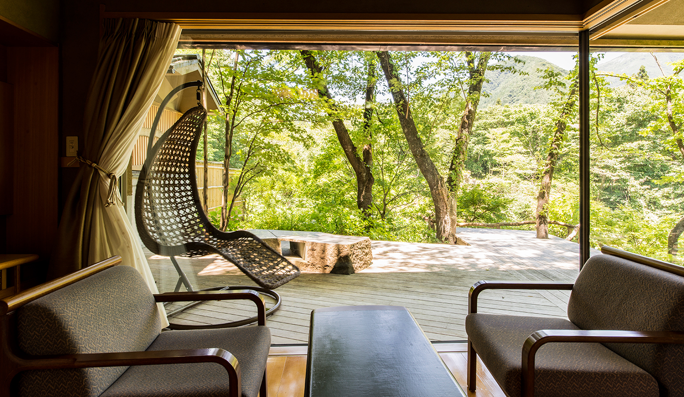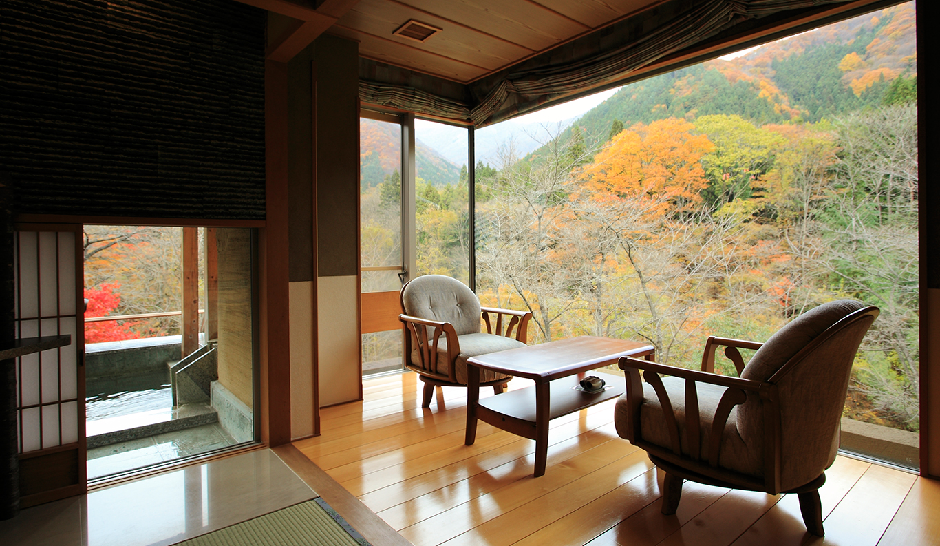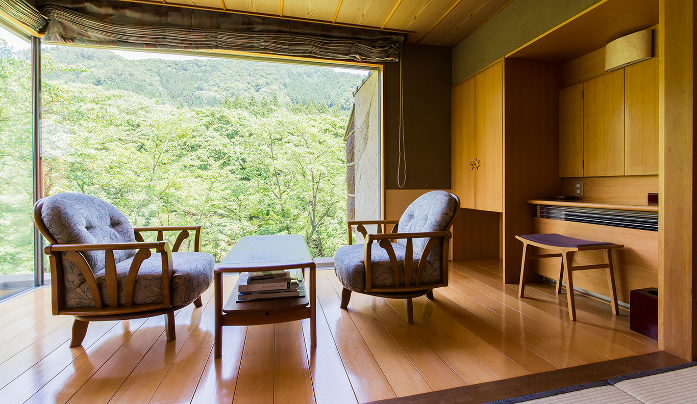 1-4 sqm Private Open-air Bath Futon A spacious Japanese-style room with a tatami sleeping/living room, plus a tsuginoma, or extra tatami room. A sitting room/sunroom with comfortable chairs overlooks the river gorge, and a big stone rotemburo invites glorious soaking outdoors. ¥ 61,750~ per person (based on double occupancy) *Room rates at the Ryokan vary depending on the season and booking status. Therefore, we provide an estimated amount as a reference.