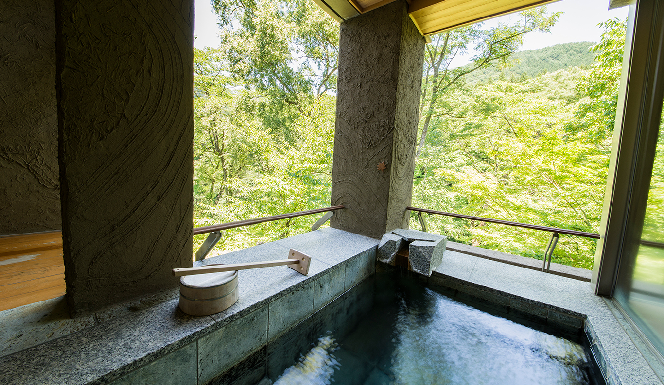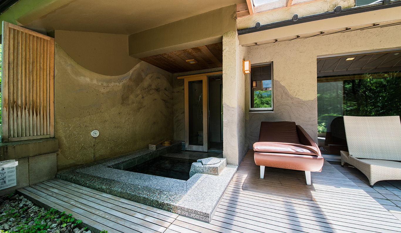 1-2 sqm Private Open-air Bath Bed Twin beds and elegant furnishings, a fireplace, a chaise longue and comfortable chairs make up this Western-style room. Big windows look out onto the woods and river, and the rotemburo is a spacious square granite pool. ¥ 57,350~ per person (based on double occupancy) *Room rates at the Ryokan vary depending on the season and booking status. Therefore, we provide an estimated amount as a reference.