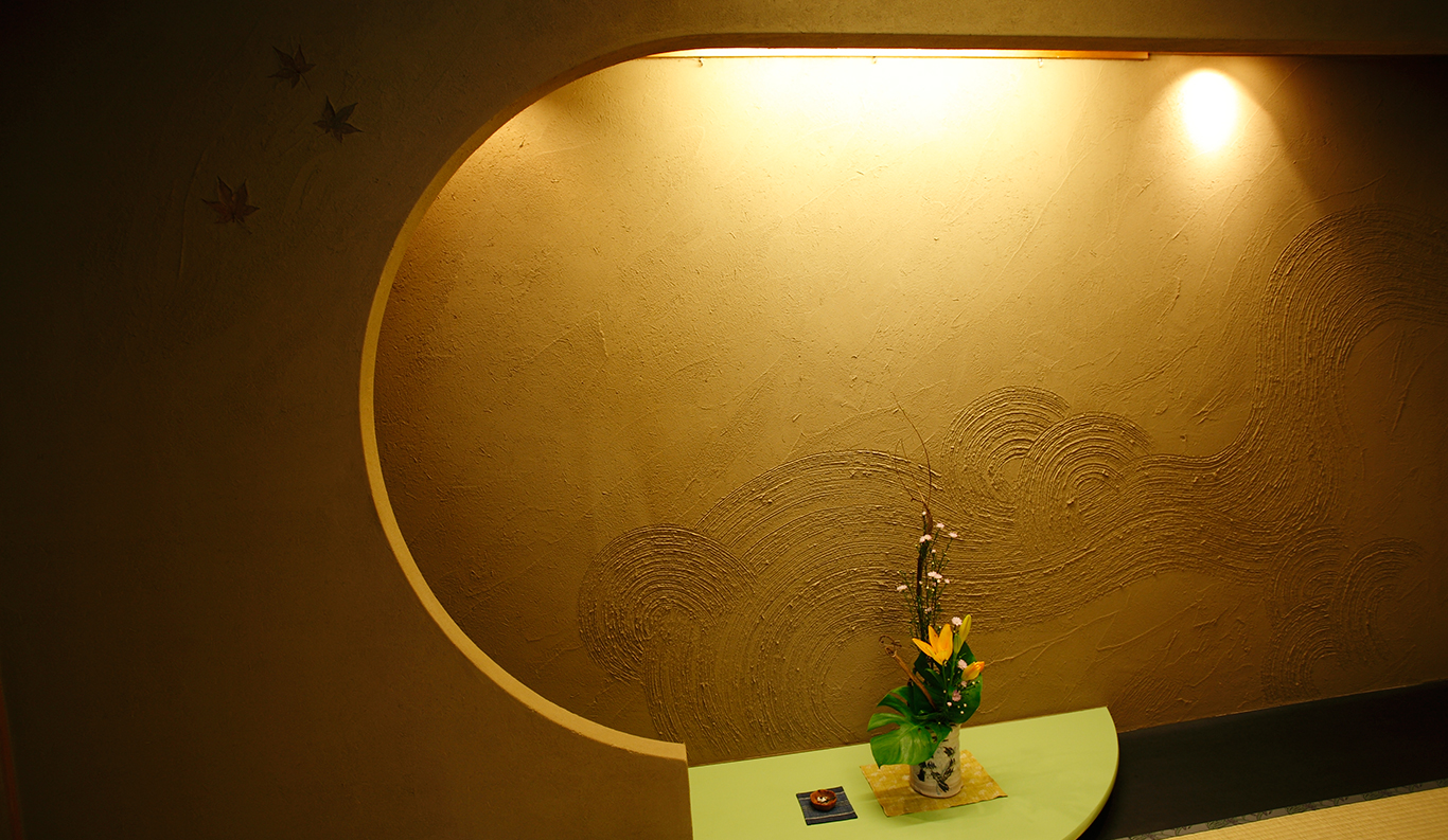 Rooms are finished in tsuchikabe, a traditional technique raised to the level of art at Senjuan, with leaves, pieces of charcoal, seashells, and even machine nuts and washers (which over the years have oxidized, leaving lovely red images in the stucco). This ćive wall? is the traditional way to naturally control humidity, odors and temperature.