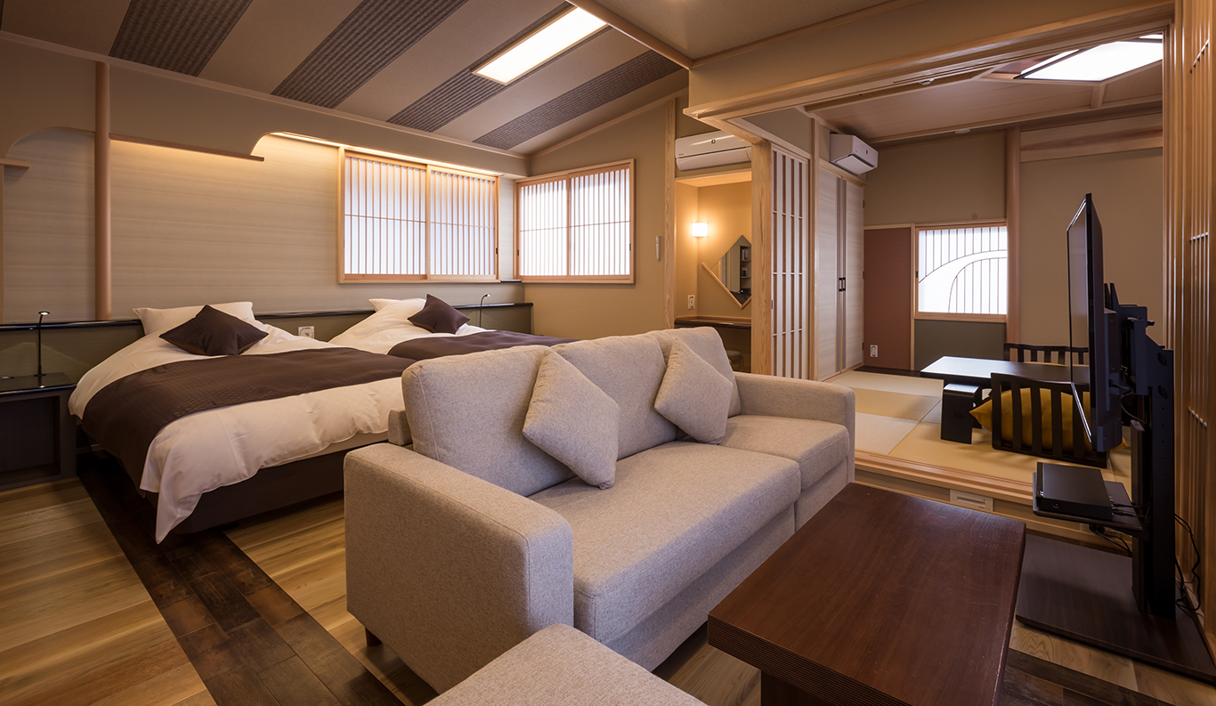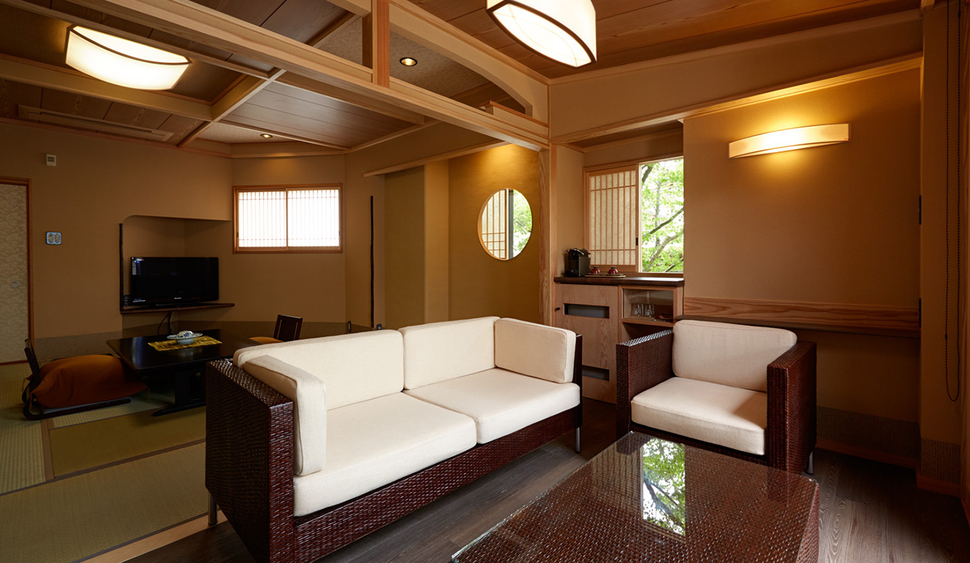 Tsukiyomi is spacious 100 sq. meter suites suitable for up to six guests relaxing in comfort. They feature a nicely balanced mix of Japanese- and Western-style accommodations, each with one room with twin beds and another with futons on tatami mats in a big, 10-mat living room. ¥ 77,000~ per person (based on double occupancy) *Room rates at the Ryokan vary depending on the season and booking status. Therefore, we provide an estimated amount as a reference. REQUEST THIS ROOM -