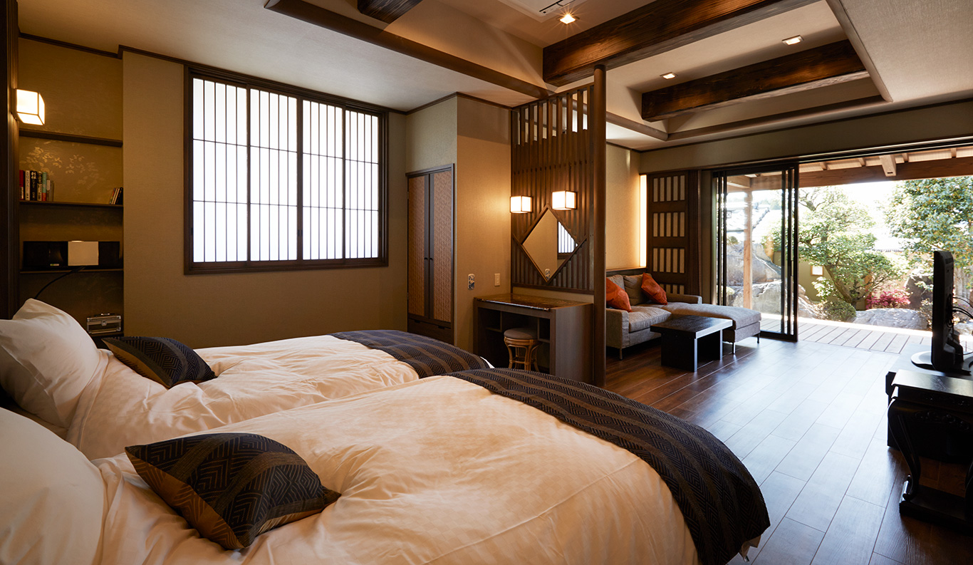 1-2 60 sqm Private Open-air Bath Bed One of Shinsen’s five luxurious suites in free-standing villas with interior designs that reflect and reference the history of the surrounding area. The room has a big, beautiful rotemburo open-air bath, and all have individual designs that contribute to their unique sense of place.
