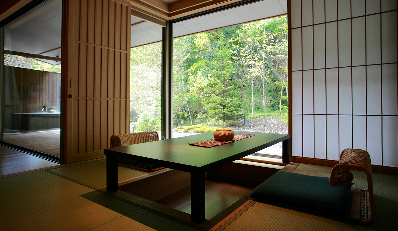 1-4 91 sqm Private Open-air Bath Bed This is a large, 91 sq. meter Japanese/Western style room, with a mix of Western style furniture in the living room and Japanese floor-level seating in the dining area. Sleeping arrangements are available for both Western-style beds or comfortable Japanese futons on sweetly aromatic tatami mats. The spacious rotemburo is a big beautiful slate number overlooking the maple woods, complemented by a big wooden deck – an ideal place to sit and contemplate the northern seasons. ¥ 68,500~ per person (based on double occupancy) *Room rates at the Ryokan vary depending on the season and booking status. Therefore, we provide an estimated amount as a reference. REQUEST THIS ROOM -