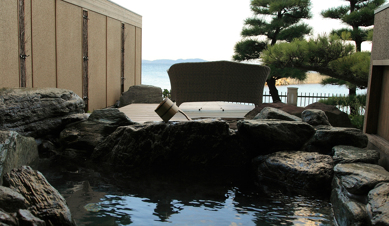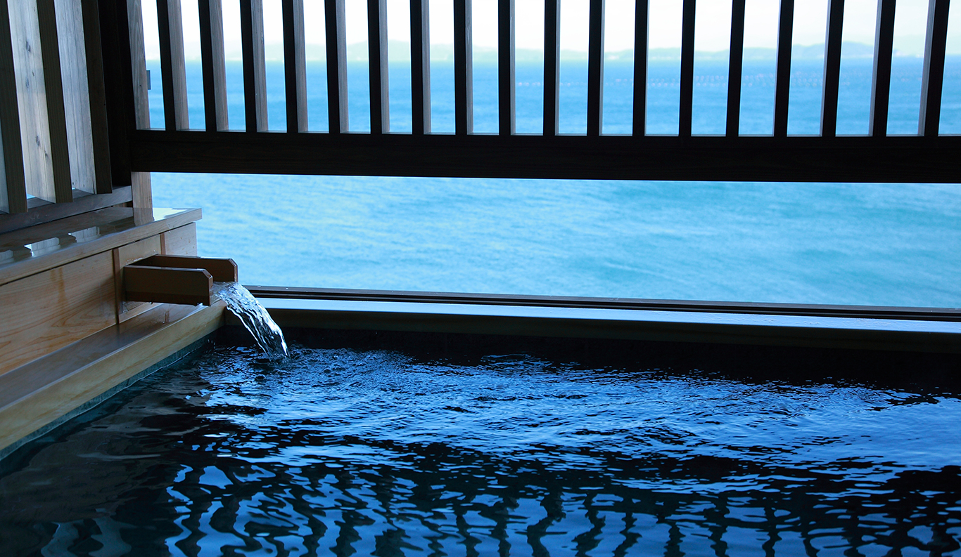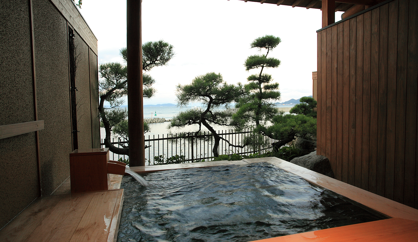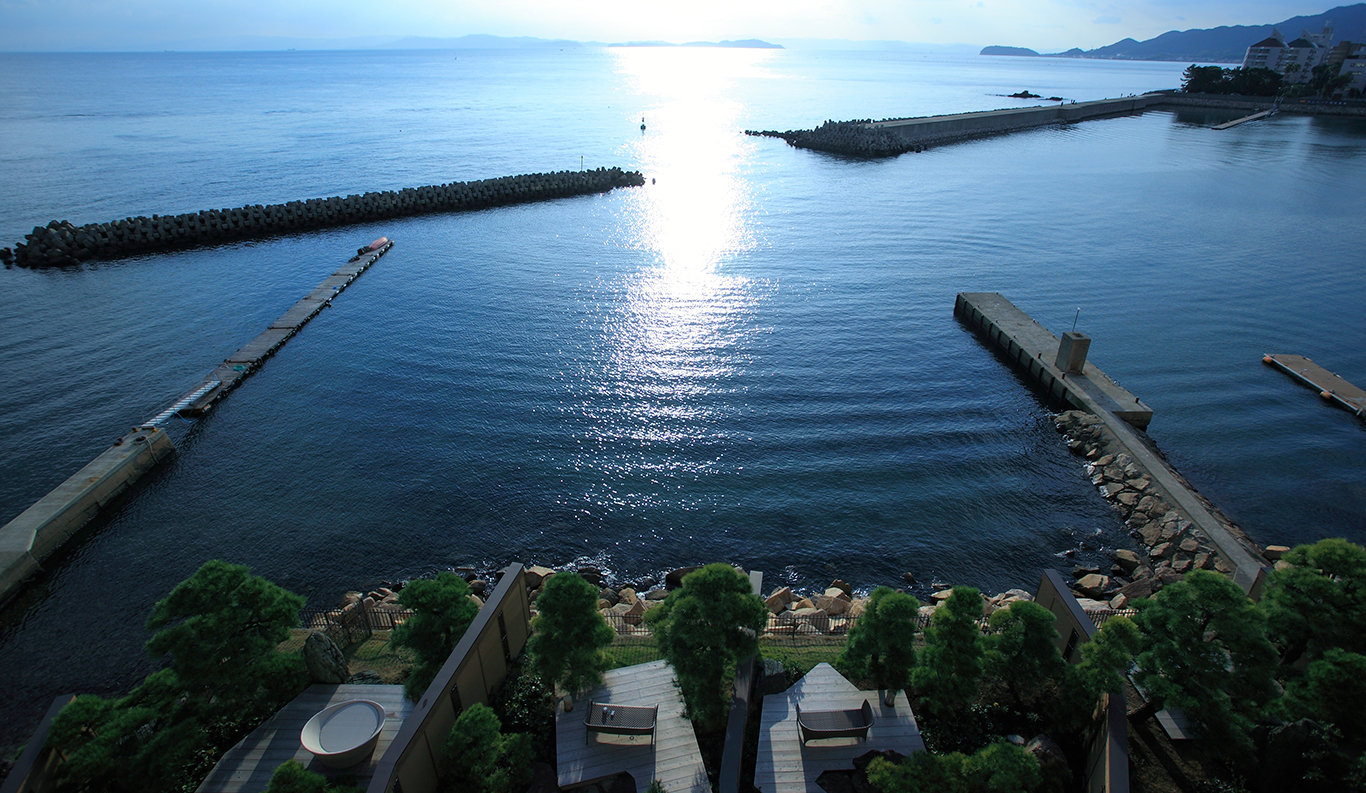 With its spectacular panoramic view of the Komoe Kaigan yacht basin and the Seto Inland Sea beyond, Villa Rakuen is a high-end, premium ryokan-style hotel that bespeaks luxury. Its spacious, airy rooms and opulent bathing facilities attract onsen hot spring lovers from all over Japan, especially from the Kansai district around Osaka, Kyoto and Kobe.