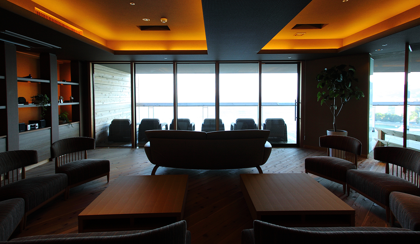 The Sky Lounge Villa Rakuen's Tenjo no Sajiki executive lounge on the 11th floor includes a library, Wifi wireless LAN Internet access, coffee, tea and massage chairs, as well as the concierge service, along with its spectacular view of the harbor and the Inland Sea.