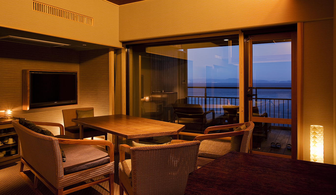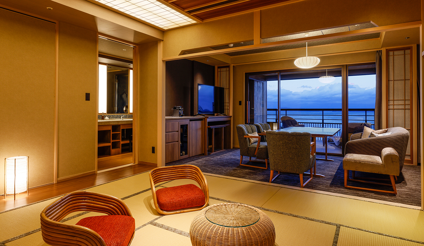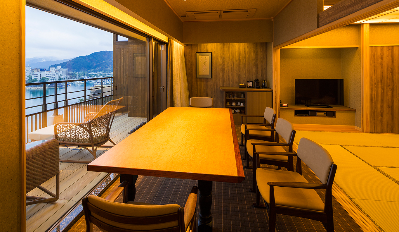 2-6 163 sqm Private Open-air Bath Bed This is a large suite, with separate bedroom with twin Western-style beds, tatami living room, and dining room with a lovely big dining table that seats four facing the sea. ¥ 50,750~ per person (based on double occupancy) *Room rates at the Ryokan vary depending on the season and booking status. Therefore, we provide an estimated amount as a reference. REQUEST THIS ROOM -
