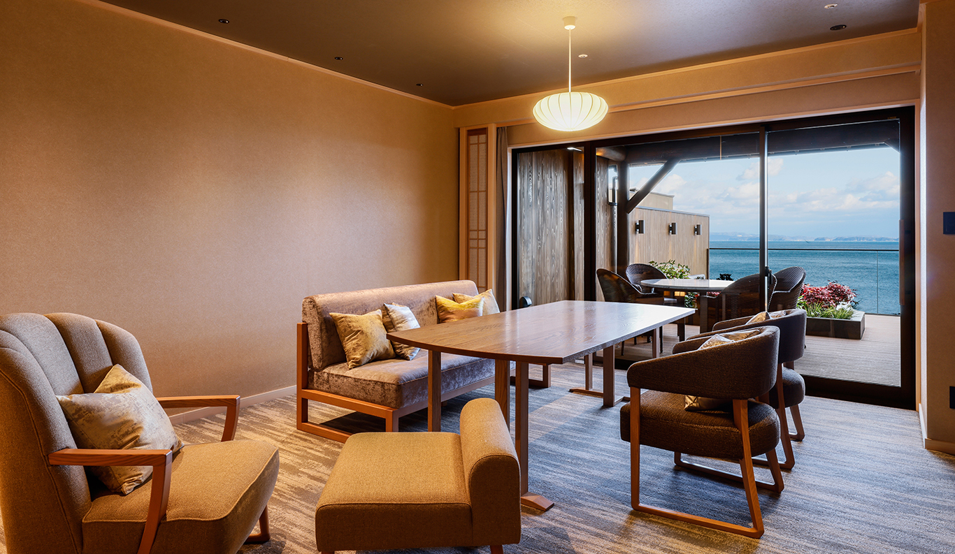 2-4 83 sqm Private Open-air Bath Bed This new room type was added in December 2023. The adjacent terrace gives this room a cozy, first-class cabin-like feeling. With the blue sky and the sea so close, this room is bound to keep you captivated. ¥ 39,750~ per person (based on double occupancy) *Room rates at the Ryokan vary depending on the season and booking status. Therefore, we provide an estimated amount as a reference. REQUEST THIS ROOM
