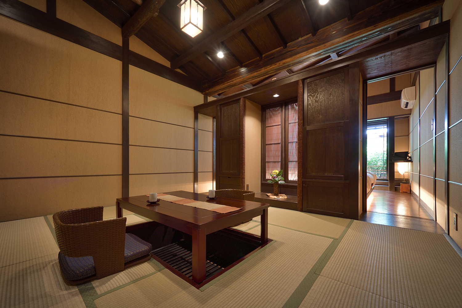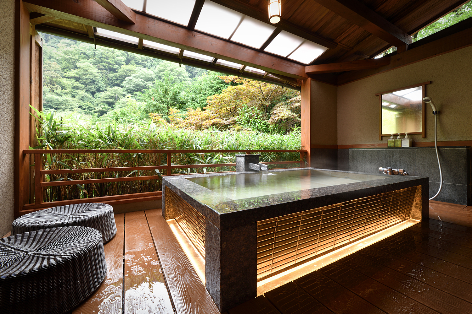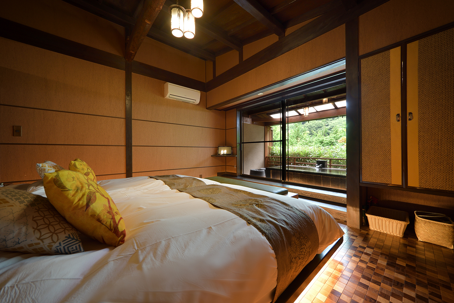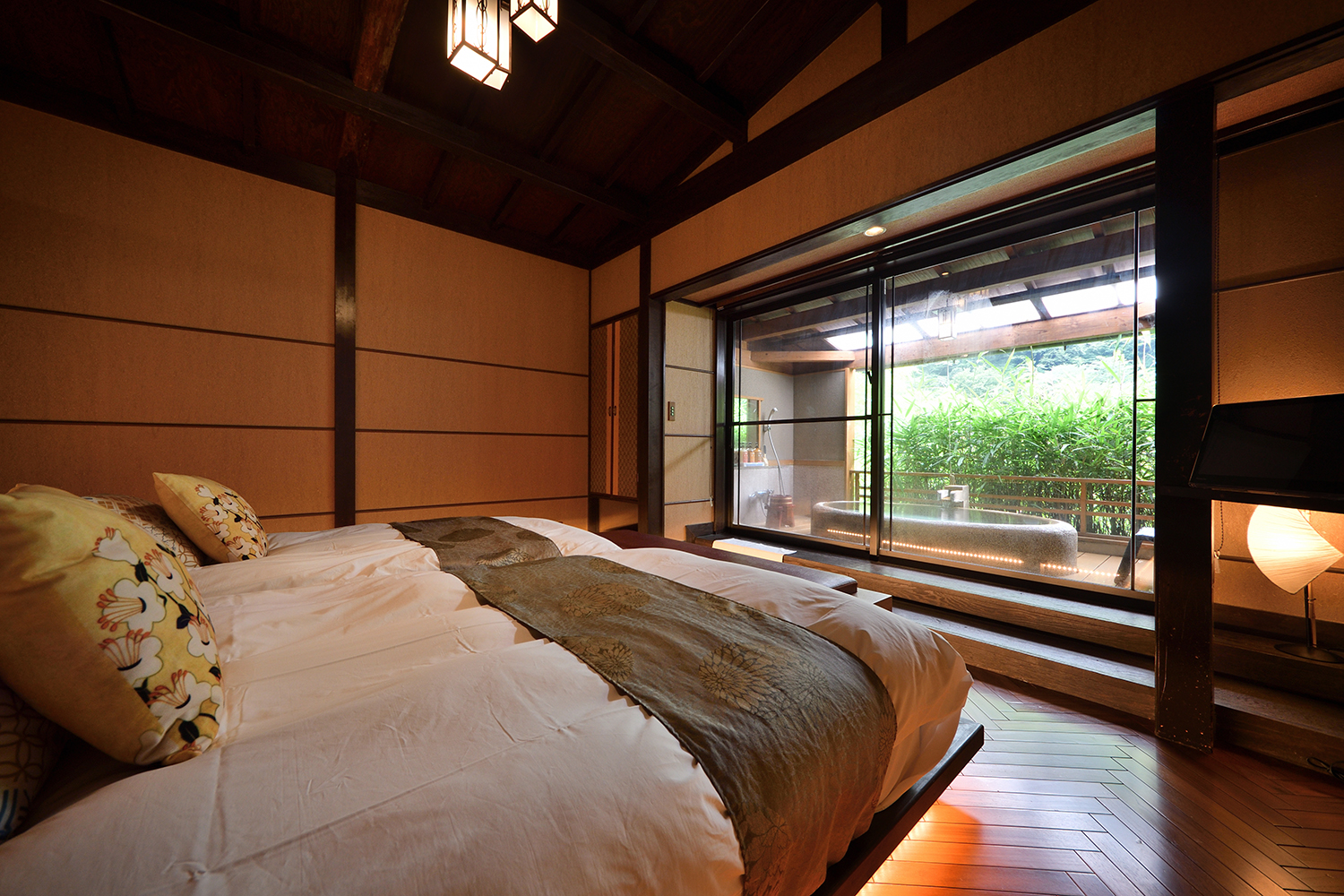 1-4 55 sqm Private Open-air Bath Bed This is a twin room, with a rotemburo on the veranda made of hinoki wood and a sitting area that invites ease and contemplation of the reflections of the rotemburo's waves refracted up to the ceiling beams. Bamboo shields the rotemburo fro sight, as well as filtering the sunlight and imparting a beautiful swishing sound as it sways in the breeze. The room also has a cozy kotatsu (a table with a heater underneath) with a leg space that will be especially appreciated by foreign guests not used to sitting on tatami mats. ¥ 55,178~ per person (based on double occupancy) *Room rates at the Ryokan vary depending on the season and booking status. Therefore, we provide an estimated amount as a reference. REQUEST THIS ROOM -