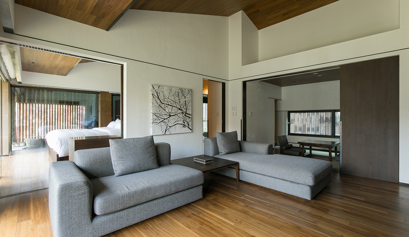 Inspired by the Zen words for meditation ‘za-zen’(坐禅 literally: ‘sitting zen’) and ‘za-bo’ (坐忘 meaning literally ‘to sit, to forget’), ‘Za-bo-rin’ is to sit and to forget in the trees ( where 林 ‘rin’ means a small forest or wood). It was this in mind that award winning architect Nakayama san was commissioned to design a ryokan to which was incorporated the inherent Zen meaning of ‘Zabo’ (literally to sit and forget) which is to ‘stare at the heart, free of all thoughts and desires’ . His design both opens to the surrounding vistas, inviting nature in, while quietly blending into the landscape allowing peaceful focus and reflection.