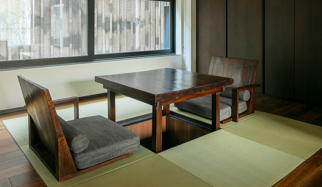 Dining Space The dining area in Zaborin is divided into smaller rooms, providing each guest villa their dining privacy, varying in atmosphere and intimacy. The ambience is peaceful and soothing, at times punctuated by sightings of the local wild residents in their natural habitat. Larger room options include a traditional ‘hori-kotasu’ (low tables with sunken tatami floor) and an ‘irori’ (traditional sunken hearth).