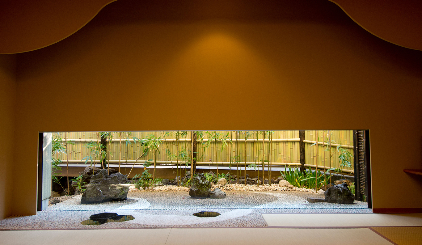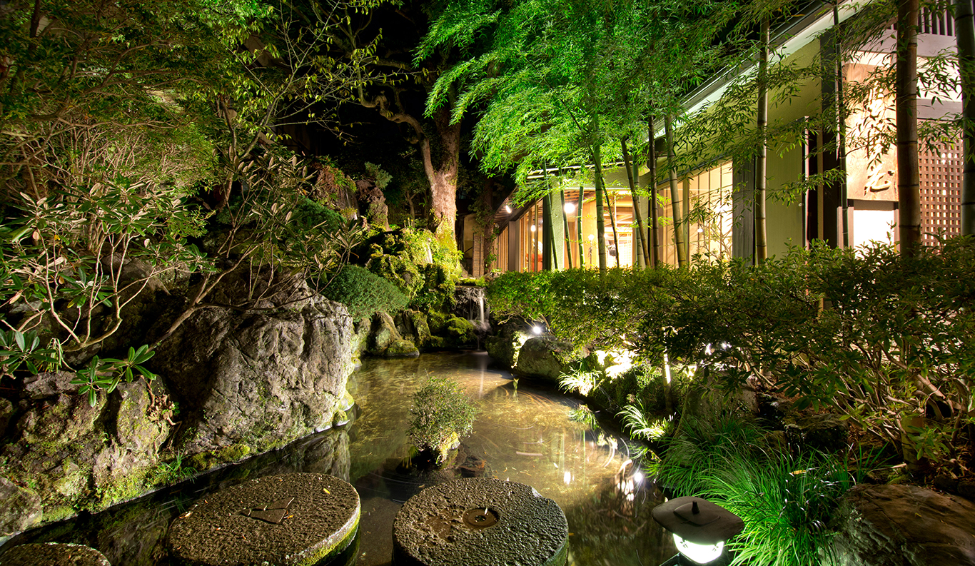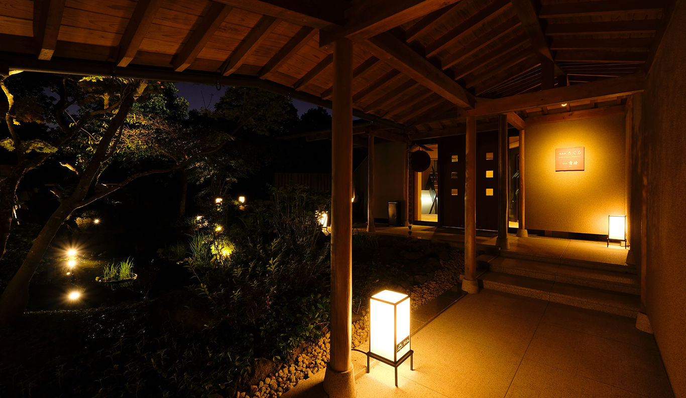 One of two outdoor hot spring baths, Aoi has an unusual hexagon shape, with mint-toned Izu stone capped by aromatic hinoki cypress beams. Open to the sky and surrounded by low azalea bushes and broad-leaf bamboo, expansive Aoi invites you to float on your back and gaze up at the stars, contemplating your place in the universe. Even when it rains, the cool touch of raindrops on your face feels like a benediction from nature. The billowing clouds of steam are particularly inviting at night, illuminated by garden lamps and twisting like genies from sinuous shape to sinuous shape as they float away into the dark.