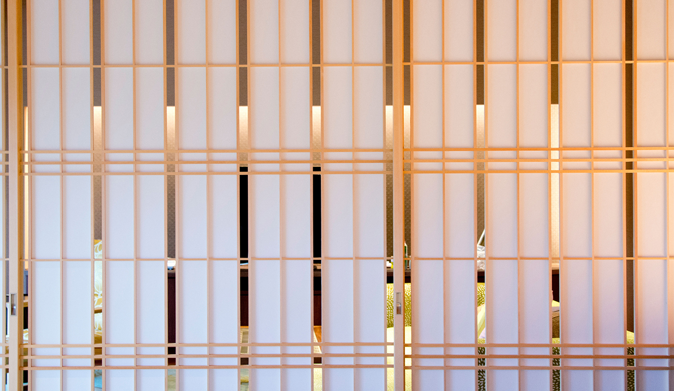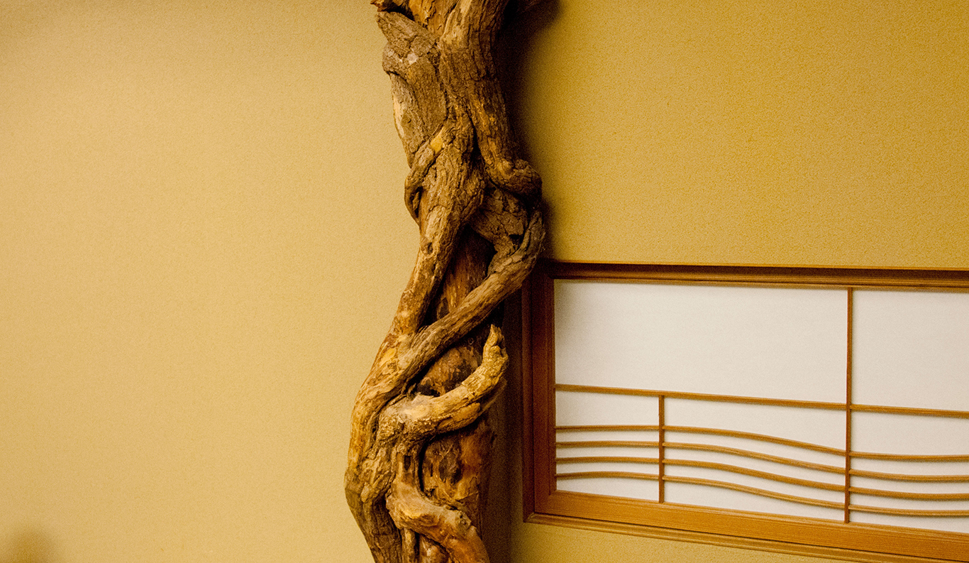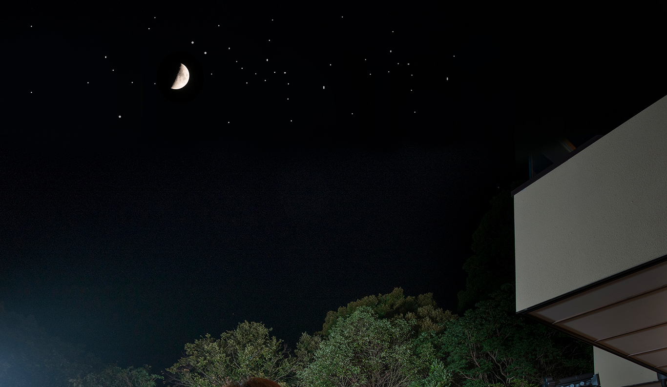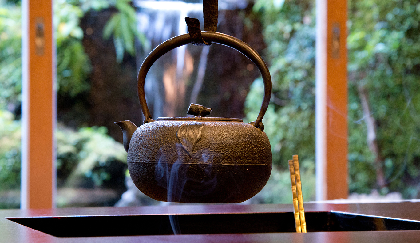One of two outdoor hot spring baths, Aoi has an unusual hexagon shape, with mint-toned Izu stone capped by aromatic hinoki cypress beams. Open to the sky and surrounded by low azalea bushes and broad-leaf bamboo, expansive Aoi invites you to float on your back and gaze up at the stars, contemplating your place in the universe. Even when it rains, the cool touch of raindrops on your face feels like a benediction from nature. The billowing clouds of steam are particularly inviting at night, illuminated by garden lamps and twisting like genies from sinuous shape to sinuous shape as they float away into the dark.
