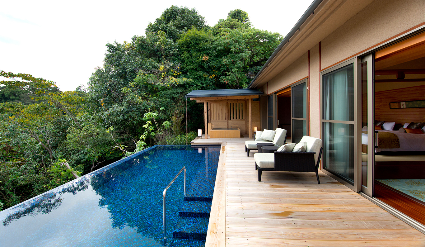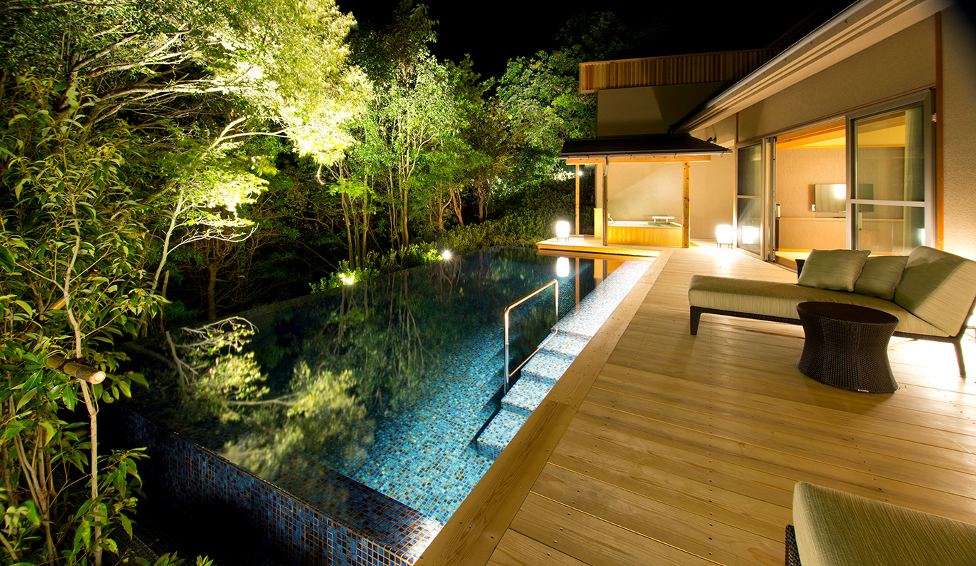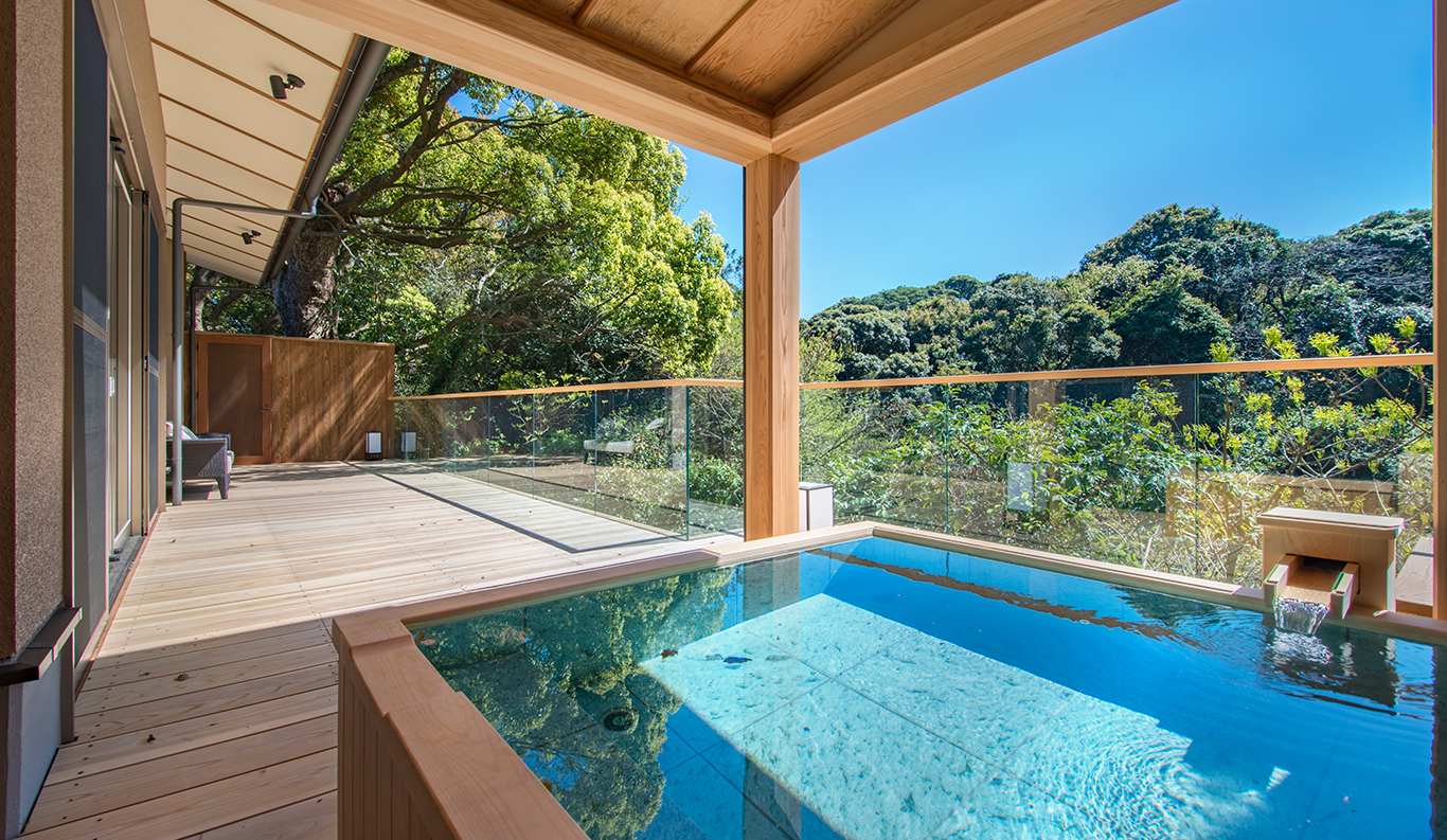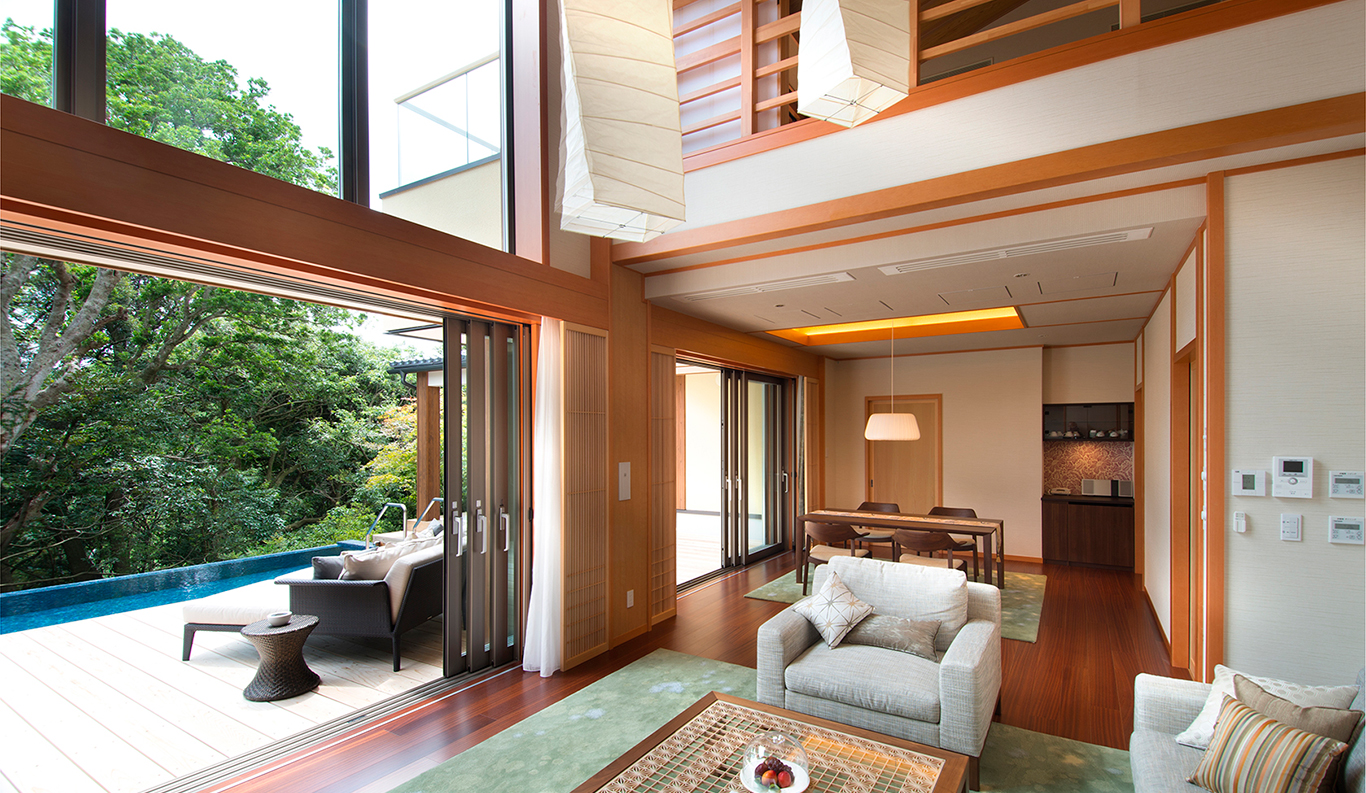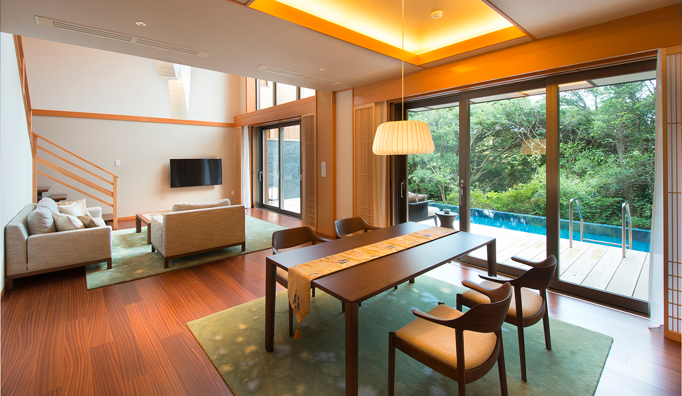 The largest and most luxurious accommodation option at Zagyosoh is this 2-story home away from home, featuring a full-size heated swimming pool, jacuzzi hot tub, open-air hot spring bath, and dry sauna. The kitchen and dining room allows guests in this room to select the exclusive dining option of an in-room dinner personally served by either of the ryokan’s 2 head chefs. Decorated in warm wood and natural pastels, with washi paper lighting and retractable glass walls on both floors, the villa is an airy space of sublime comfort in tune with the surrounding nature. Enjoy a glass of Champagne on the deck’s cushioned sunbed and listen to the symphony of sea breezes whispering through the trees.