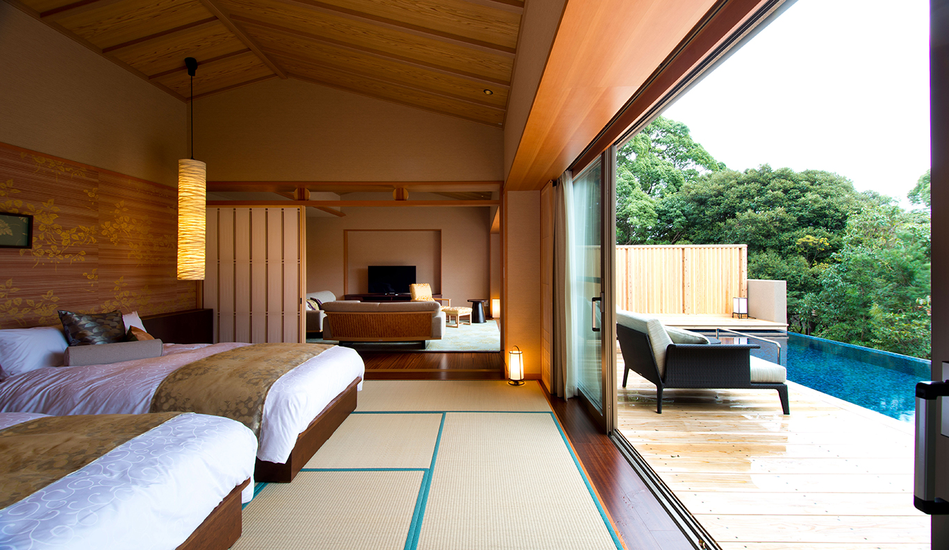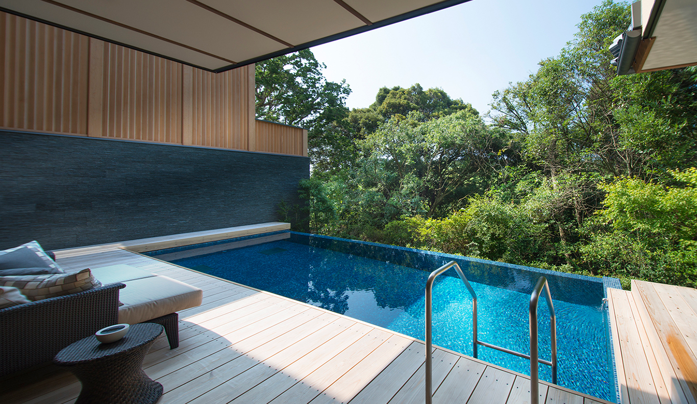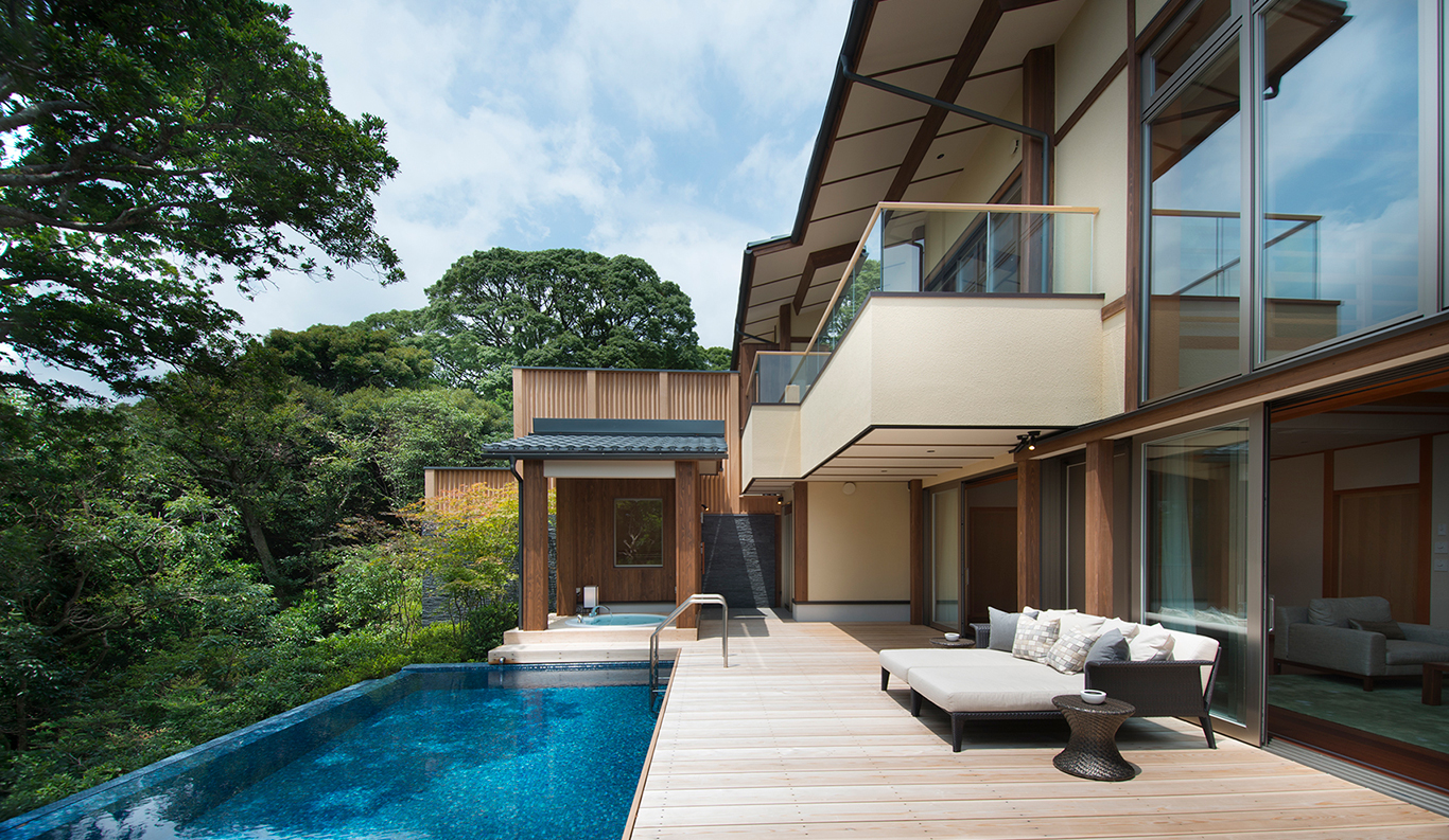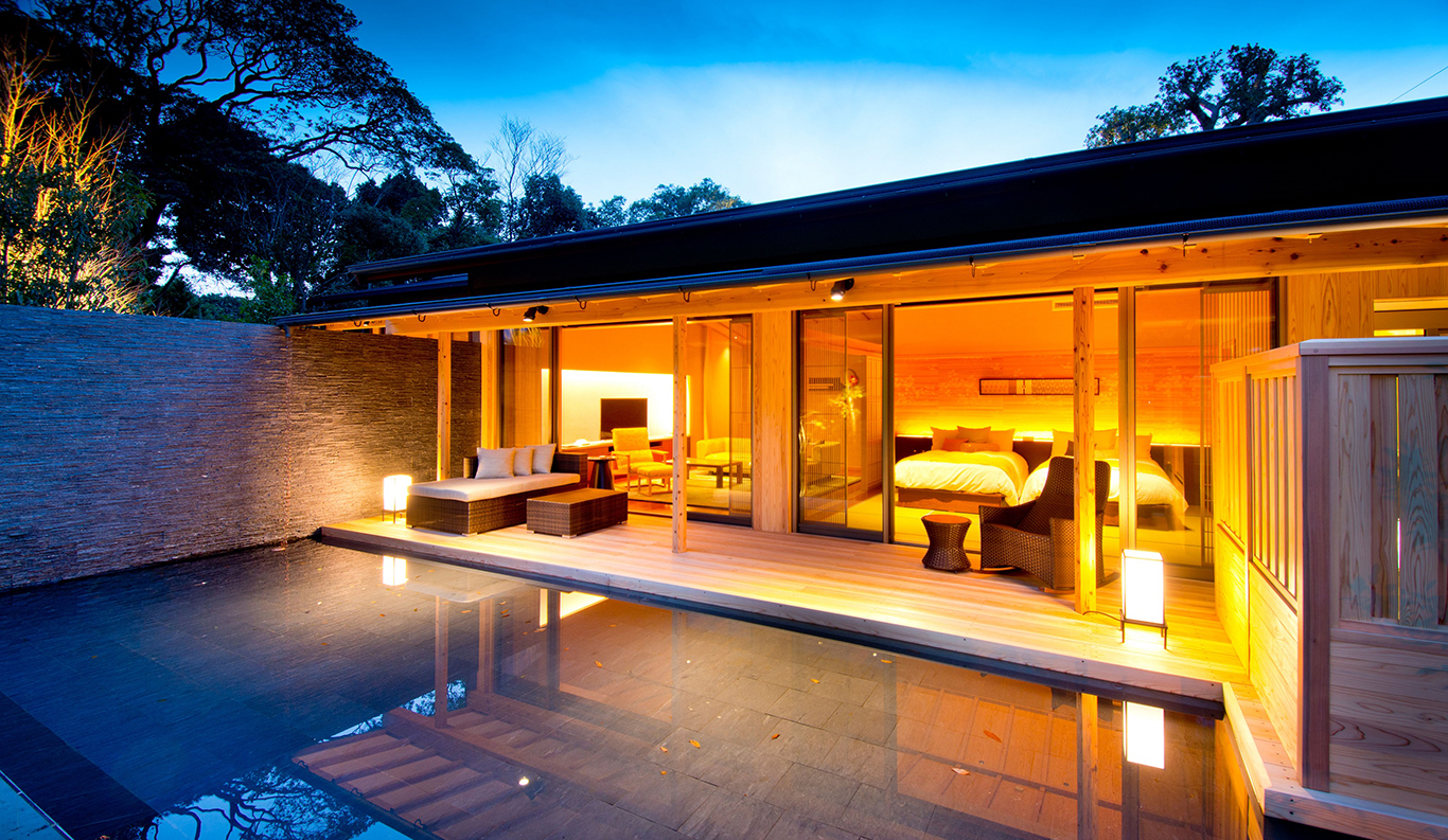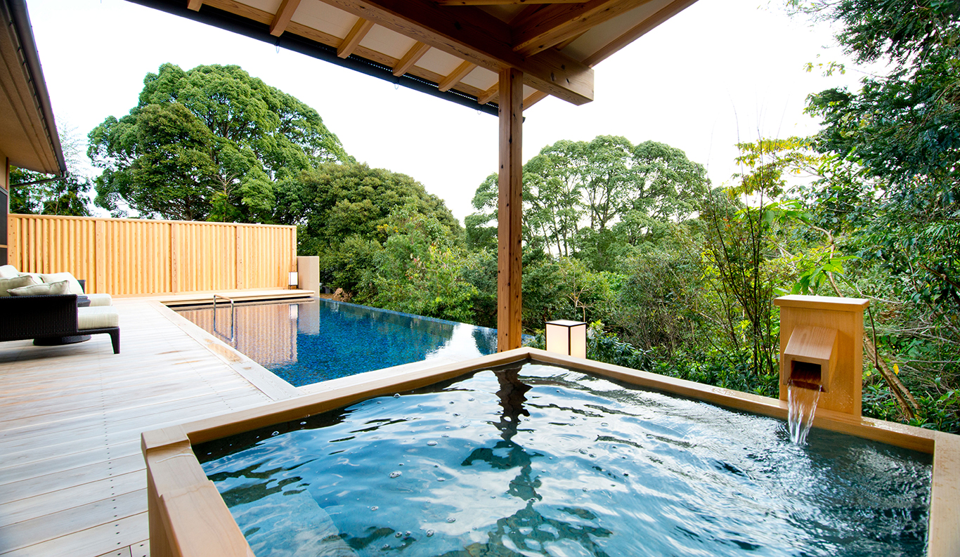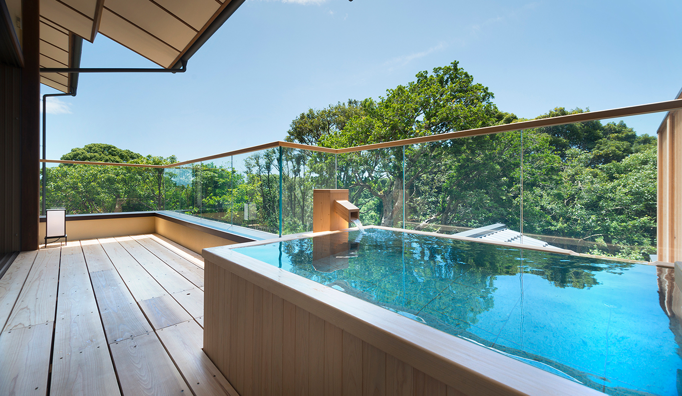 The largest and most luxurious accommodation option at Zagyosoh is this 2-story home away from home, featuring a full-size heated swimming pool, jacuzzi hot tub, open-air hot spring bath, and dry sauna. The kitchen and dining room allows guests in this room to select the exclusive dining option of an in-room dinner personally served by either of the ryokan’s 2 head chefs. Decorated in warm wood and natural pastels, with washi paper lighting and retractable glass walls on both floors, the villa is an airy space of sublime comfort in tune with the surrounding nature. Enjoy a glass of Champagne on the deck’s cushioned sunbed and listen to the symphony of sea breezes whispering through the trees.