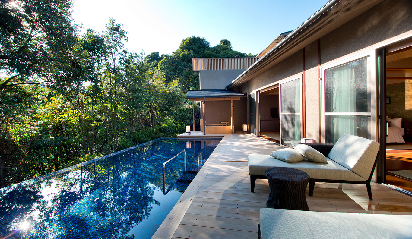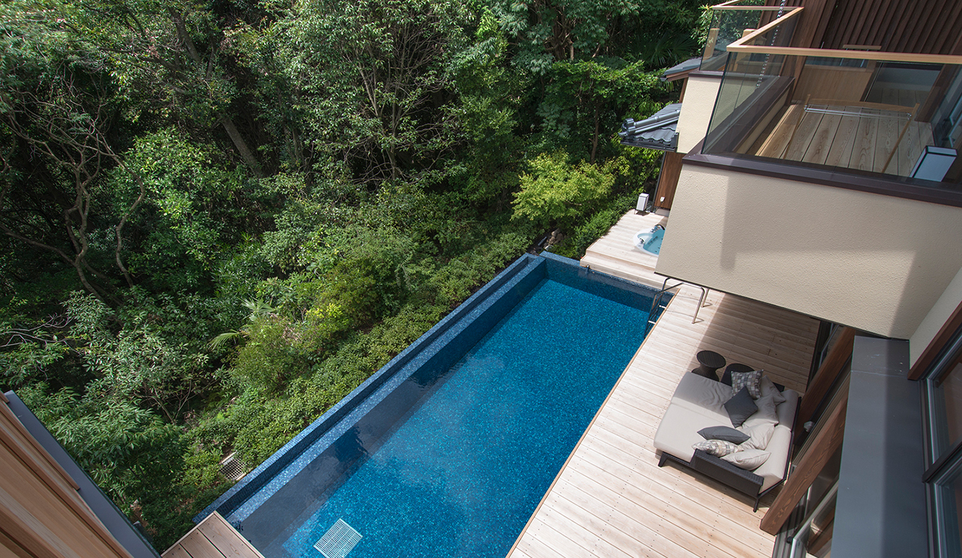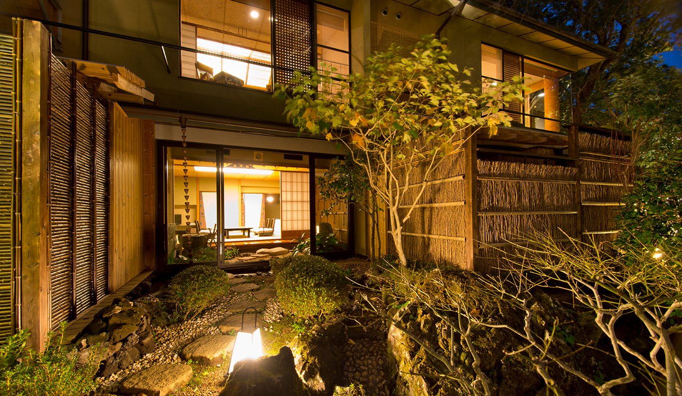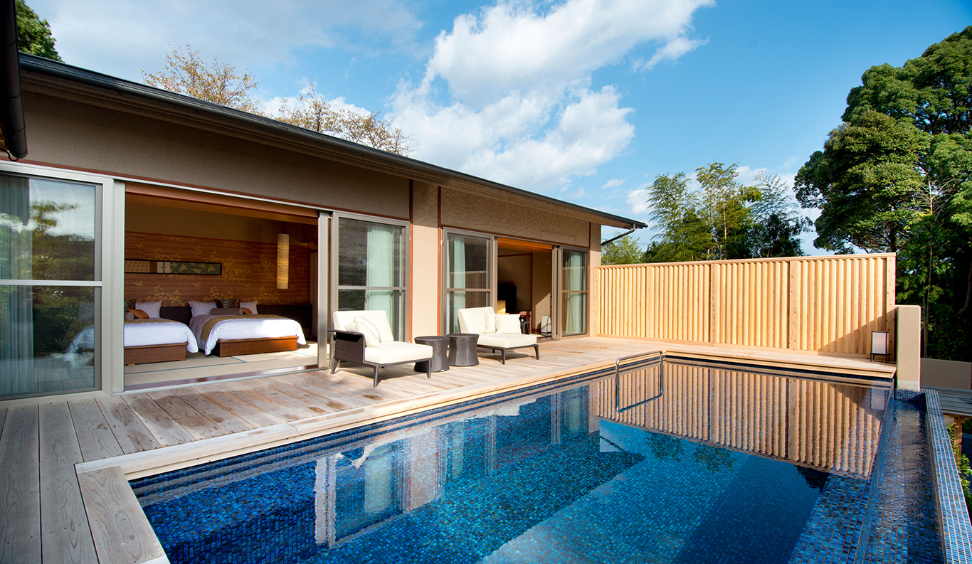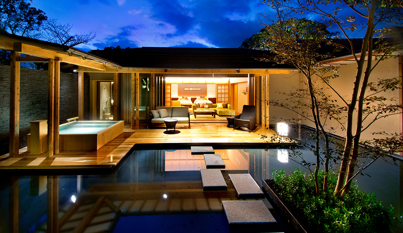 The largest and most luxurious accommodation option at Zagyosoh is this 2-story home away from home, featuring a full-size heated swimming pool, jacuzzi hot tub, open-air hot spring bath, and dry sauna. The kitchen and dining room allows guests in this room to select the exclusive dining option of an in-room dinner personally served by either of the ryokan’s 2 head chefs. Decorated in warm wood and natural pastels, with washi paper lighting and retractable glass walls on both floors, the villa is an airy space of sublime comfort in tune with the surrounding nature. Enjoy a glass of Champagne on the deck’s cushioned sunbed and listen to the symphony of sea breezes whispering through the trees.