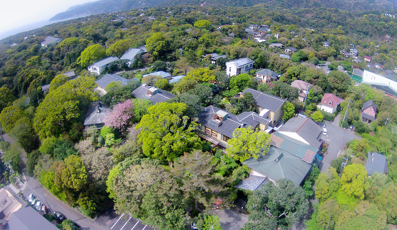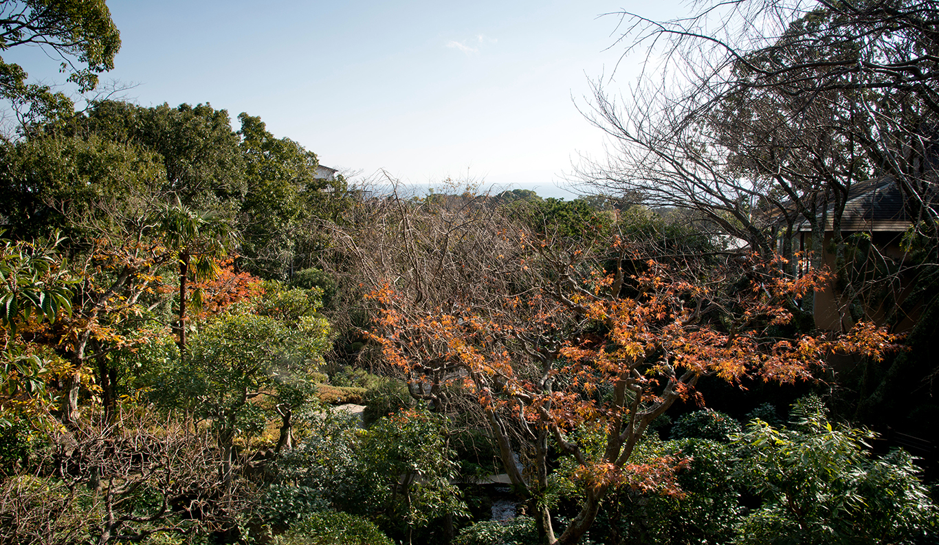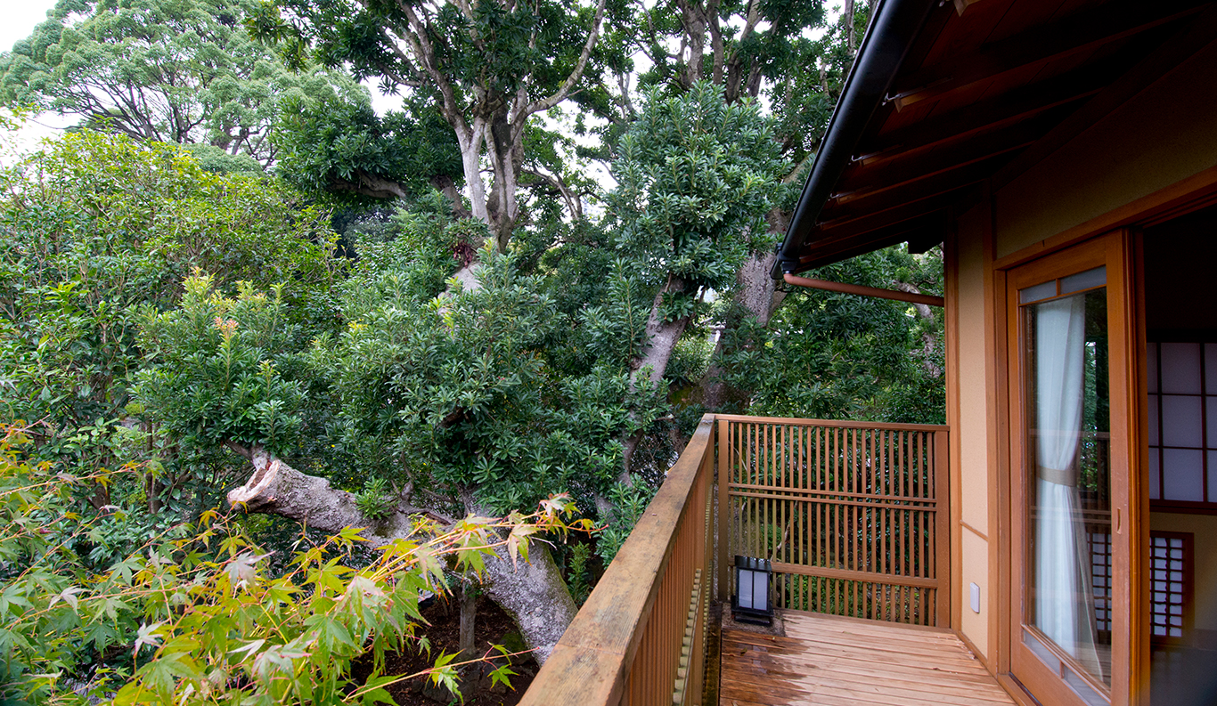 Zangyosoh has two private open-air baths available for guests to use freely. Simply flip the sign on the door to “Occupied” and go in. Towels and other amenities are already provided. Both baths are located up flights of stairs to provide the best possible views, one a leafy vista of the property’s signature red bayberry trees, the other an eastward ocean panorama only obstructed by a few picturesque sakura branches. For early risers, this perch is a sublime seat to watch the sunrise over the sparkling blue waters of Sagami Bay.