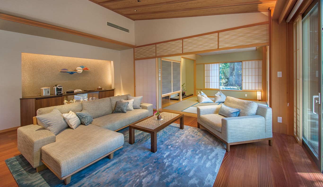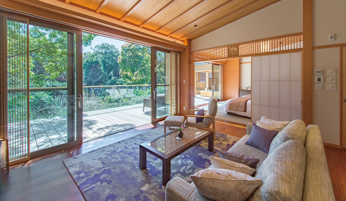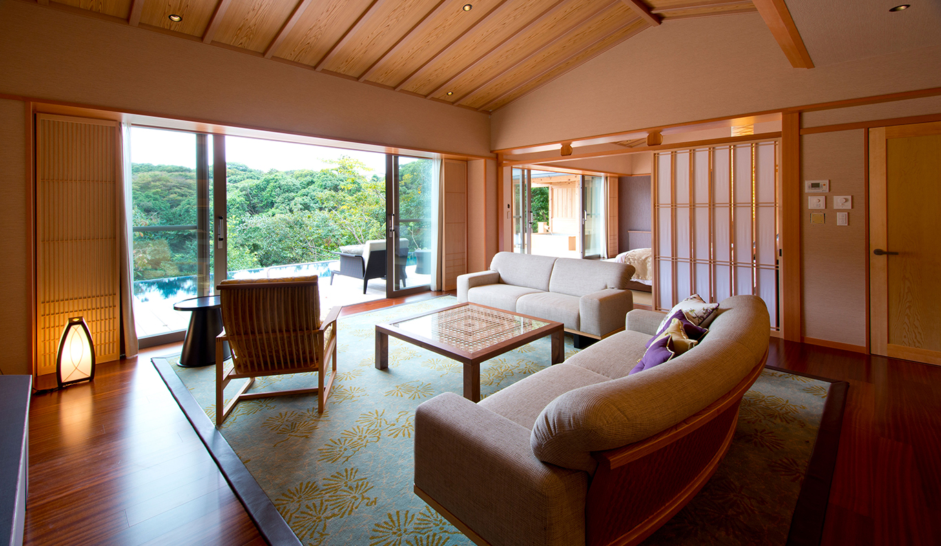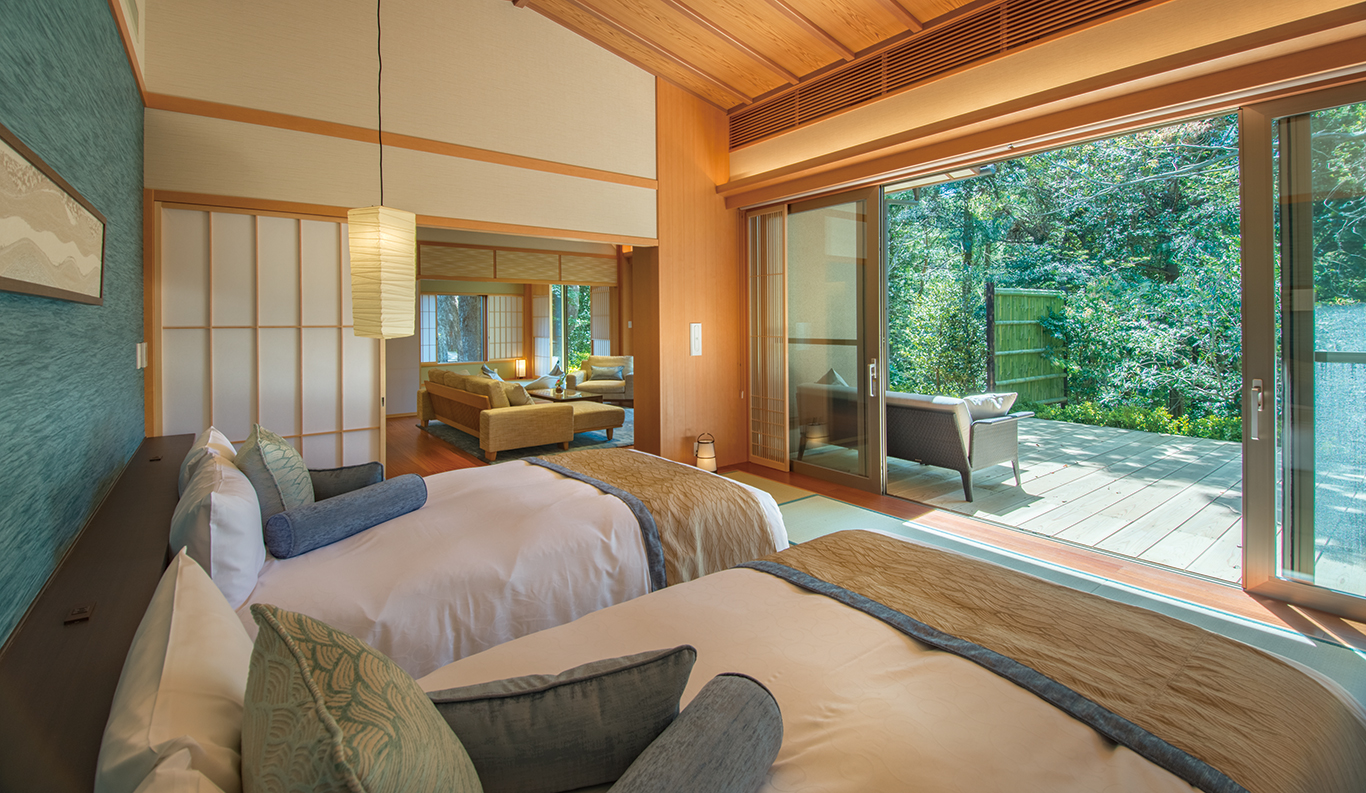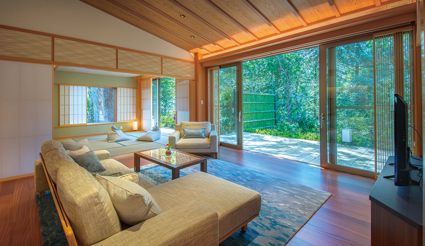 Located on a second-floor corner with floor-to-ceiling windows, this light-filled tatami-floored suite blends Western and Japanese elements for ultimate comfort. In the bedroom, washi-paper wall art suggests the peaceful seclusion of a bamboo grove, while the living area offers real-life views of the garden’s towering trees. As the surrounding nature morphs from summer’s verdant lushness to autumn’s riot of colors and back again, this suite provides an ever-changing perspective on Izu’s seasonal mood from a variety of comfortable nooks, including a half-size open-air bath, sunken kotatsu table, and a pair of temptingly overstuffed chaise longues.