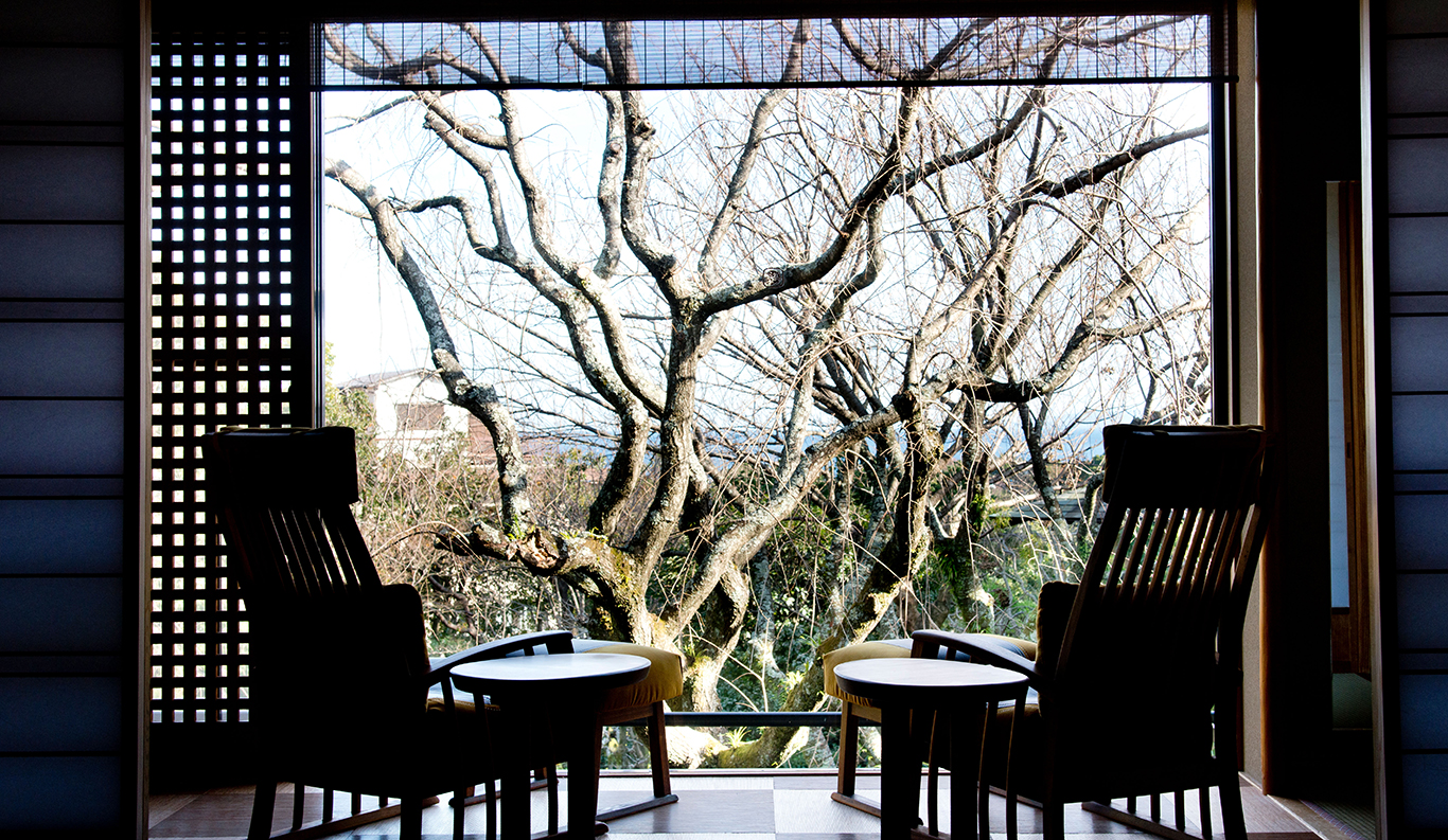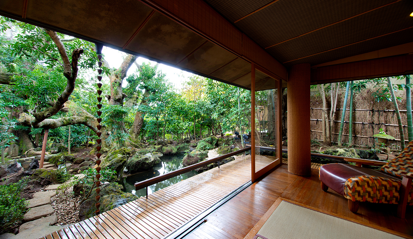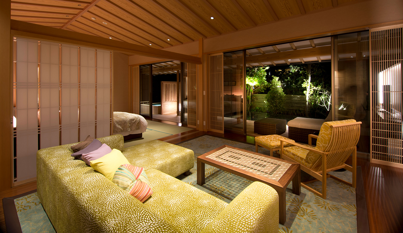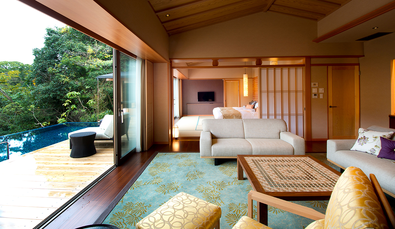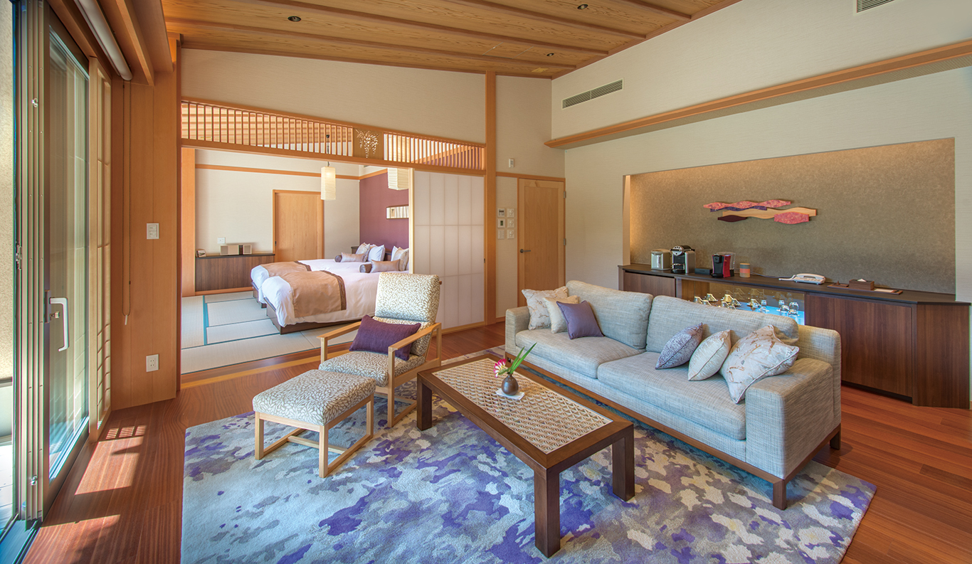 Located on a second-floor corner with floor-to-ceiling windows, this light-filled tatami-floored suite blends Western and Japanese elements for ultimate comfort. In the bedroom, washi-paper wall art suggests the peaceful seclusion of a bamboo grove, while the living area offers real-life views of the garden’s towering trees. As the surrounding nature morphs from summer’s verdant lushness to autumn’s riot of colors and back again, this suite provides an ever-changing perspective on Izu’s seasonal mood from a variety of comfortable nooks, including a half-size open-air bath, sunken kotatsu table, and a pair of temptingly overstuffed chaise longues.
