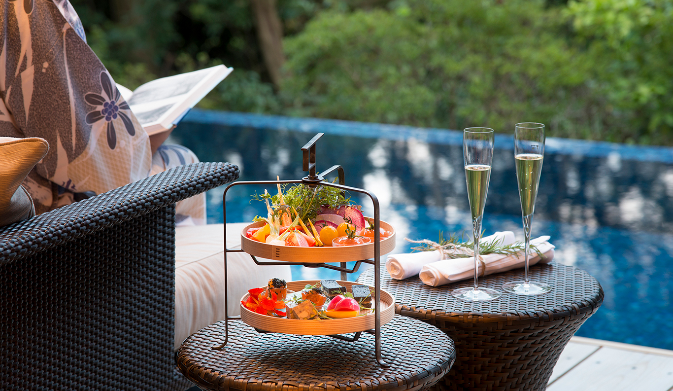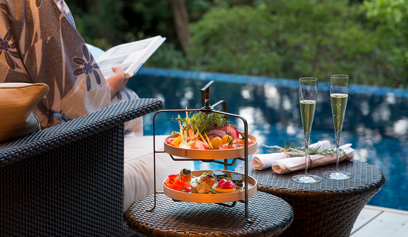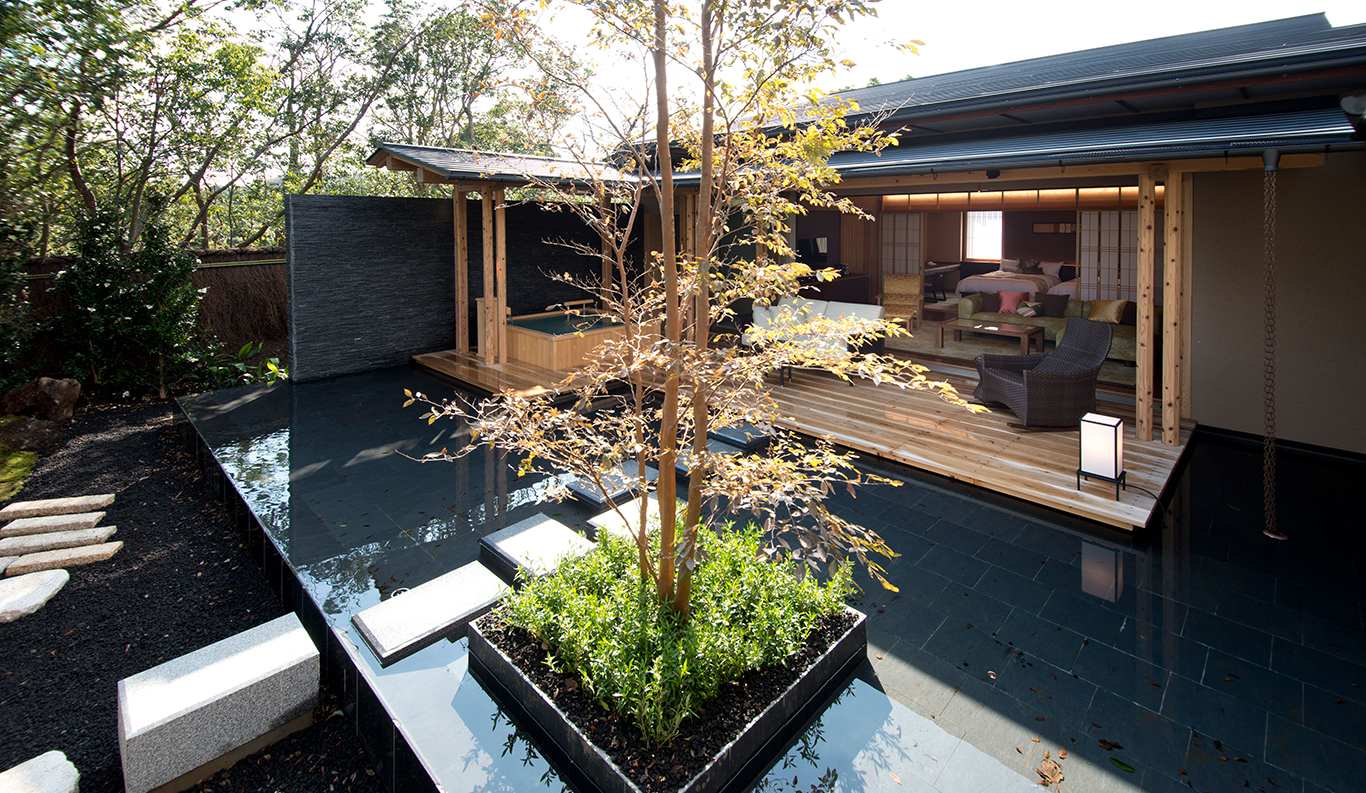 While each standard villa has a slightly different layout, all have an ample private lounge deck and hot spring bath, separate living and sleeping areas, and fully retractable glass doors to erase the boundary between indoors and out. With the slope of the land, some look out onto the treetops, with views filled by boughs of giant camphor laurels with shaggy green coats of symbiotic moss and ferns. Others have clever reflecting pools that bring the sky to your feet and cast dancing glimmers of light onto the forest backdrop. Cocooned in the fuzzy blankets provided for cool evenings, a cup of coffee in hand, many an hour can by whiled away on the deck, listening to the hot spring’s endless burble and marveling at Izu’s natural beauty.