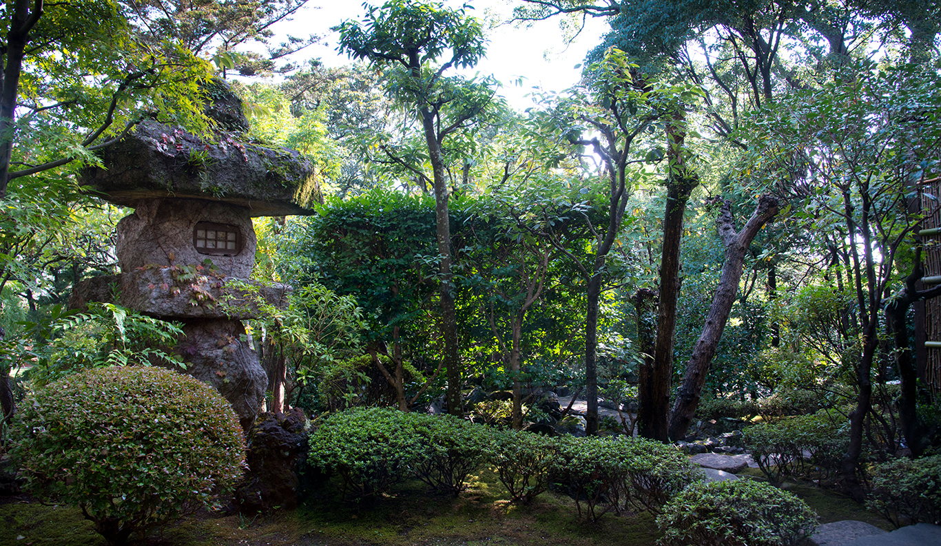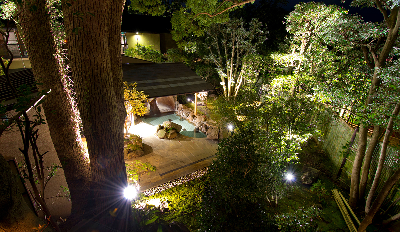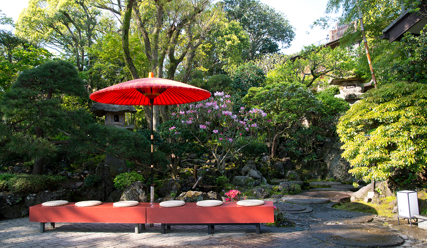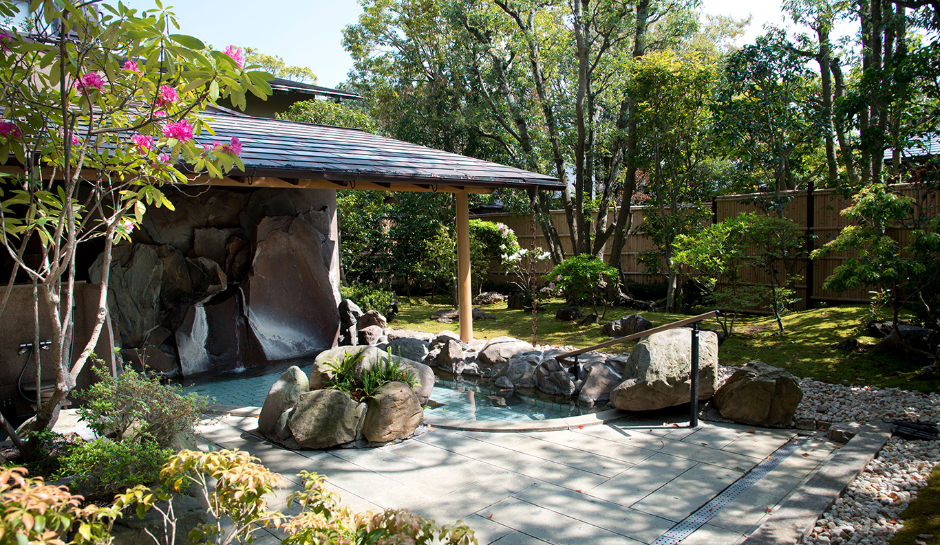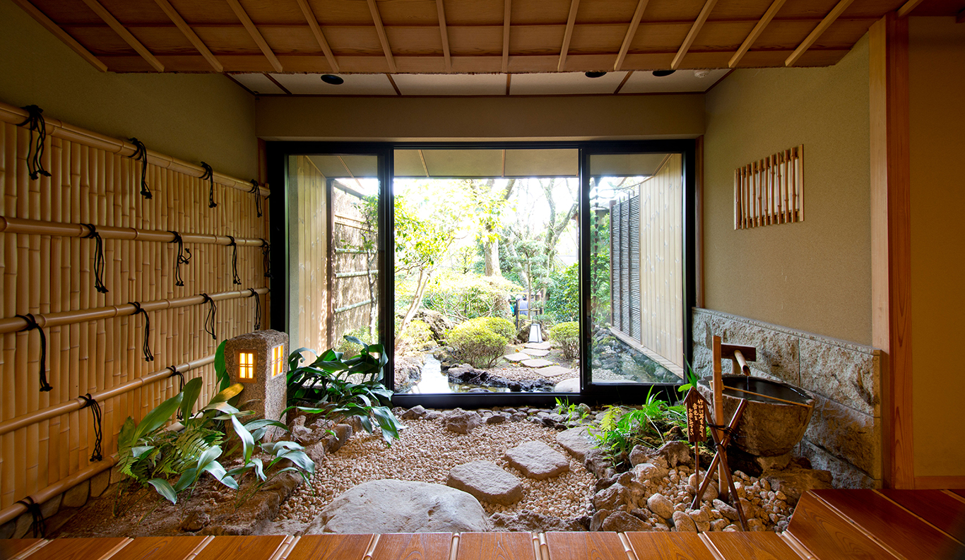 One of two outdoor baths, Hanabusa captures the old-school charm of the forest hot spring, with changing rooms open to the air and a stone-ringed pool amid an expansive garden. The hot spring flows down a wall of volcanic stone, a tinkling accompaniment to the chattering of sparrows and rustling of friendly gray squirrels in the trees. In season, azaleas and camellias add pops of color to the greenery, and the palette only intensifies in autumn. With your back to pleasantly textured stone and eyes to the passing clouds, a feeling of oneness with nature is serenely relaxing as the mineral-rich waters.
