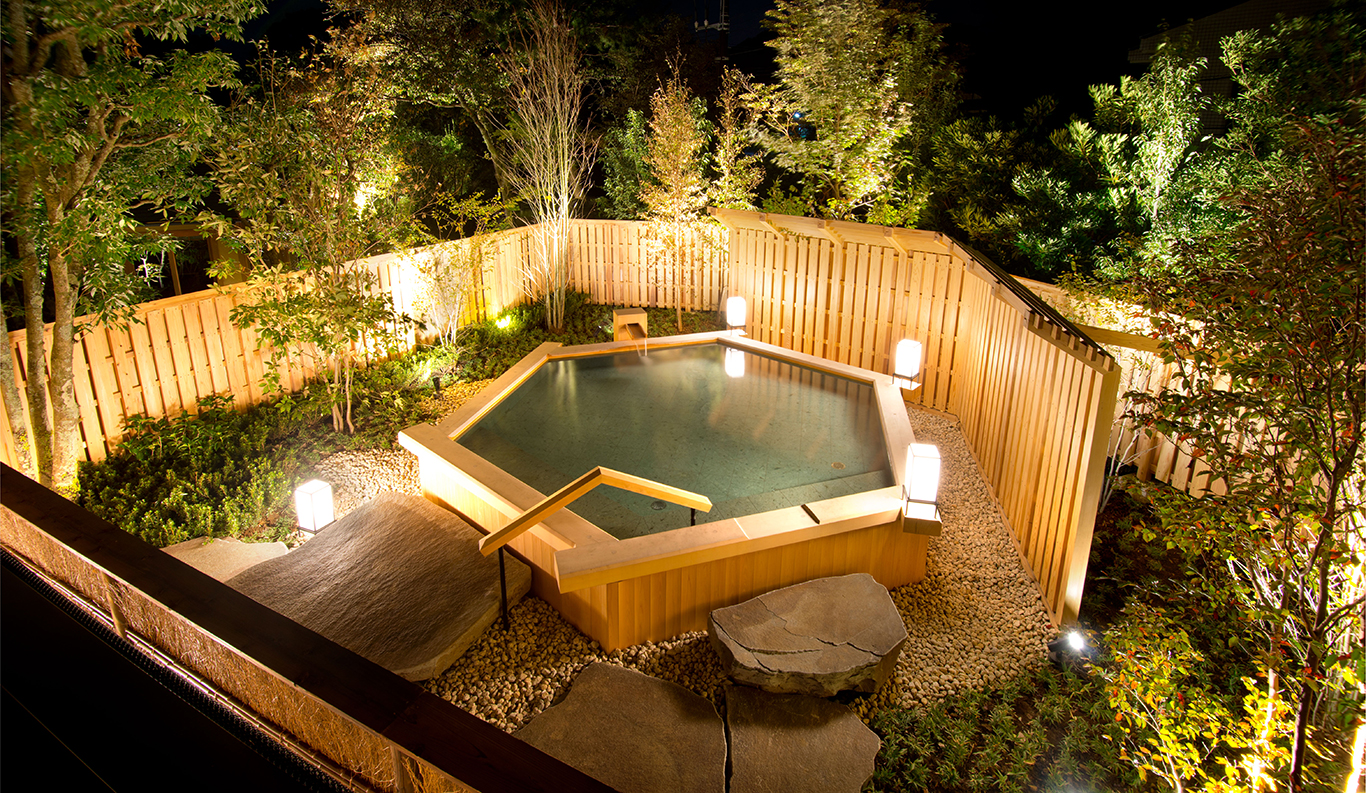 One of two outdoor hot spring baths, Aoi has an unusual hexagon shape, with mint-toned Izu ston…
