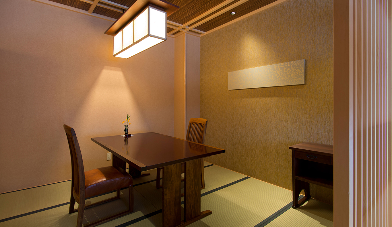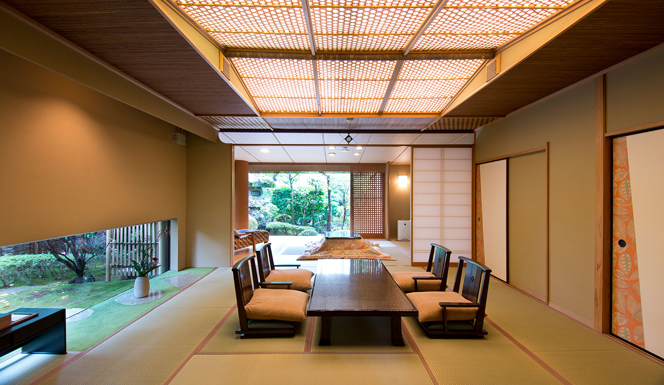 This first-floor tatami-floored suite exudes traditional elegance, ringed by a classic engawa deck and a mossy Japanese garden with a private koi pond. In summer, guests can open the rooms to the natural breeze and sit in the cooling shade of a centuries-old wax myrtle, while in the cooler months, the garden view is better appreciated from the warmth of the cozy sunken kotatsu table. An antique-style dressing table with triple mirrors adds a touch of early 20th-century charm and a relaxing spot to get prepared for dinner after a soak in the hinoki cypress bath. Two of this room type have traditional futon bedding, and three of this room type have Western beds equipped.