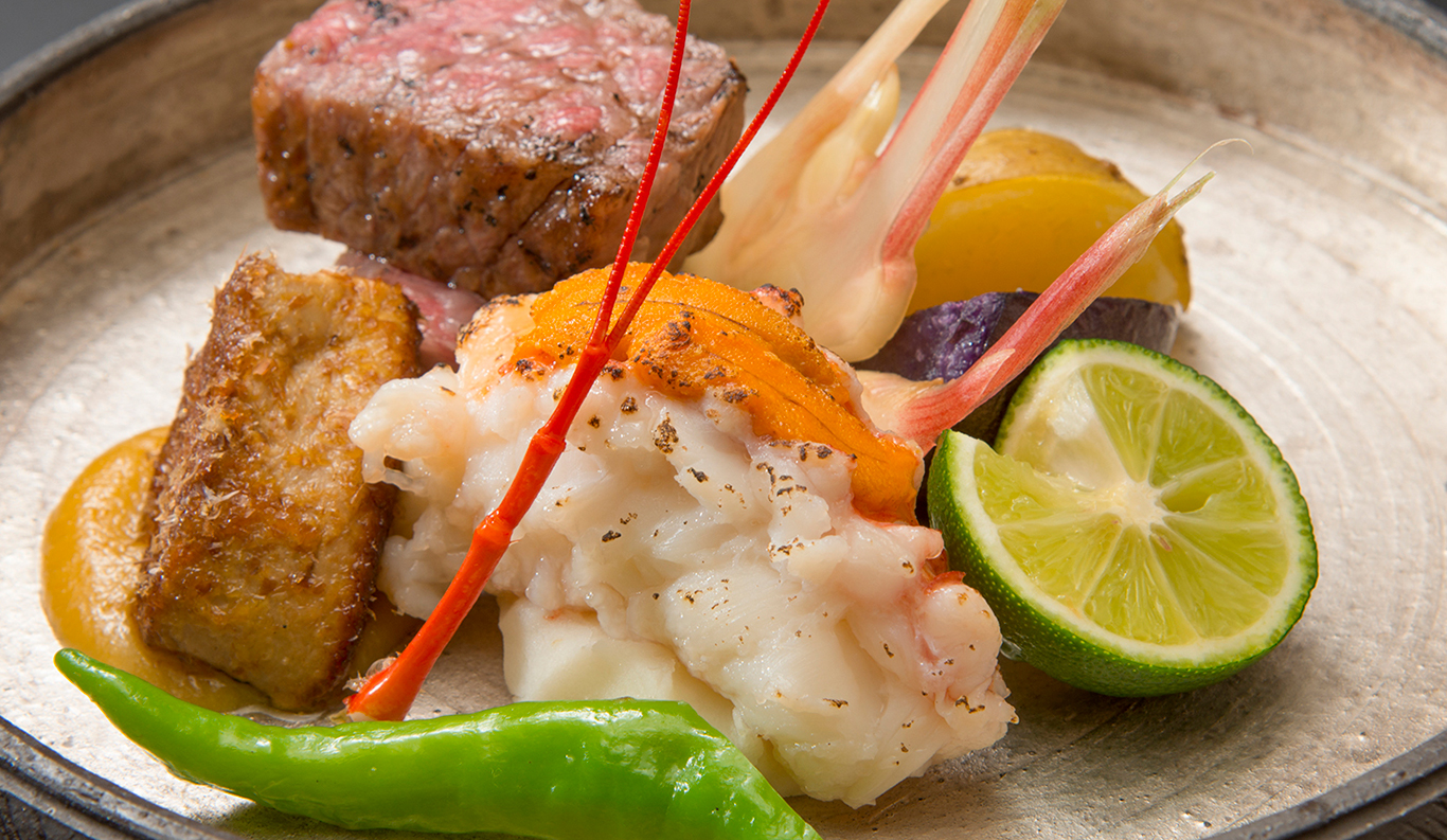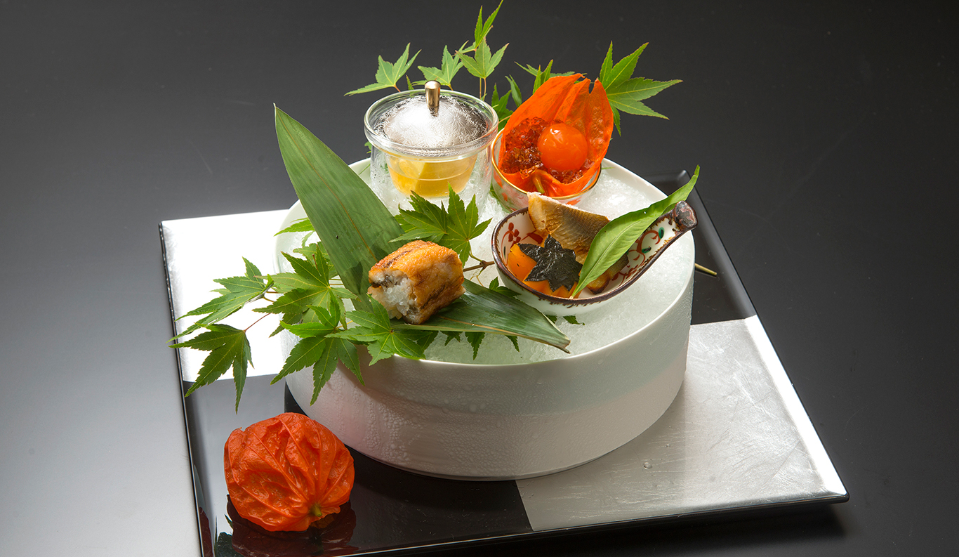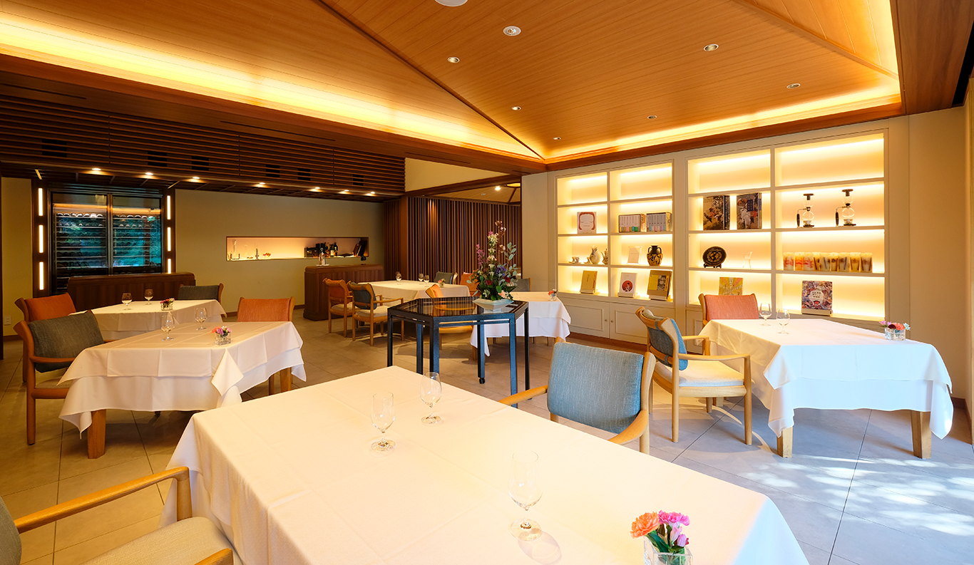 In a sunny space flowing seamlessly from heigh-ceilinged dining room to wide patio to grassy lawn, Chef Yamamoto explores the intersection of French cuisine and local fare, looking to craft meals with a deep connection to the land and sea that produced them. Using wild game like deer, pheasant, and boar, as well as the area’s famed seafood, Yamamoto finds commonality with the traditions and techniques of the auberge to make only-here, only-now courses of Japanese-inflected modern French. Wine pairings are naturally available, but the chef also nods to Shizuoka’s reputation as Japan’s foremost tea producer to offer custom blended tea pairings, either as standard brews or in cocktails. Yamamomo is the venue for the Western-style breakfast and is also open to the public for lunch.